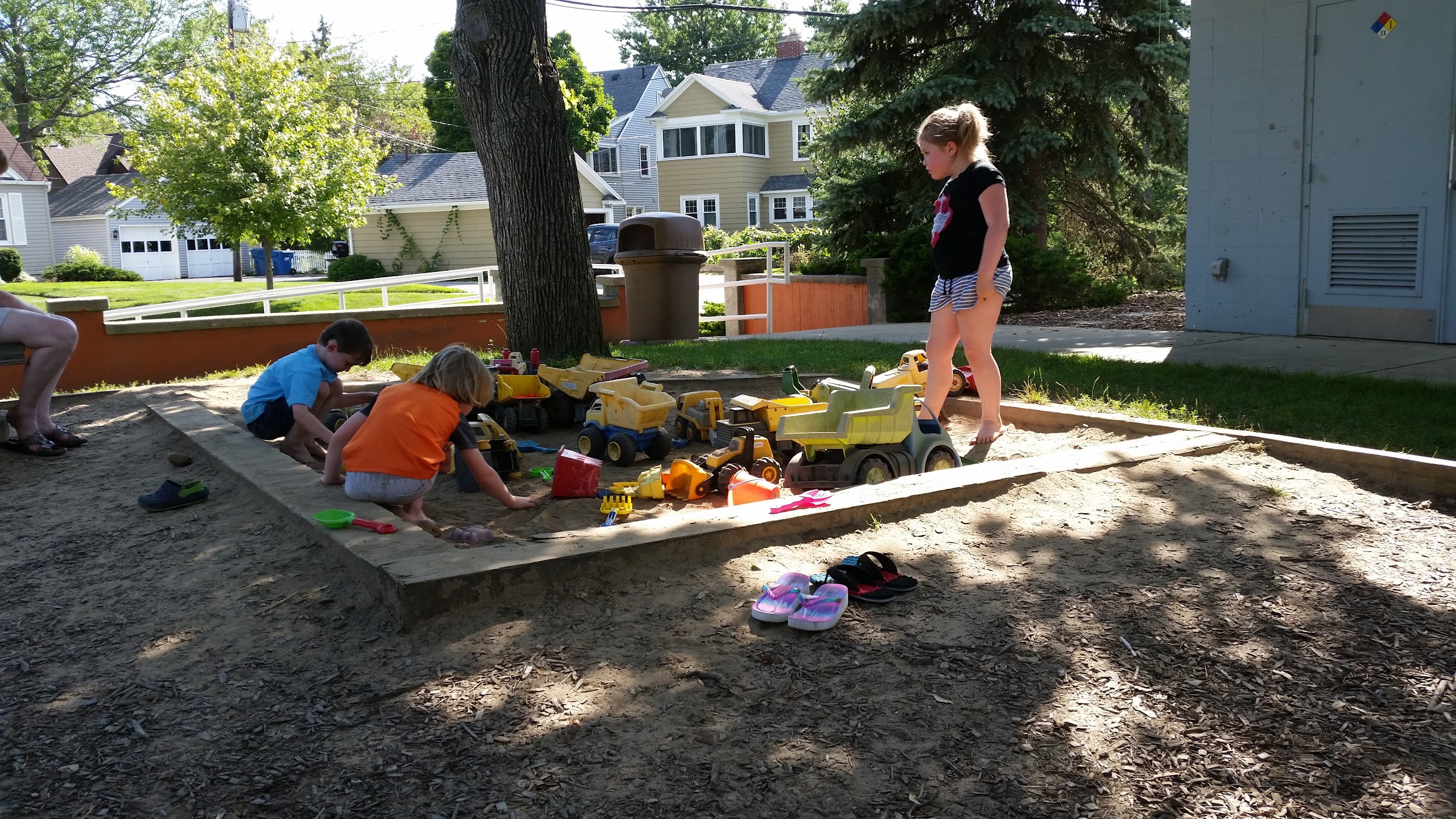 Seasonal outdoor public pool with a playground, a sandbox, and a concession stand.