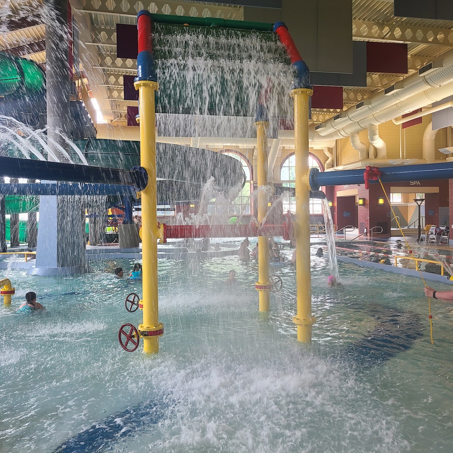 The Natatorium features three distinct pools: a 25-yard lap pool maintained at 80 degrees Fahrenheit, a warm water pool kept at a comfortable 90 degrees Fahrenheit, and a zero-entry leisure pool, complete with a play structure, set at 84 degrees Fahrenheit.