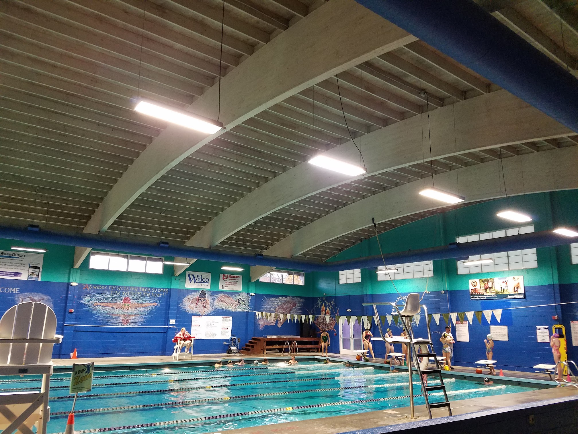 Upgraded public pool with lap swimming and swim lessons, plus a water slide and a rope swing.