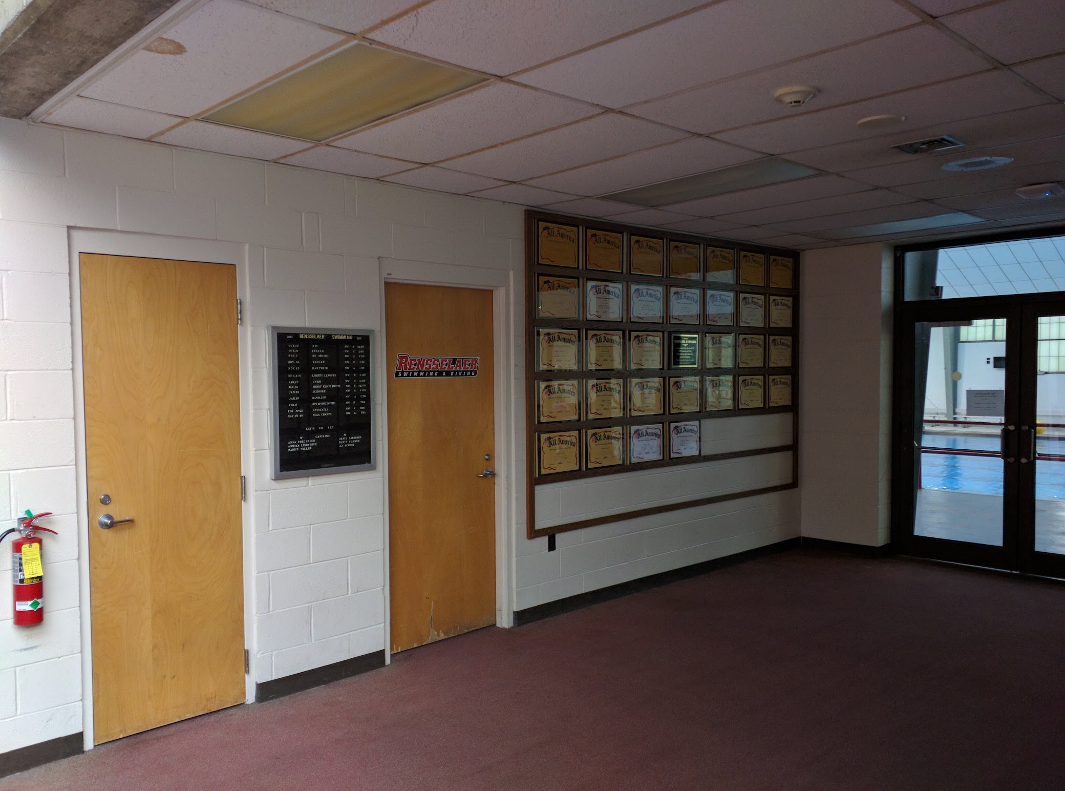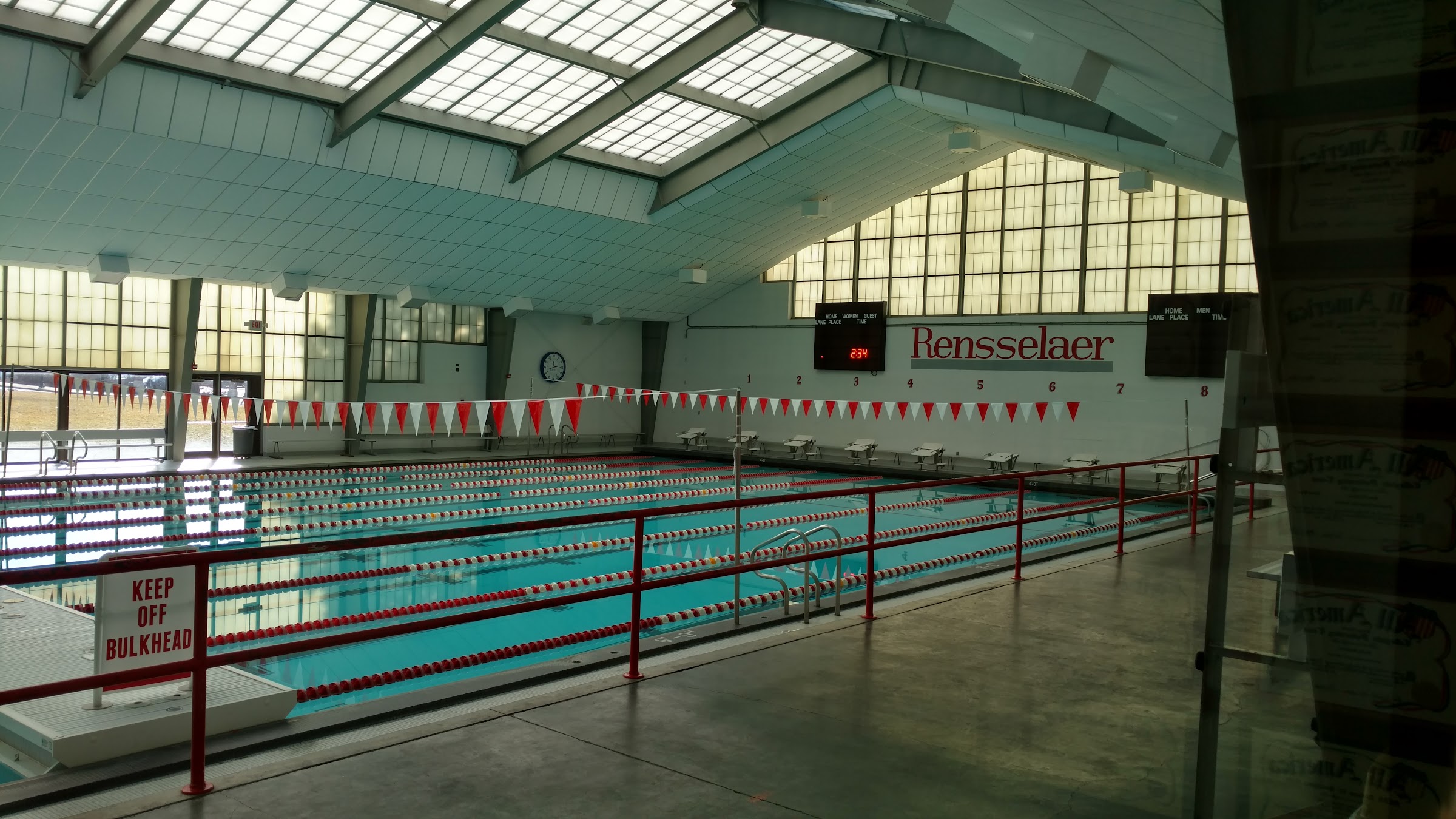 RPI Private Robison Pool, located at Rensselaer Polytechnic Institute in Troy, NY, is a 25-yard, six-lane indoor pool. It serves as the primary training and competition venue for RPI's men's and women's swimming and diving teams. The facility includes a separate diving well with one-meter and three-meter boards, spectator seating for 400, an adjacent whirlpool, and an outdoor patio. It supports varsity, club, and recreational swimming activities.