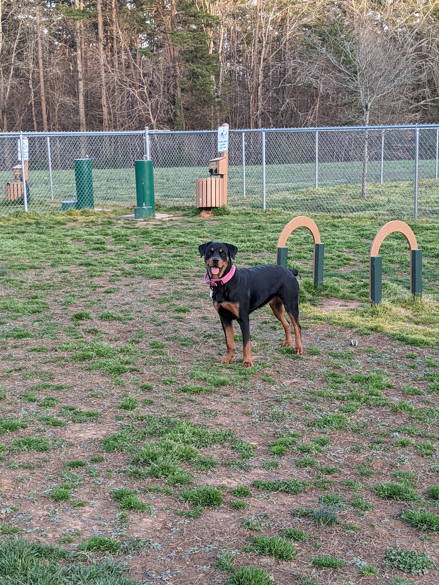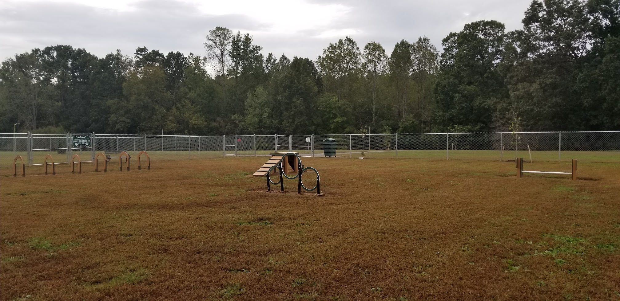 This is probably the nicest dog park I've ever been to. My dog absolutely loved exploring all of the cool agility setups that are here. The grass is well maintained. There is a disposal place for you to throw your dog waste in. There weren't any dog bags for waste but I always bring my own so I recommend bringing your own bags. there is a large dog section and a small dog section as well as a separate section for people to go out and work with training their dogs.the park also has a pool, tennis courts, picnic shelters, soccer fields, and trails to walk around on. It's very nice. When I went there was nobody else there but I felt safe I'm not sure about the atmosphere when other people are hanging out but it seems like an okay place for a single female to go. My dog gives it two paws up.