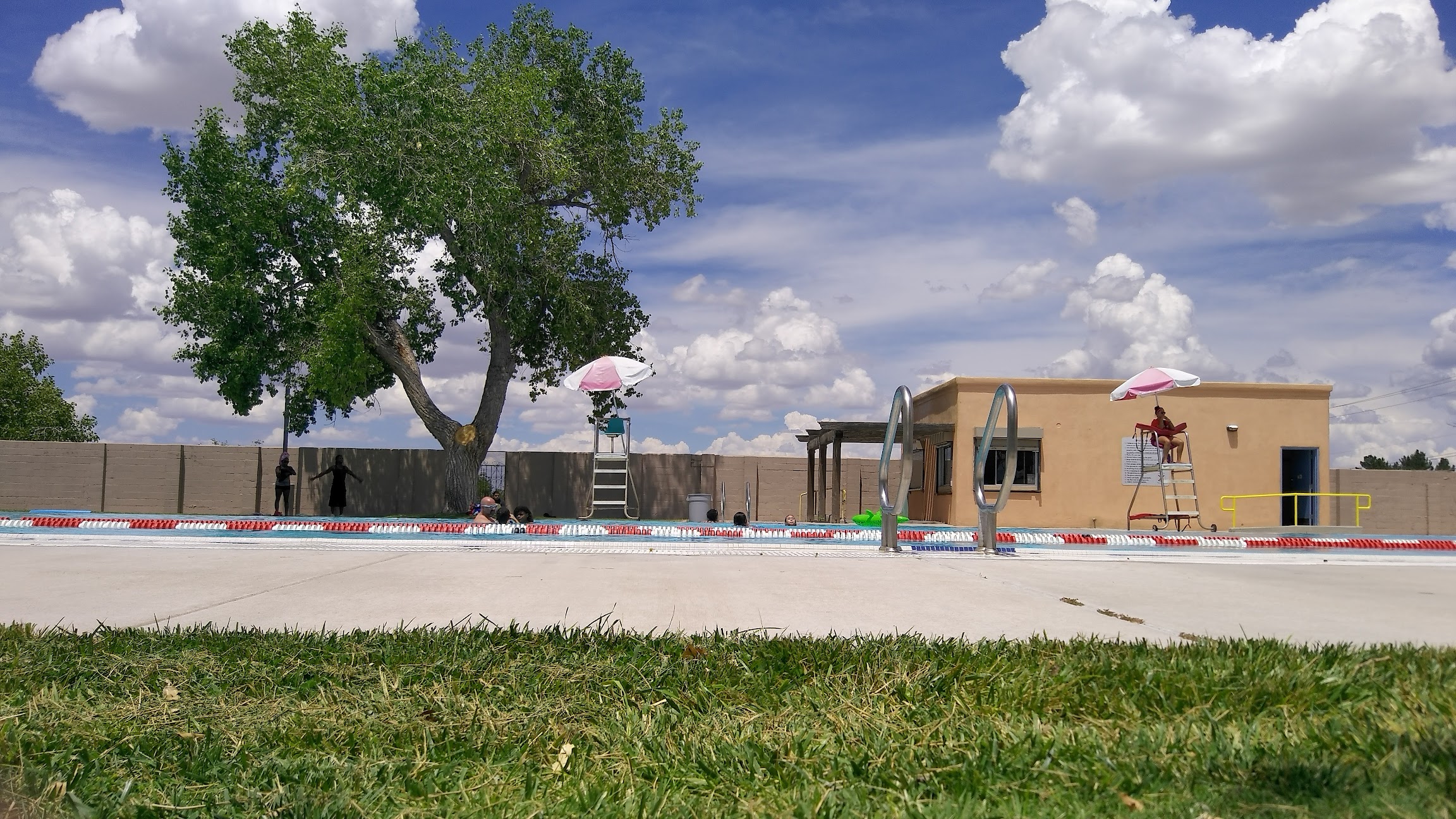 Grassy areas, shade trees, and a deep end offered at this public swimming pool.