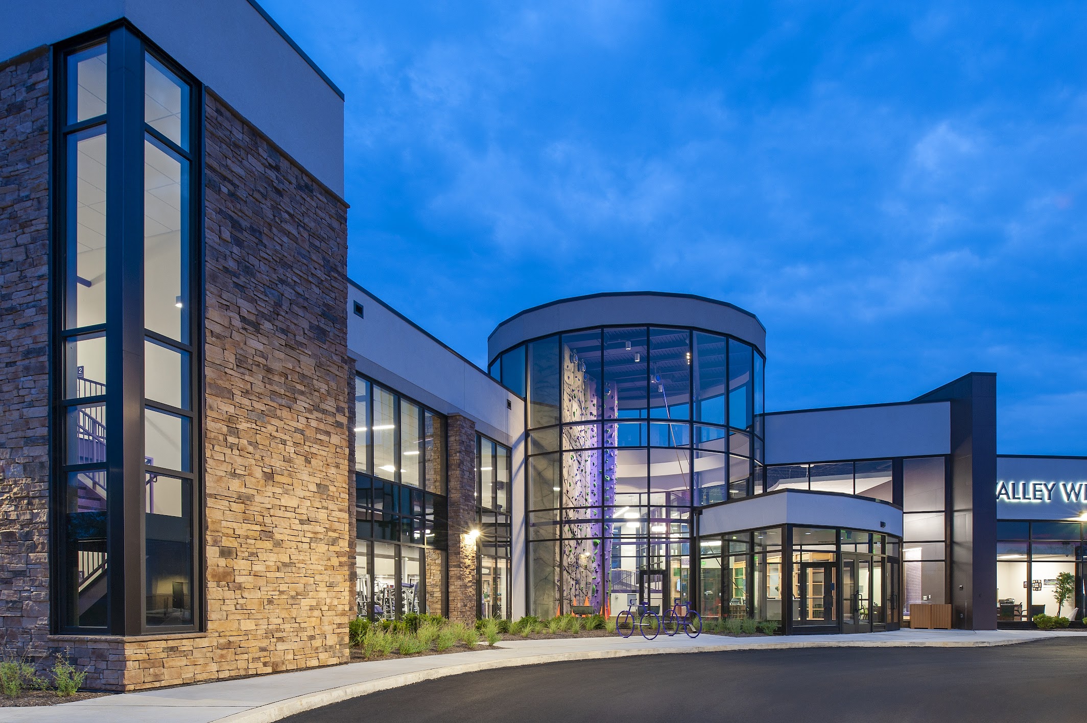 Health-focused gym with an outdoor pool, an indoor pool and a climbing wall.