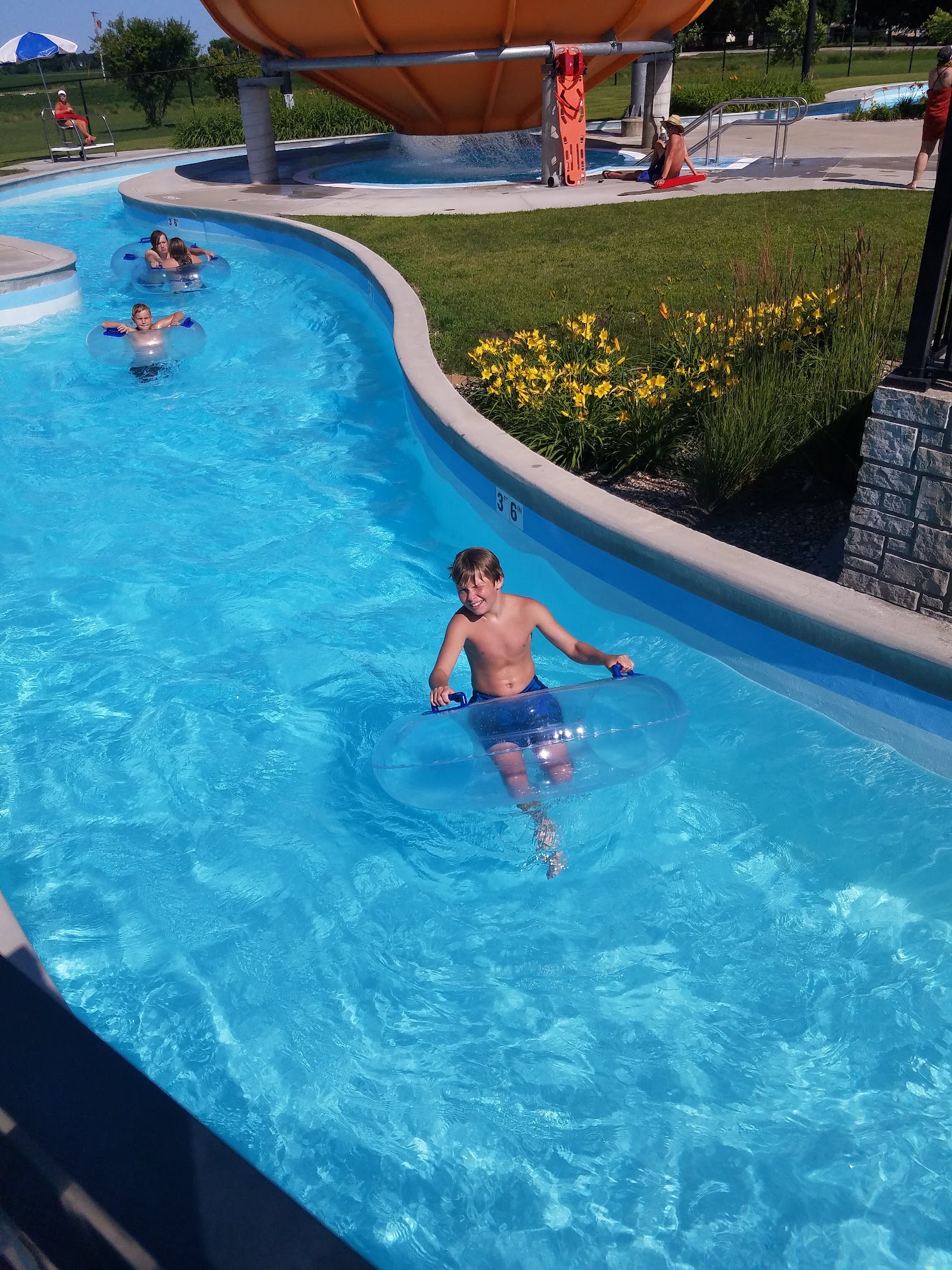 First off I just want you to be aware that this year due to lack of availability of lifeguards to employ they are not usually having the big slides open... BUT don't let that dissuade you from coming! The lazy river is open and the big pool area has a wide family slide that 4 at a time can go down together and is super fun and there are also water basketball hoops and diving boards. It is a really lovely aquatic center with plenty of pool space and acres of grassy areas with shade trees and you are welcome to bring your own beach chairs if you like, which is nice. The "kiddie" pool area with a gradual entry slope and lots of extra features for toddlers to grade school age is a very big space that anyone will enjoy. And it is inexpensive! $4 per person (since the big slides are closed) and if they do get more lifeguards hired then it will still only be $6! Open swimming is from 1:30 to 6:30 daily. I don't know where else you could spend 5 hours of fun for $4... Also, the concessions have treats starting at .50 for laffy taffy, a giant freezy pop is $1.25 and popcorn is $1.50. And they have other stuff to eat and drink. I just think this is a really good value for a relaxing day in the sun! Love it!