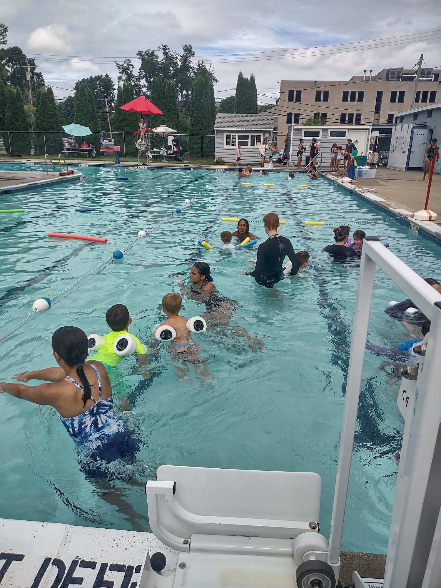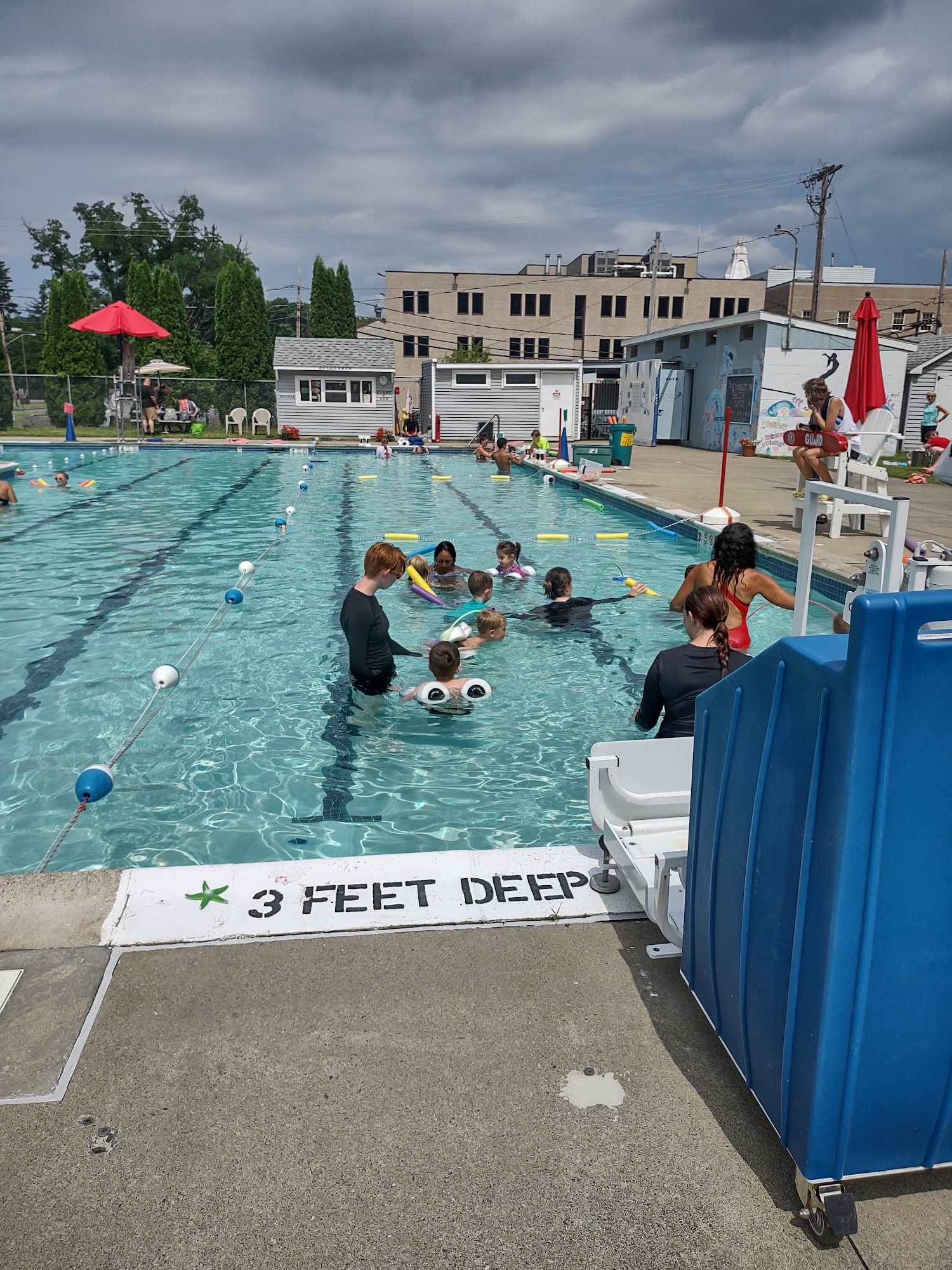 Excellent public pool, clean, life guards do enforce the rules and keep a close eye on everyone. The pool is a larger L shape with a smaller separate kiddie pool fenced off separate for safety. Plenty of seats most of the time, 4 plastic picnic tables, several plastic chairs, it is advised to bring foldable chairs of they are busy. Several parking lots provide ample parking as well. Open for public swim 1pm to 5pm, then 6pm to 8pm just about every day. They do offer swim classes and laps on separate hours.