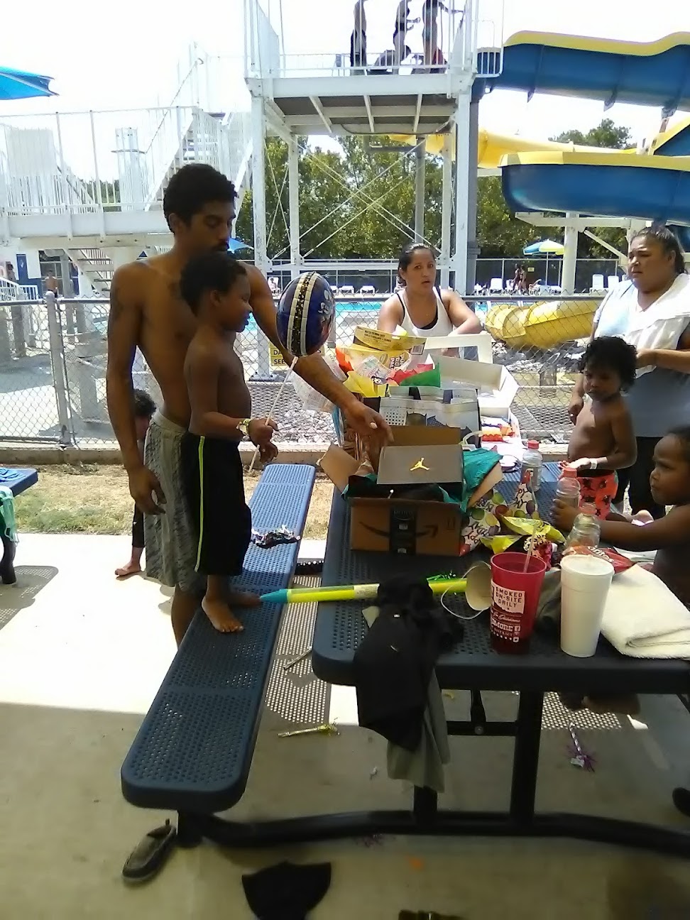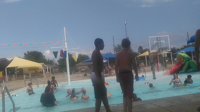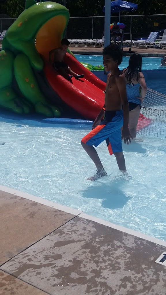 Nice pool....slides and a pool game ( basketball). They have a concession stand and nicely shaded areas with extended lawn chairs. The sitting area is covered by large umbrellas. There's a concession stand and showers for swimmers. The one drawback for kids....is, they hold "adult swim time only" I believe each hour. In my opinion it's like built-in breaks for the lifeguards. They have several on duty(that's a good thing). This adult swim time requires ALL KIDS to exit the pool.