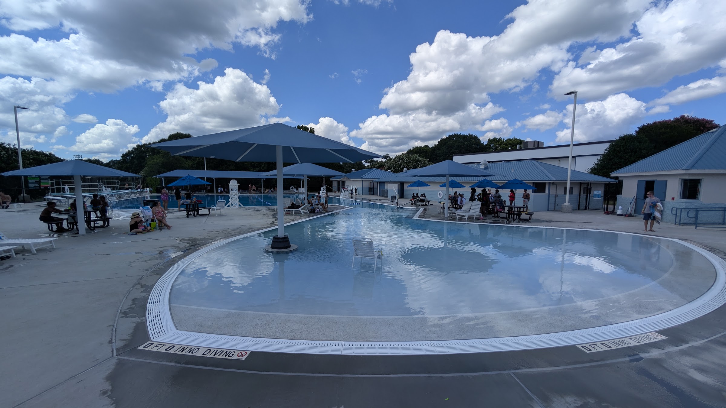 Very nice public pool. They have a zero entry slope for the young ones to get in, and the pool travels along the way to a set of two spring boards into a 12ft deep diving well. The pool was recently renovated and is brand new. It was a very comfortable pool to play around at. The lifeguard crew has the young ones take a swim test in the deep end of the pool if they want to participate jumping off the boards. The test was simple for both of my boys, one being a brand new swimmer this summer. The guard wants to test if you can swim across the pool without aid and if you can tread water for 30 seconds. I would definitely visit this pool again based on the size of the deck seating and the deep swimming well with the diving boards. I also found that if you arrive when the pool opens it is packed tight with people trying to pay and get in. So I often wait about 30 minutes after before arriving. The Adult swim option is a bummer for those who don't have kids, I on the other hand love that I can give my kids a quick snack and take a break from watching them in the pool.