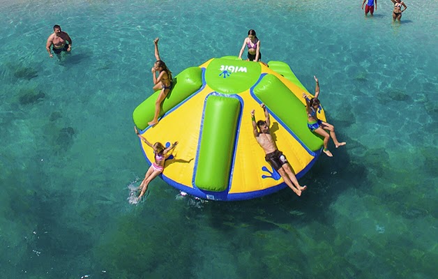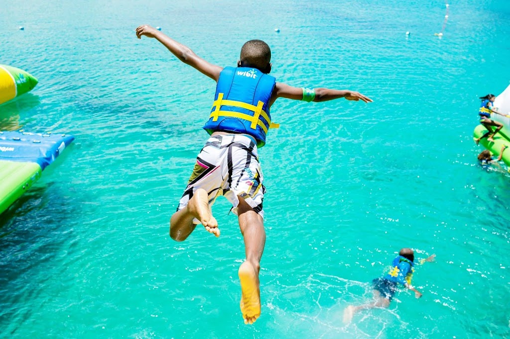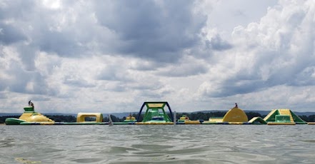 Inflatable water park offering slides, climbing, and other activities, plus life jackets and lifeguards.