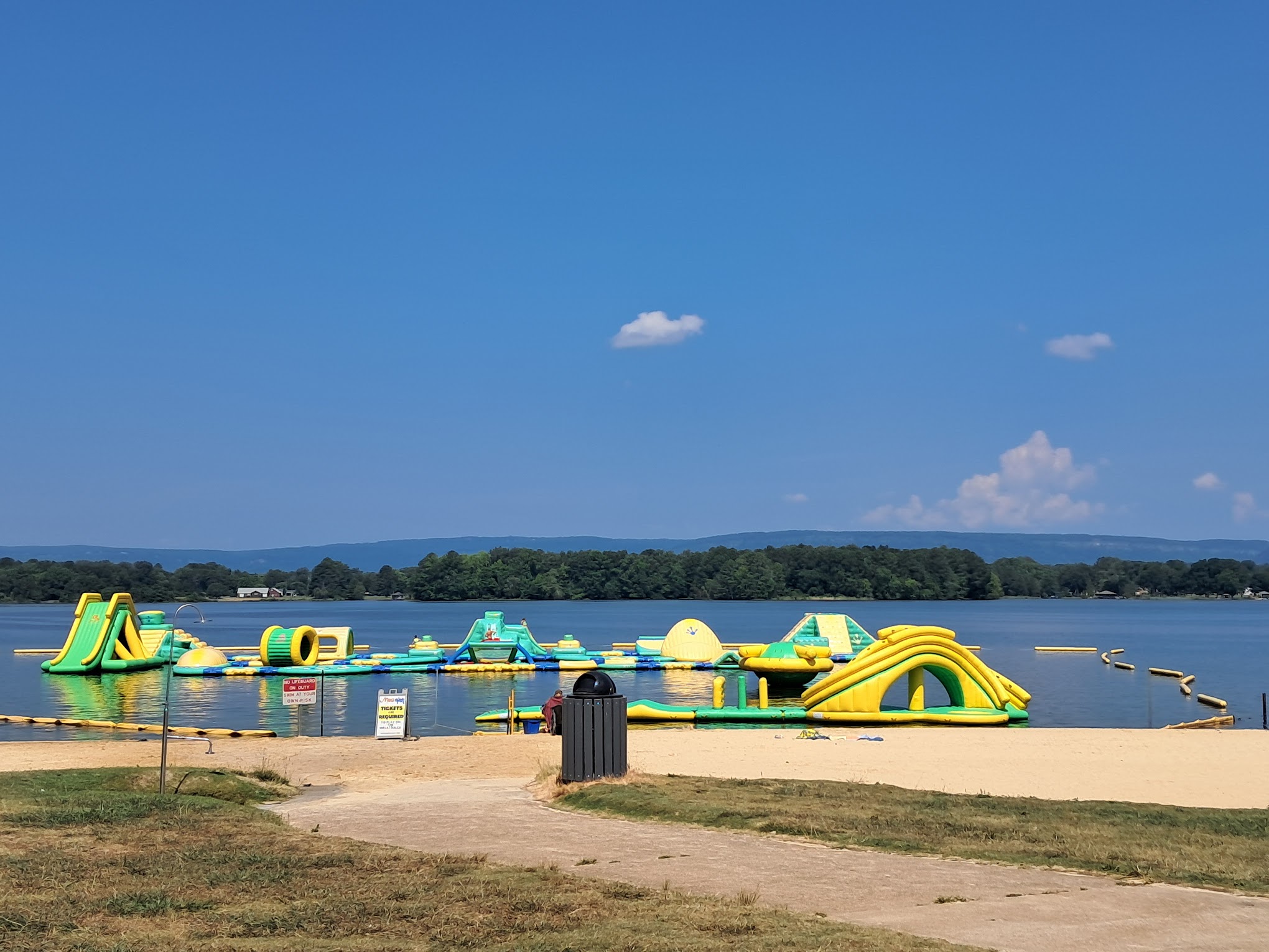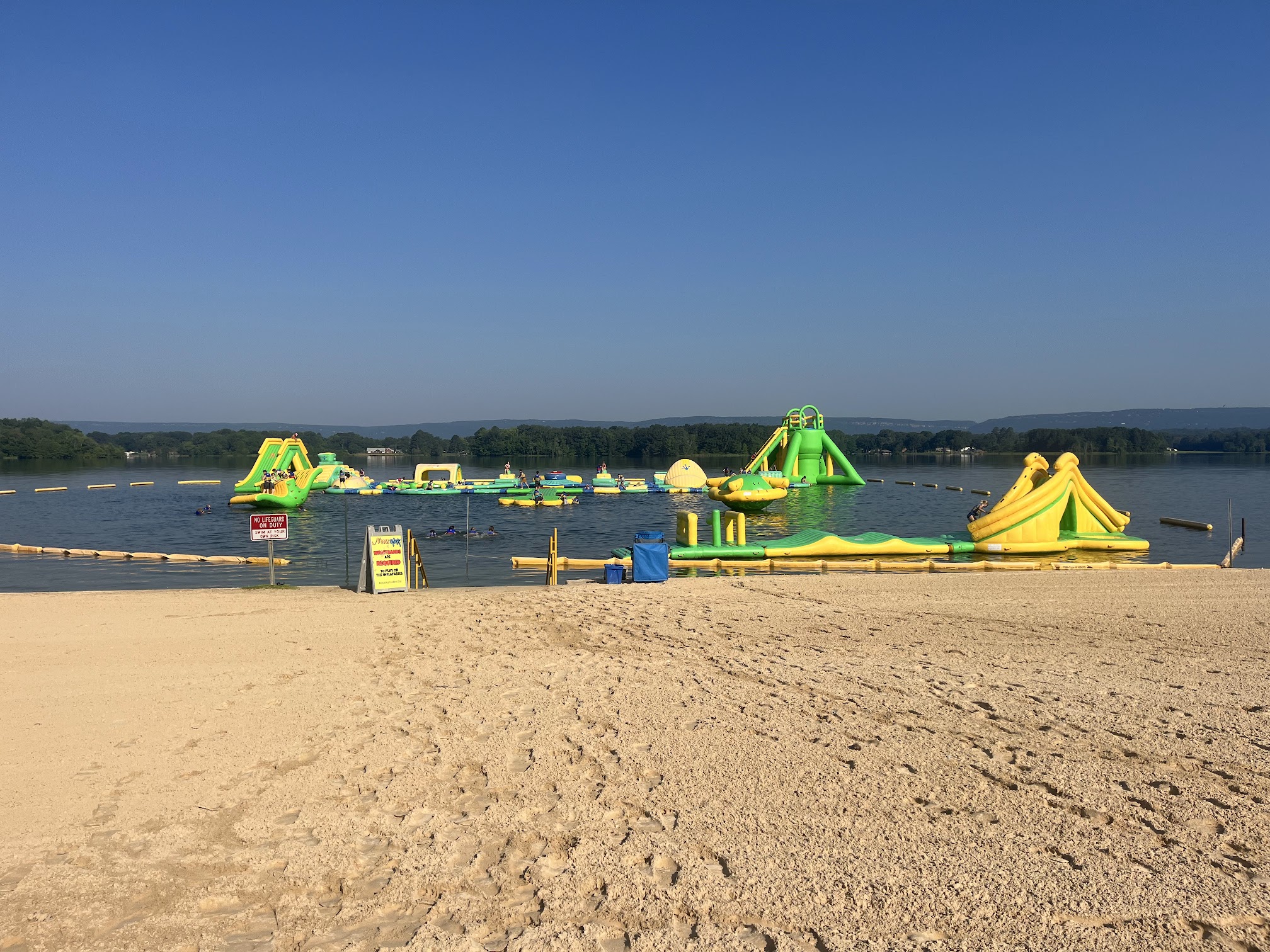 Disappointed so far this year. The pad was extremely underinflated, causing it to sink in areas. The lifeguards seem uninterested in doing their job, preferring to hang out together. I even overheard two of the girls yelling, asking one of the boys if he had a girlfriend. It feels like hangout time for them instead of work. Updated to add more: My wife went to the counter to let the staff know the inflatable needed to be blown up. They replied that they didn't have the blower and would have to wait until the next day. However, after I wrote this review, they miraculously found a blower. My kids mentioned that the staff didn’t actually try to inflate it; instead, they were just messing around. One lifeguard was even jumping on it instead of helping. The staff needs improvement. I noticed the female staff members were sunbathing instead of watching the area. When my daughter fell and hurt her back, a lifeguard ignored her cries for help and ran past her. Thankfully, some other customers assisted her. Safety should be the top priority.