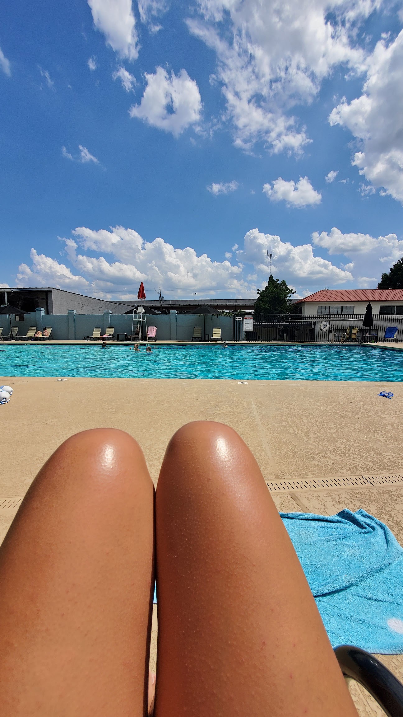 Great pool. Plenty of reclining chairs and tables with umbrellas. Driving board at 10ft.