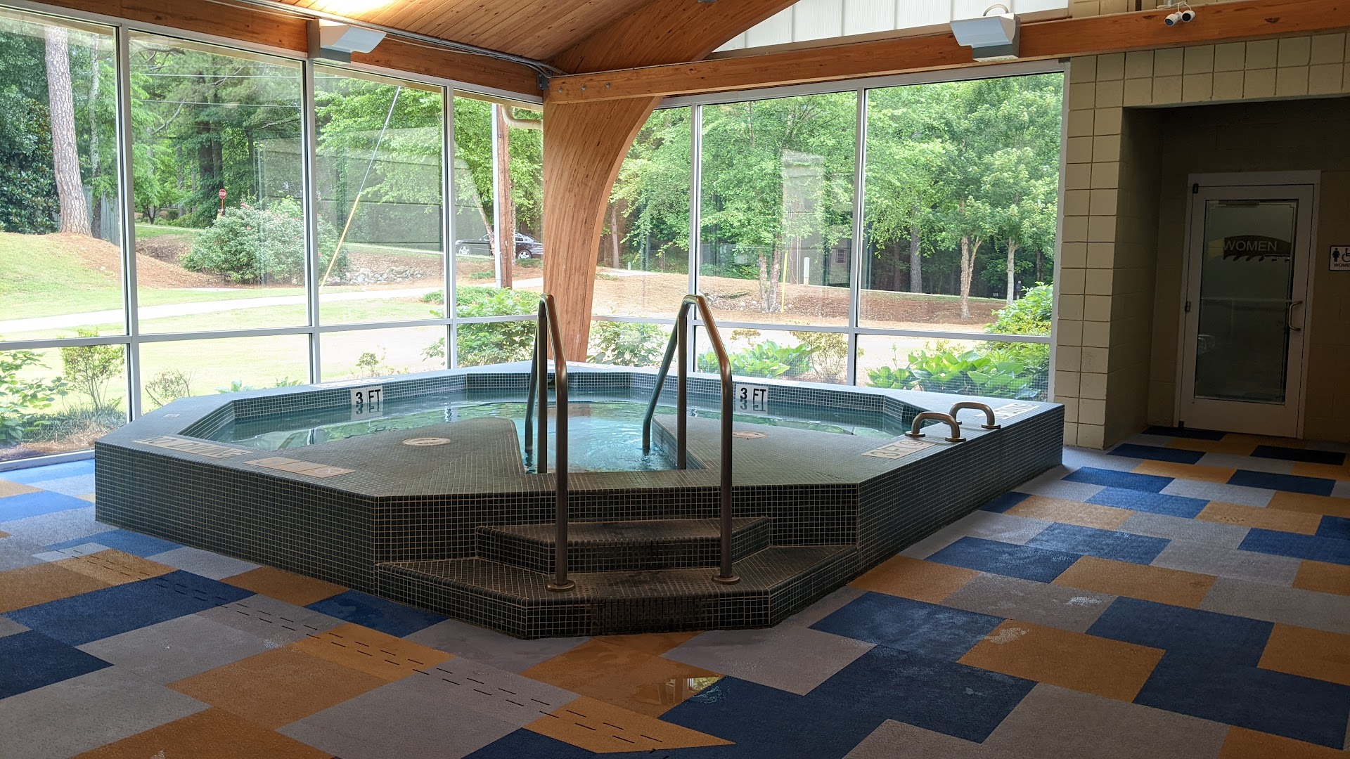 Indoor facility with a warm-water pool, hot tub, and water aerobics classes.