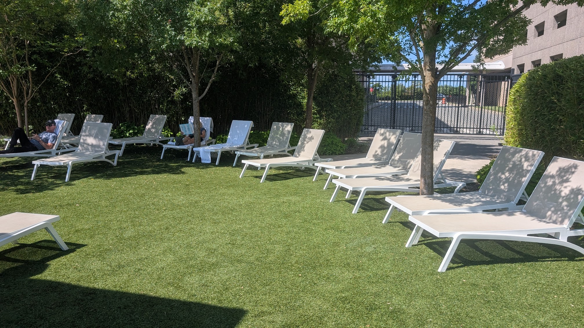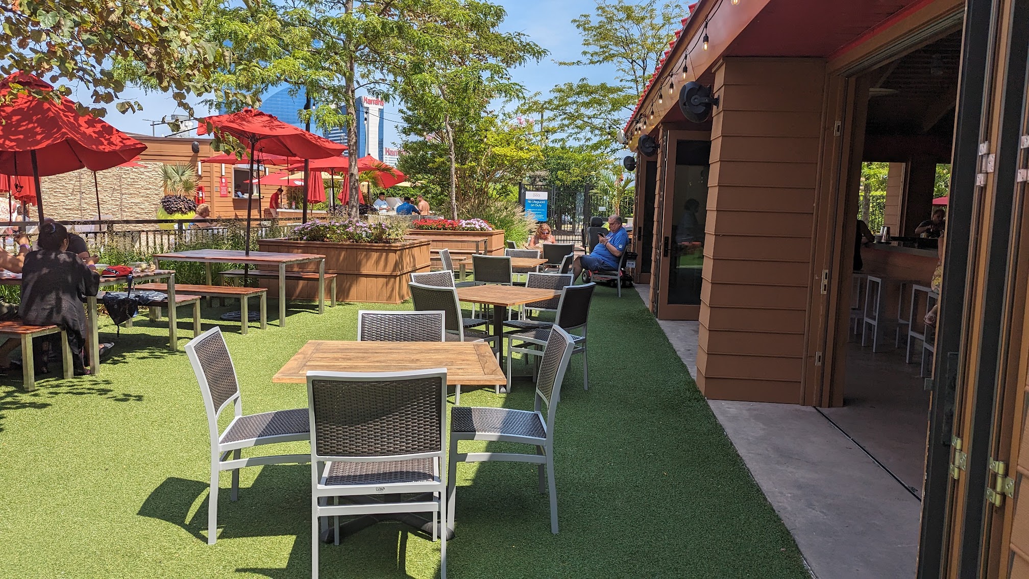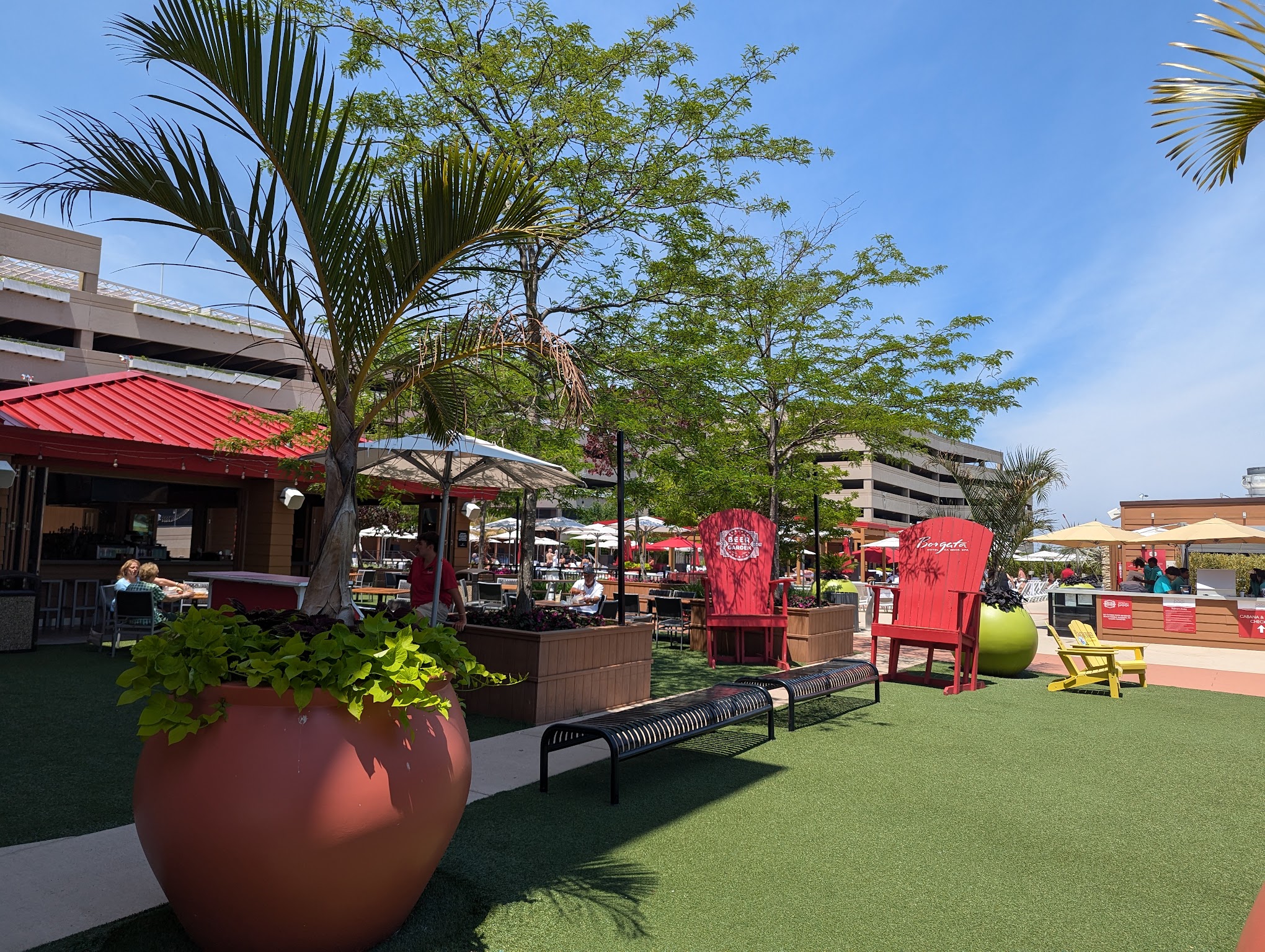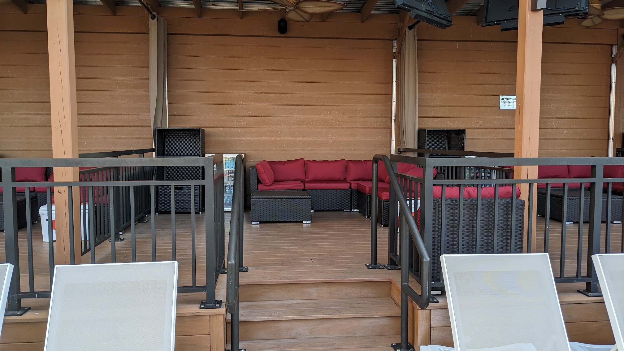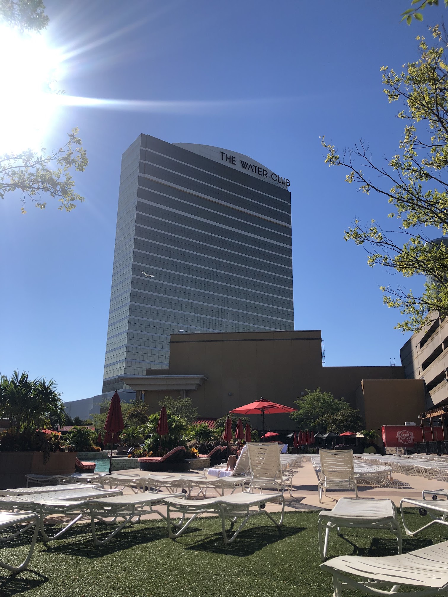 This is one of the best things MGM has done for Borgata. I like the MGM Tower pool to relax for a short time or when I also want to get into a hot tub. The Borgata Outdoor pool has a lot more chairs, umbrellas and it’s a much larger pool. It’s also attached to the Beer Garden. Both pools get busy early on weekends. I like keeping out of the sun so arriving early allows me to get an umbrella before they are all taken. Sometimes we take a chair in the back corner where there is artificial grass and a few trees giving shade but are taken early. You can’t bring any food or drinks into the pool area but can bring in an insulated cup like a Yeti. They have ice and a water cooler. After laying around for a while my wife and I will get into the pool. The pool has benches style seating all around the edge of the pool and you can always find sun or shade as you relax in the pool. After the pool we like to have lunch at our lounge chairs. You can also go to the Beer Garden to have drinks, food or play some games. We like their grilled chicken sandwich, salad and sometimes we order french fries.