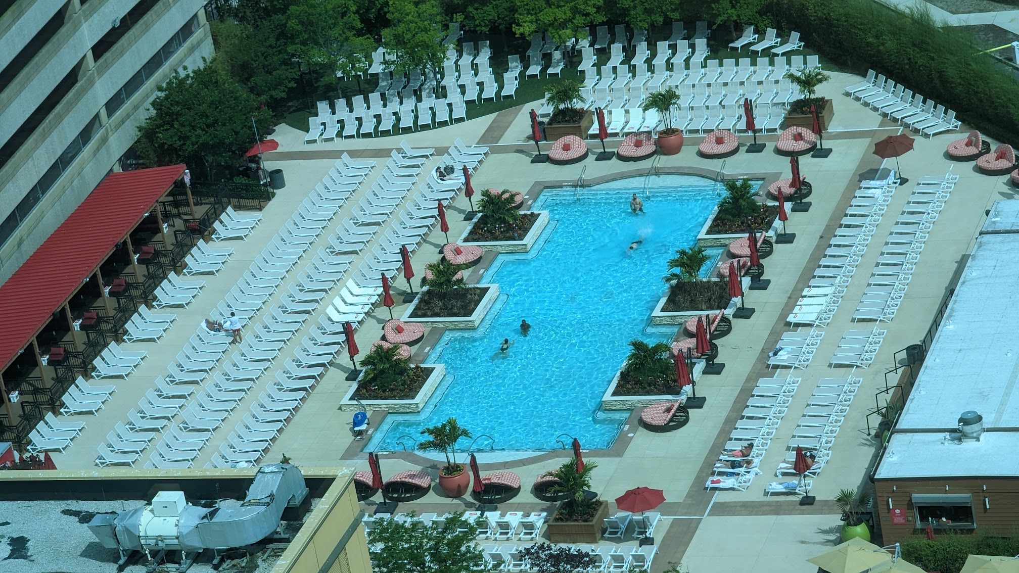Experience at this pool has declined. Music is blasting from all angles. They play high pitched sounds to curb birds from landing, that is audible by humans. Can't bring water or coffee in and you cant even order a coffee inside.