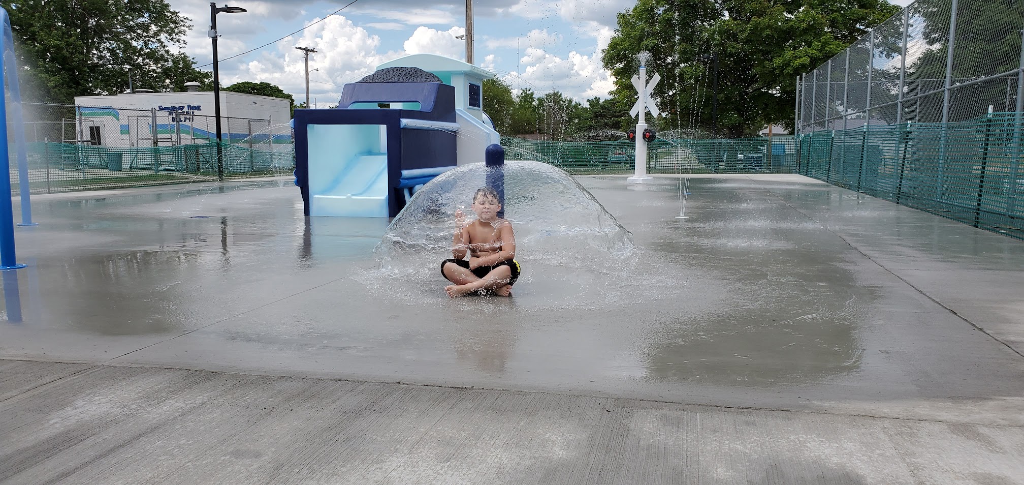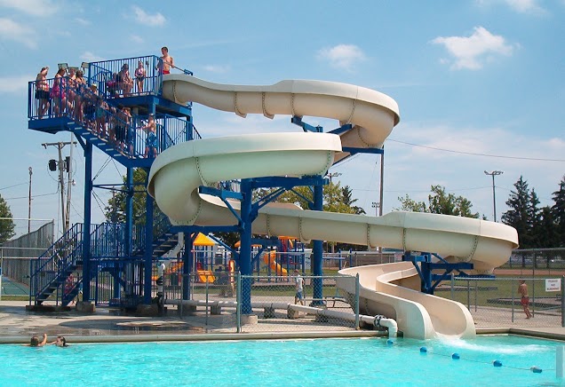 Outdoor pool with slides plus a splash pad section for kids in a local park.