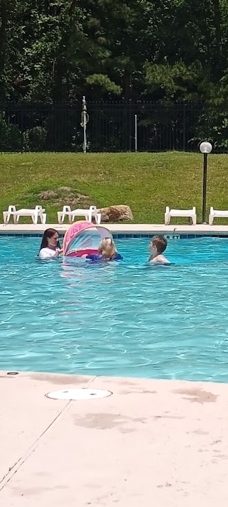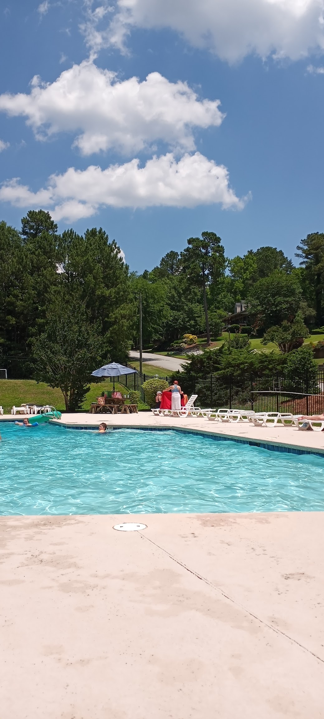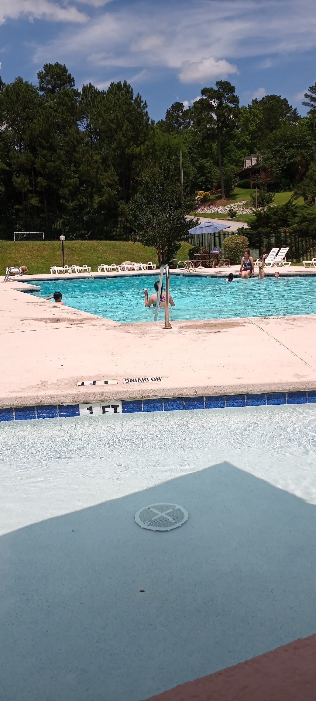 Here from Ohio visiting our daughter, son-in-law, and grandkids. Taking advantage of this nice private neighborhood pool during a 90°+ hot spell. Very nice, clean facility with a good parking lot, kids gated play area, baby pool, lounge chairs, picnic tables w/umbrellas, a picnic shelter w/tables and chairs, and also restrooms. All this surrounded by a good strong decorative fence and a gate with a key card locking system. A very reasonable annual fee per household for such a pleasant place to relax and or whatever. 😎