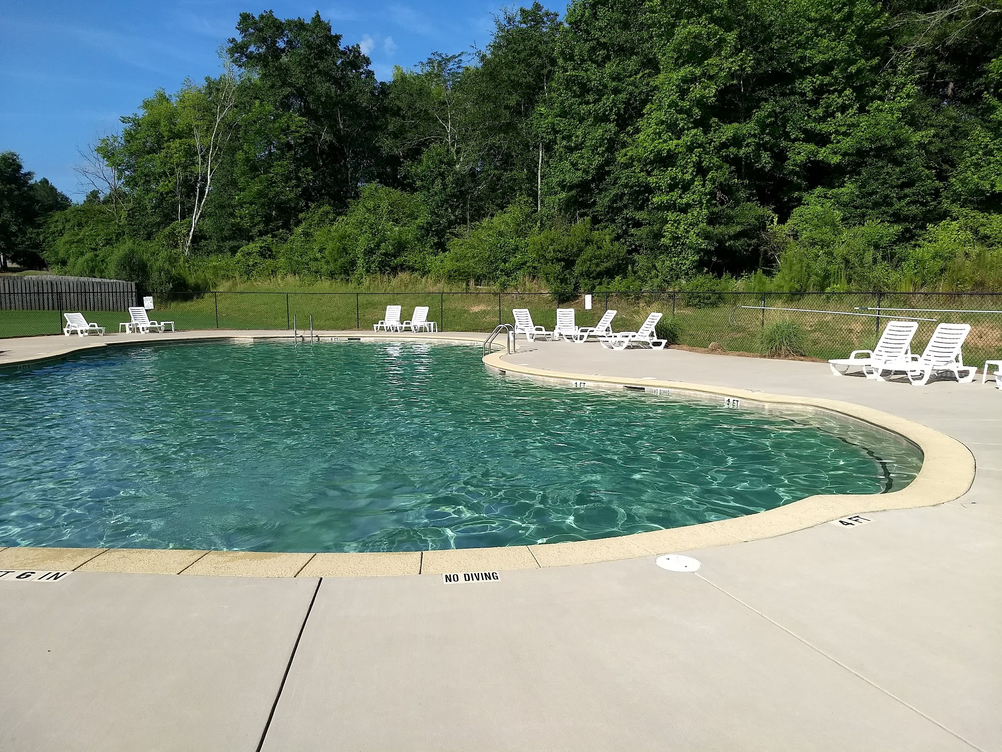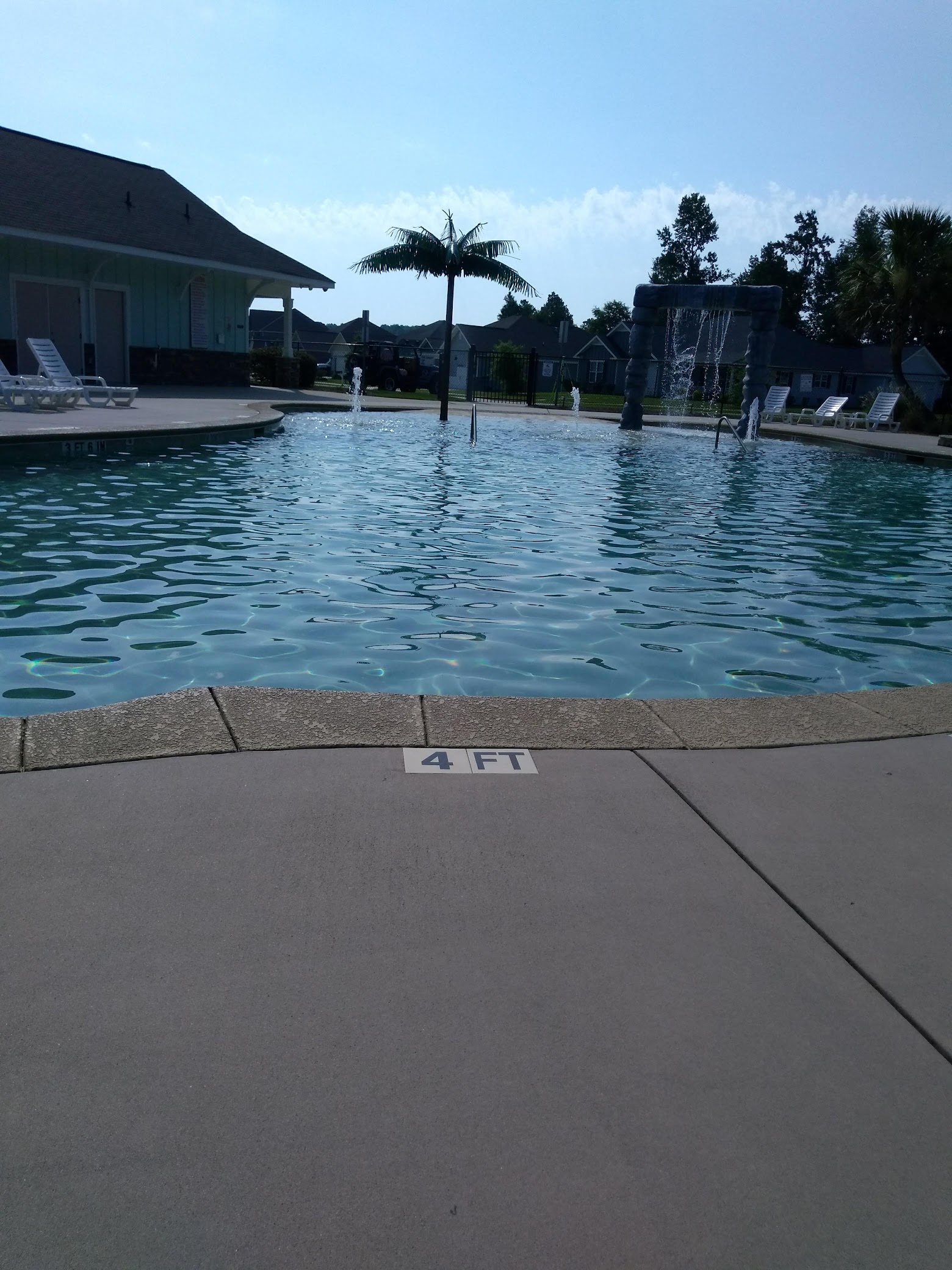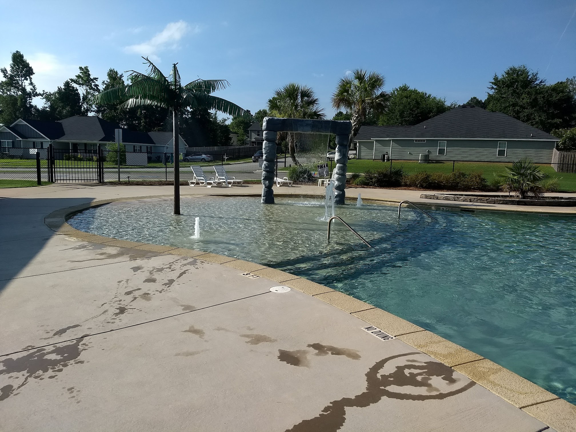 Beautiful pool! It was very clean despite how many people we hear from our house going to it ever since it opened lol (We live very close, but from inside we can't hear them at all, just when we take our puppy to potty) The waterfall was so much fun for my 1 year old to pass through. It wasn't very heavy, so he had no problem. I love that all ages can enjoy it, and there's enough room for several families to be there at once! We have just moved in and only been to it once, but next time I will add pictures!