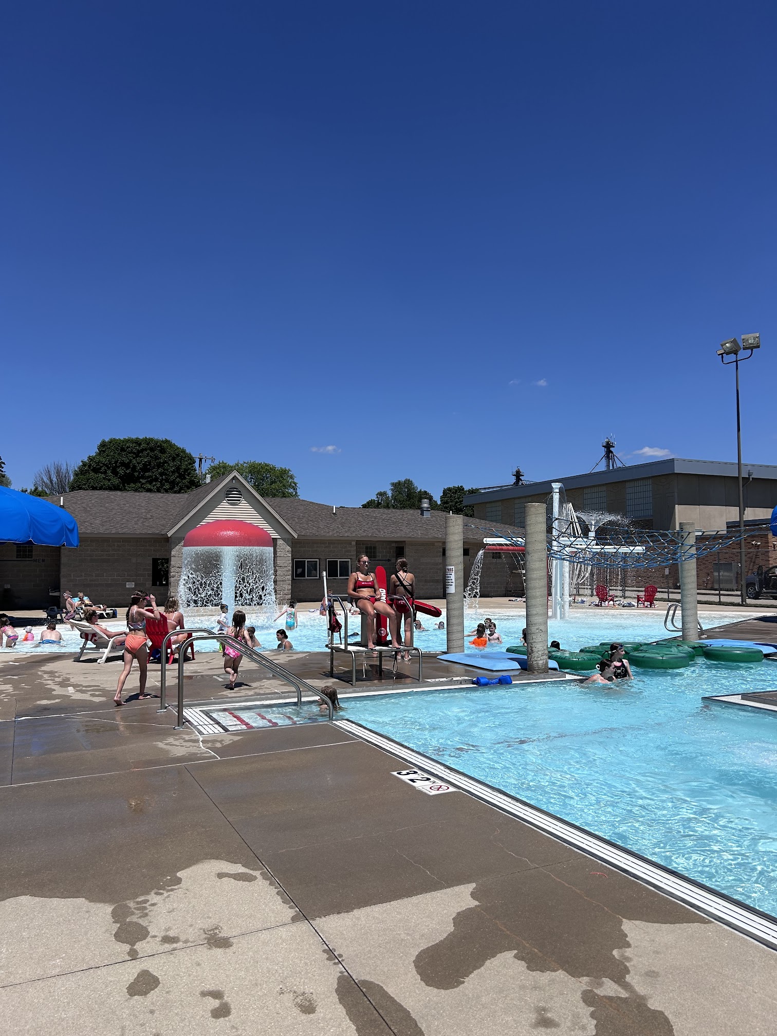 Took my 2 granddaughters there today, 10 & 12. They really enjoyed it. They have a lot of variety of things: 2 slides, zero walk in, deeper level, mushroom like water to stand under, net to hang on. Very nice for a small town. The girls were impressed with the concession stand n loved the icecream sandwiches. All the staff very friendly. I sat out & watched the kids swim, & was very appreciative of the huge umbrellas they have to sit under. They alone will definitely bring me back there. I’m not one to lay out ever so that was great. Only thing I would suggest is they need to invest in more of the plastic chairs.