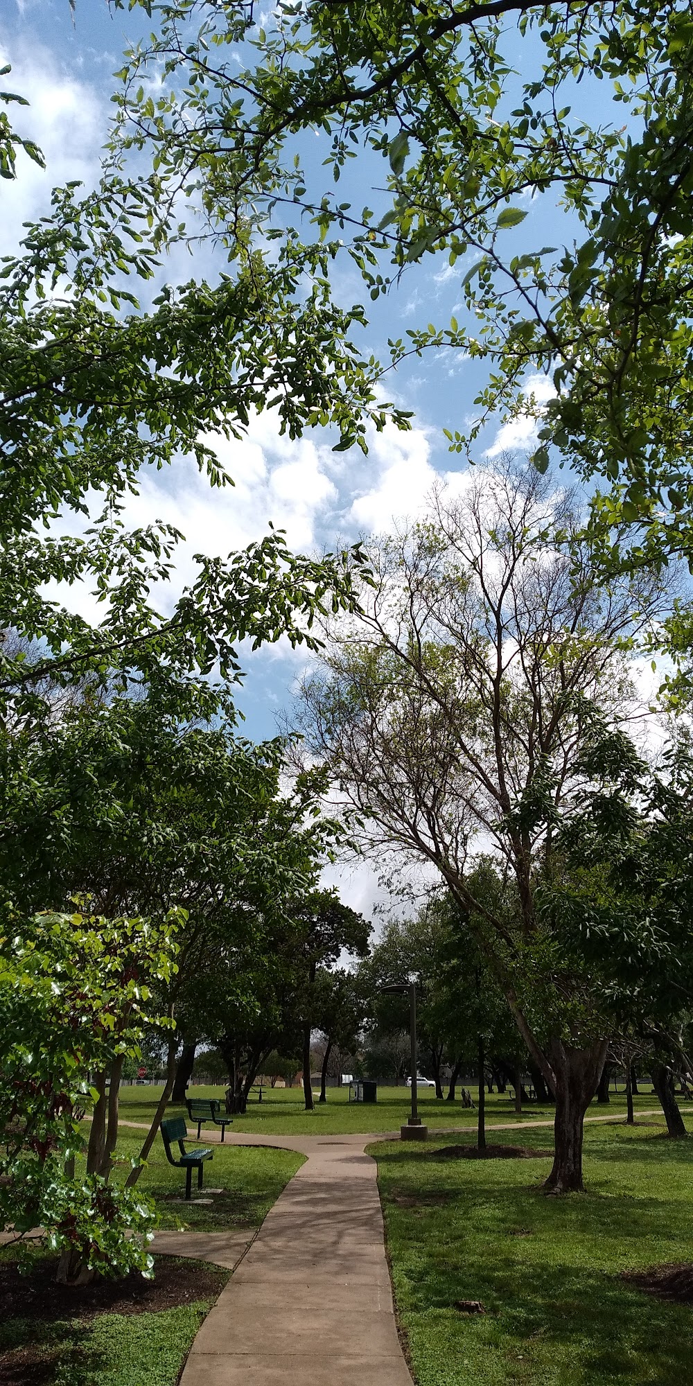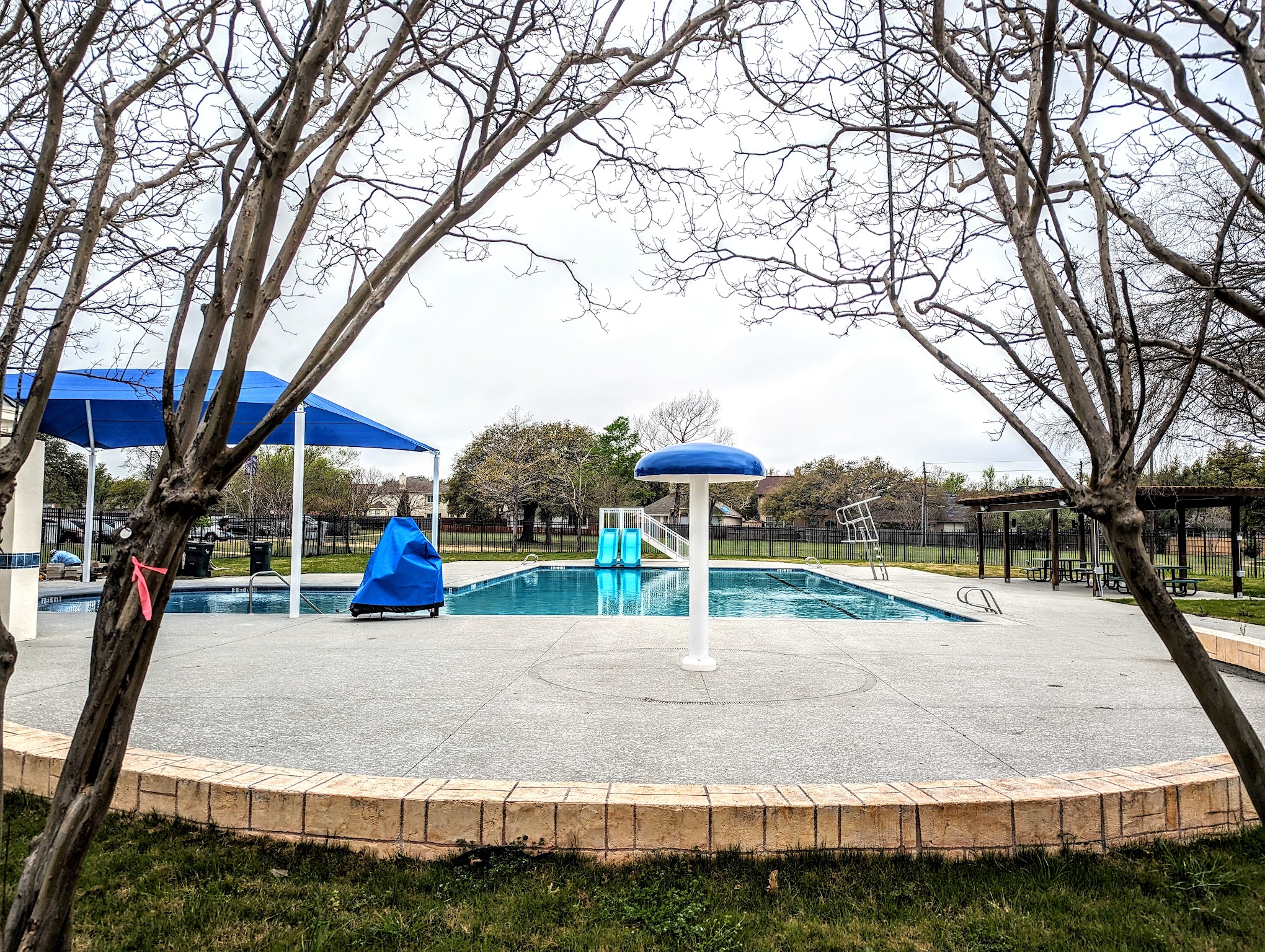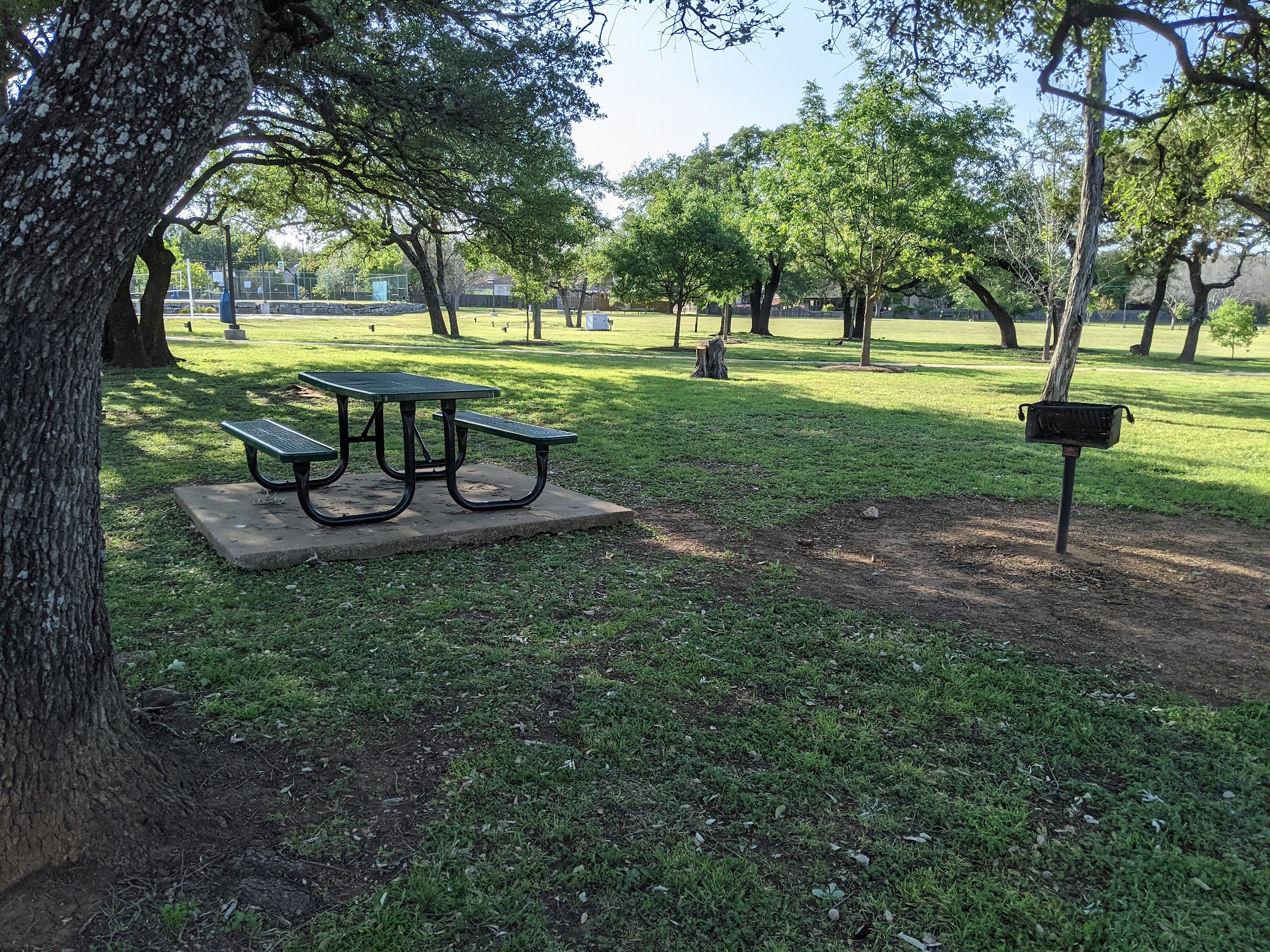 There is Some shade on the climbers. The bathrooms are clean, the trees a beautiful. The climber is in the sun. There is also a walking path. There is a pool. This is a nice little park with water fountains and a pavilion to get out of the sun. They have basketball and tennis courts.