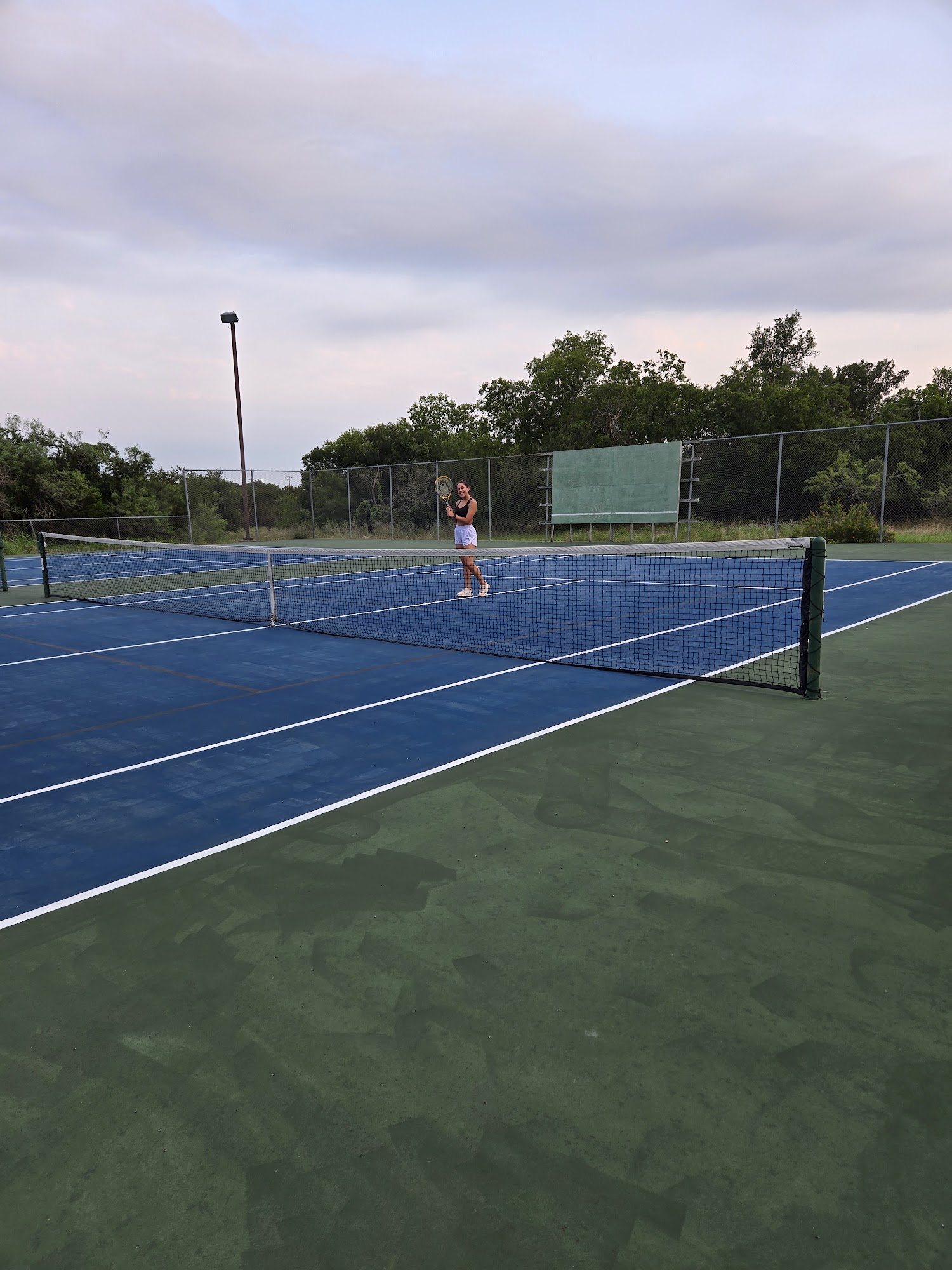 Great, place for family fun. Has 3ft to 8ft pool, playscape, tether ball and tables & chairs.