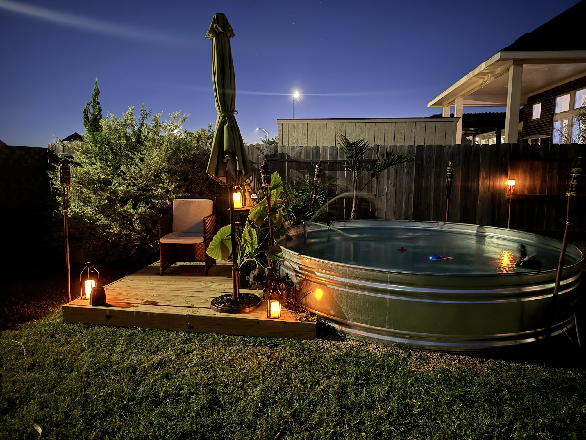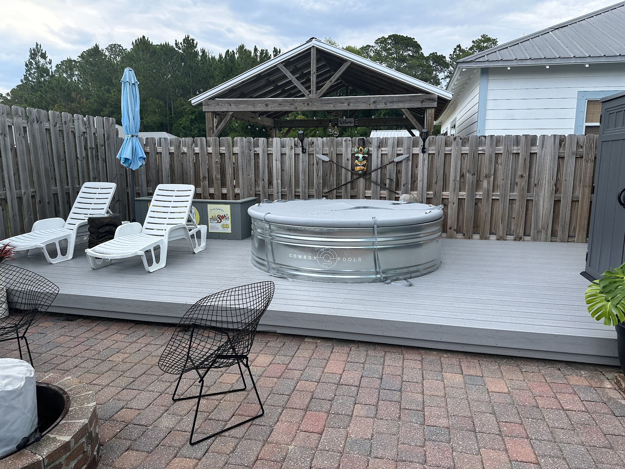 I should start by saying we live in a subdivision where the homes are large, but the yards are small. County setback restrictions pretty much tossed the options for inground pools. This is where our research brought us to Cowboy Pools, and so glad it did! The 8’ size is much larger in person than a mere tape measure can describe! We find it to be extremely roomy and accommodating! The setup was super easy thanks to the prefab done ahead of time, and the color coded system. The pump provided is powerful, with the power of the water lines being downright therapeutic! We opted for the 110v electric inline heater, but given we are in May/June here in Florida, we still have half a year from testing that out. 24 hours after setup, it’s plenty warm already! LOL! Already built a pony wall to hide the mechanicals (and yet open on top for access and airflow) and I plan to add a raised platform on the back half for those that want to sit and dangle their feet, but we already love our Honcho! Oh, the inflatable lid is total awesome-sauce! Love its light weight, the straps (which will come in handy for Florida storms) and its peaked center for rain water runoff. Highly recommend that option!