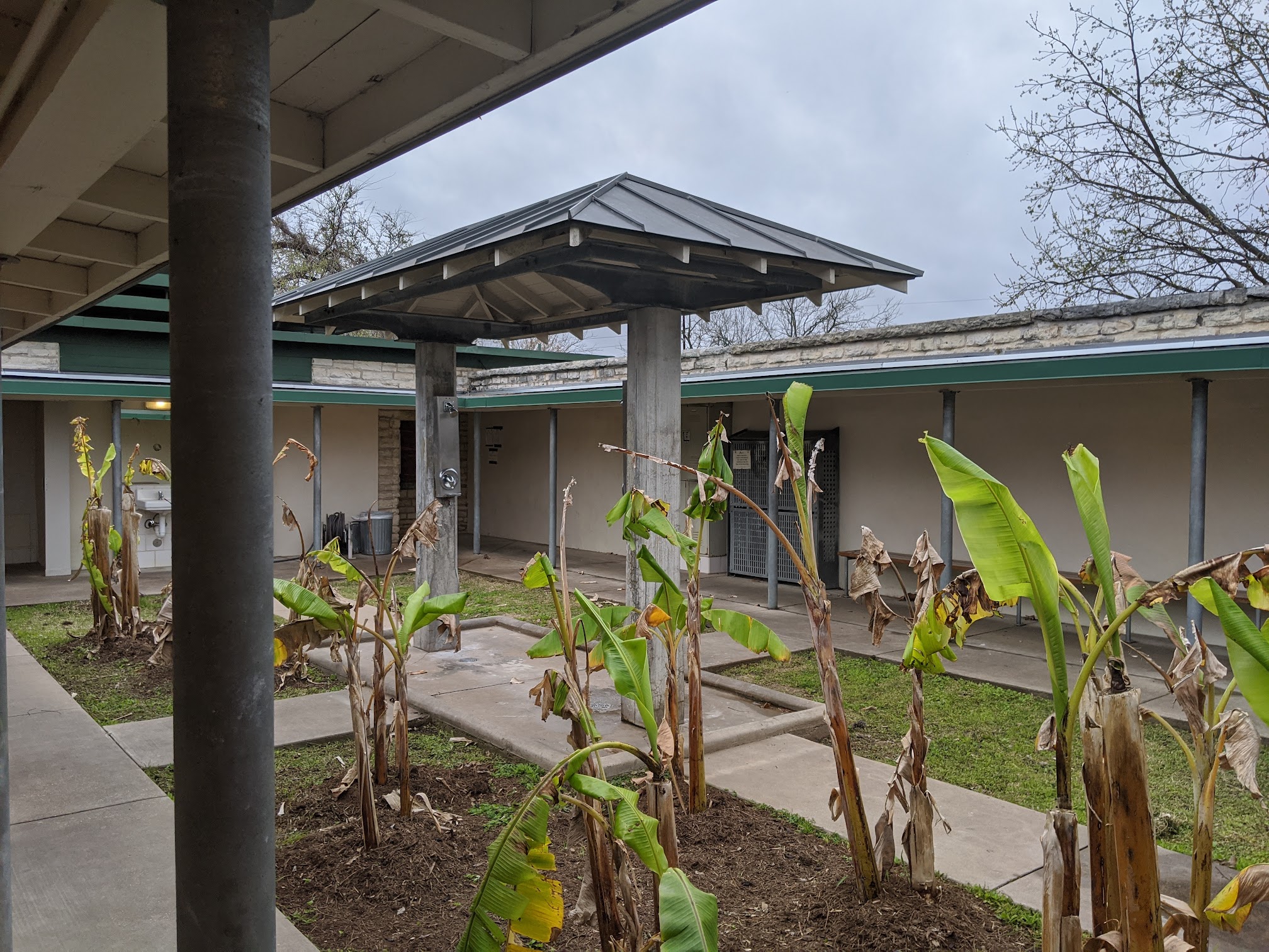 Natural fresh water, bathrooms and change rooms. Fee is $5 or $9 for residents/ non residents. Be aware of algae/ mold and not crystal water depending on how many people there. Parking is pain as always in Texas.