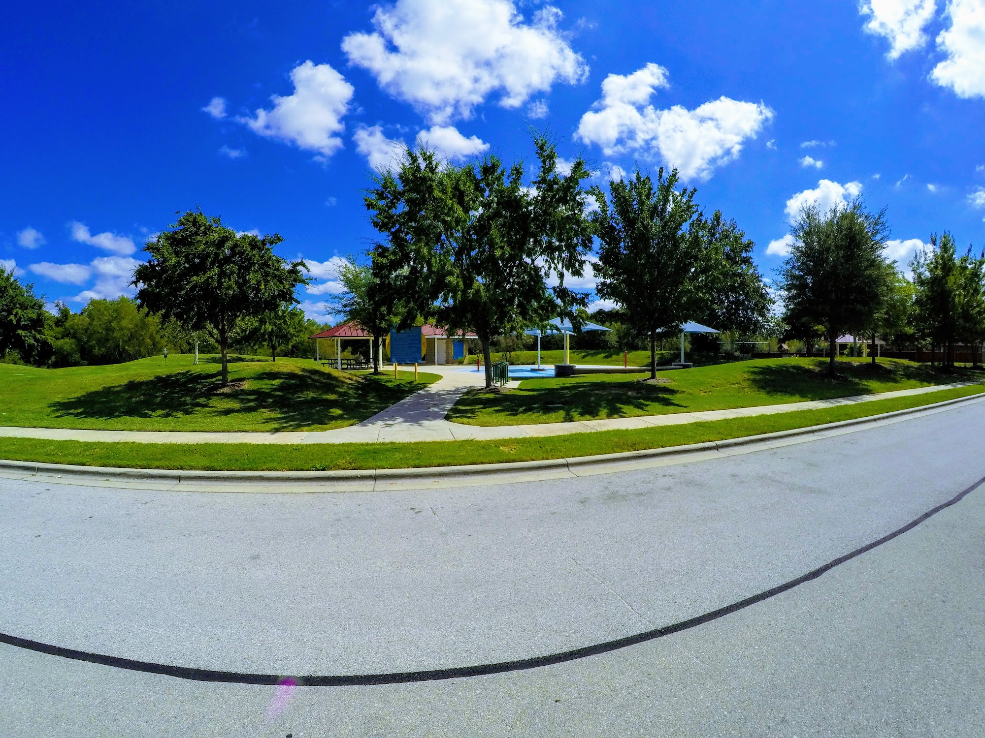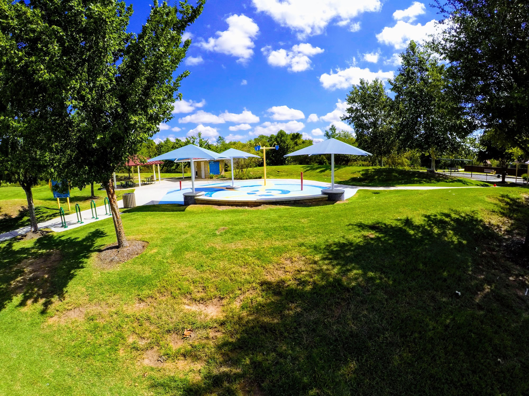 Kid-friendly park featuring a splash pad, swings and a playground.