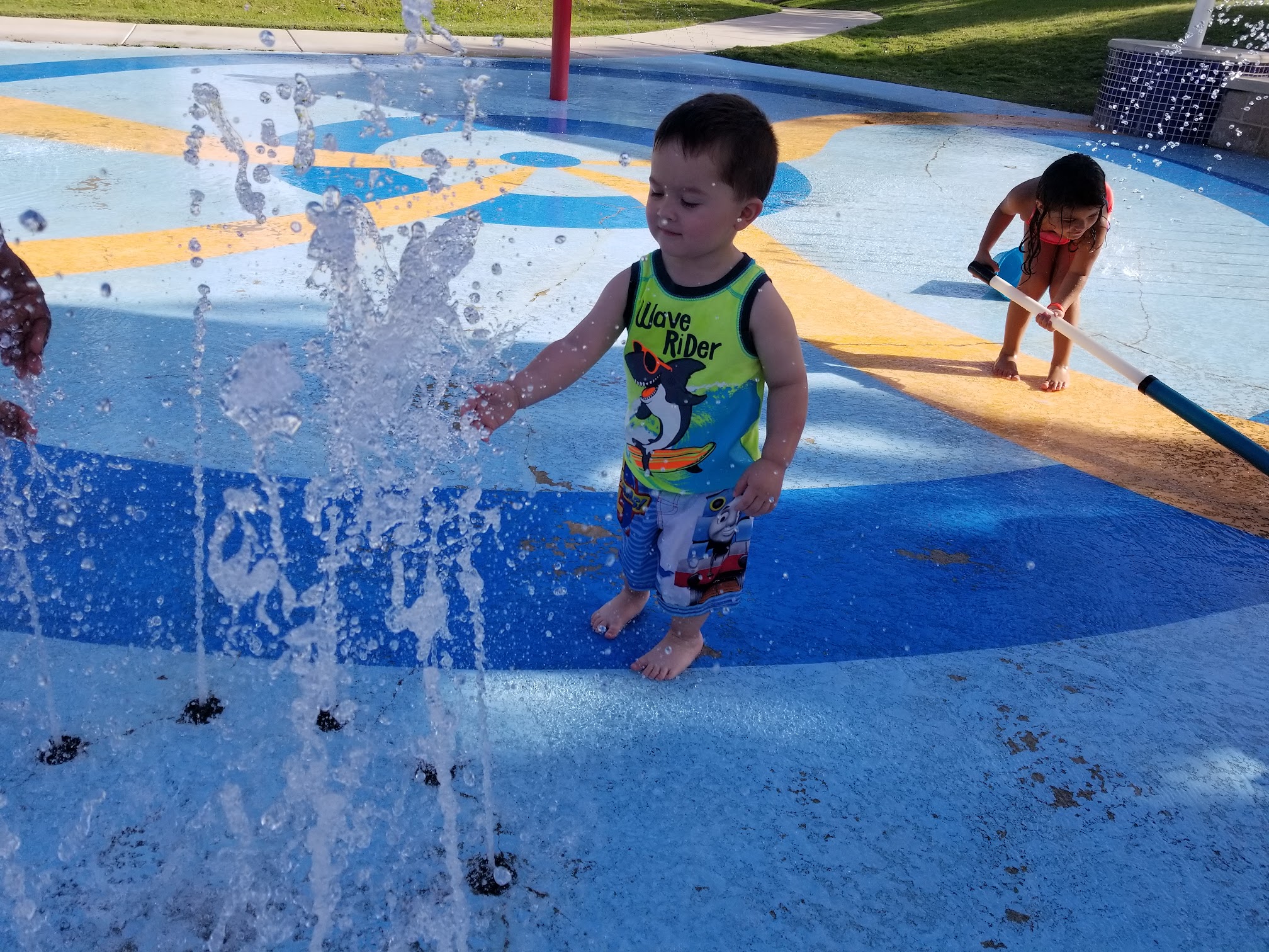A super neat little splash park! Out of the way, not to busy, and perfect for smaller kids to cool off. There is plenty of room for adults to sit either on a grassy hill, or under the pavilion with picnic tables. There is also a swing set in the other side of the grassy hills to take a break from the water. Also, there is a larger grassy area that could be used to play games and such for older kids.