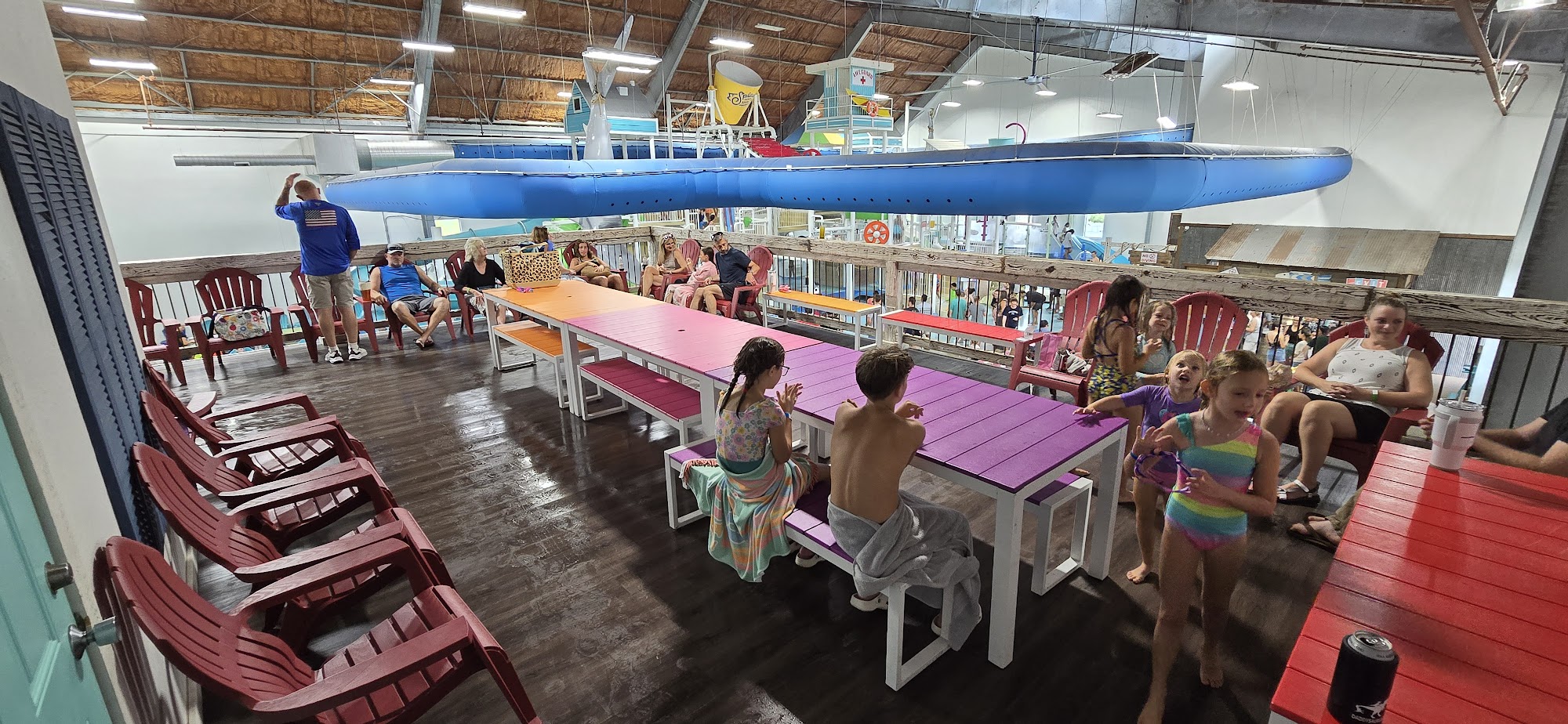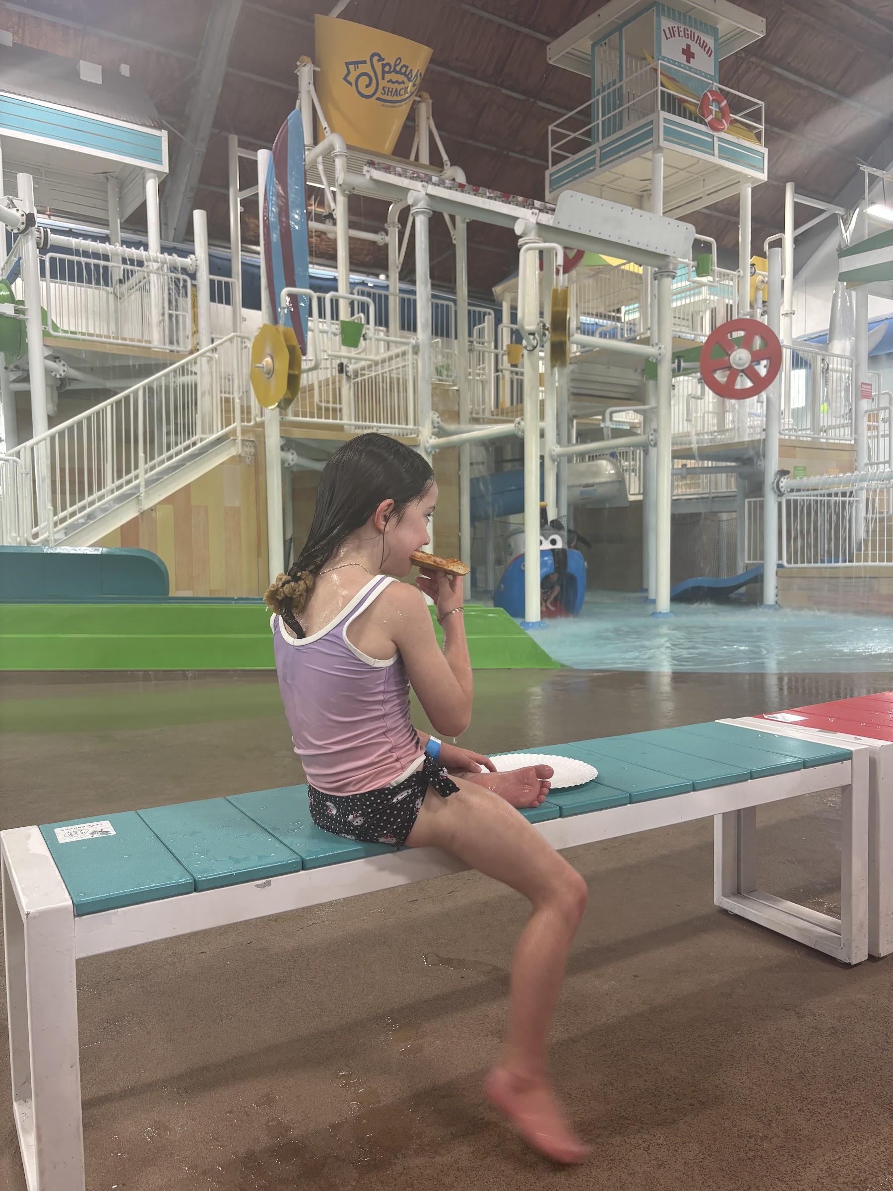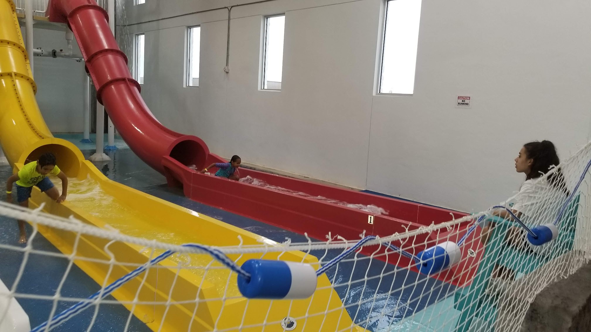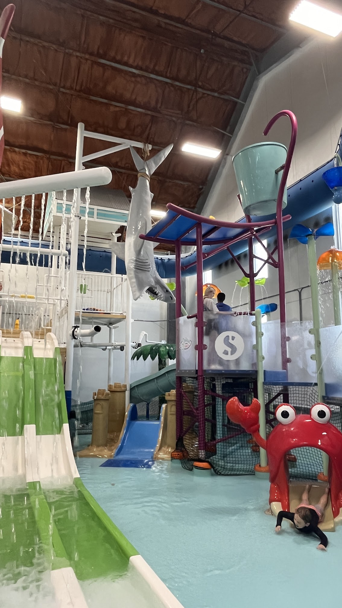 Heated year-round water park featuring slides, tipping buckets, and a snack shack.