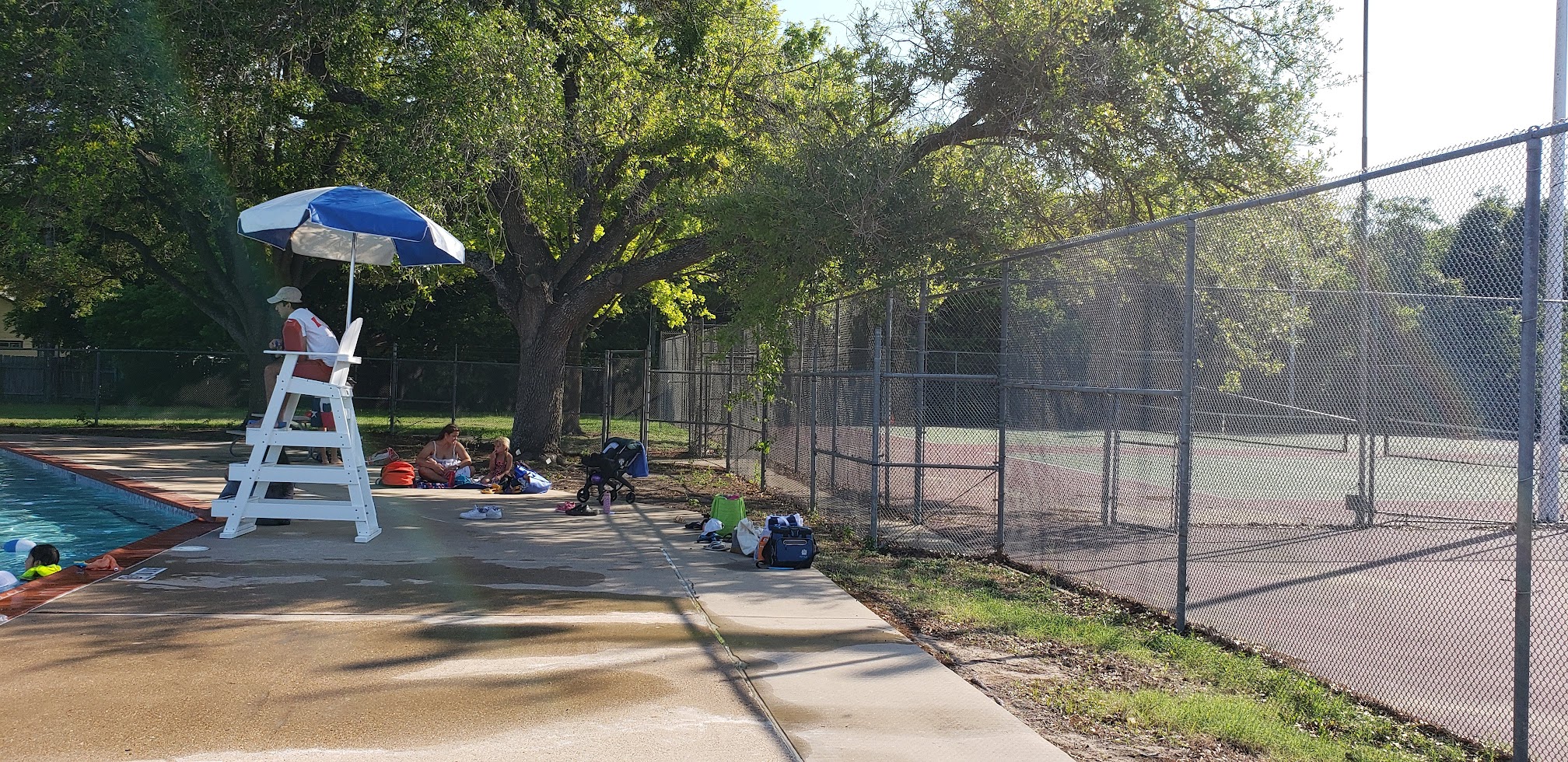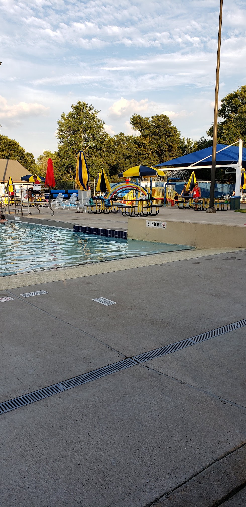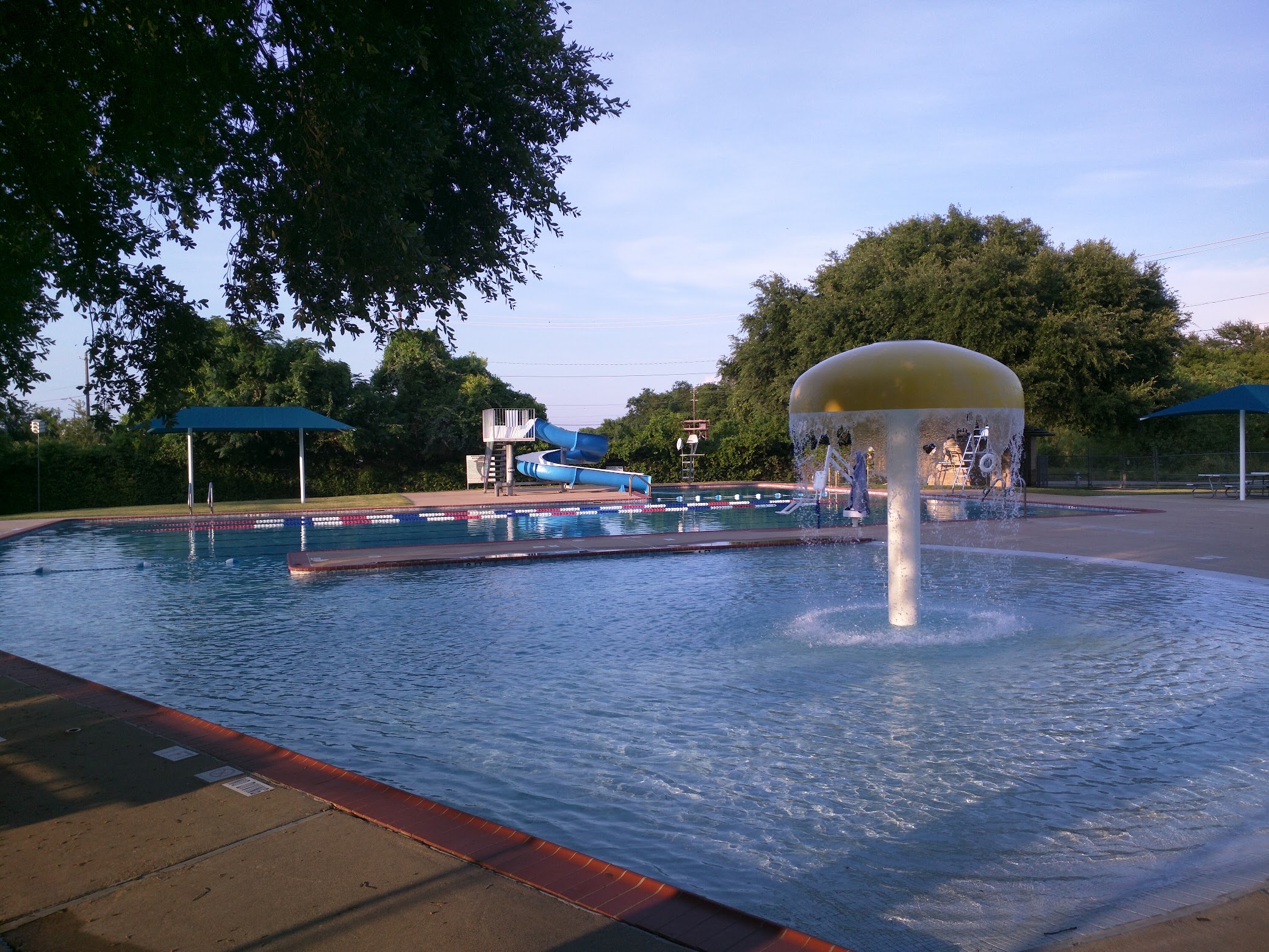 Love this pool! Nice kids area with a water mushroom and large lap pool area. Also has a slide, though I wish they would let kids under 48 inches use it if they can swim. My liitle guy is a good swimmer, but they say he's too short, even though he's 7. It has huge trees for shade, well-maintained, and never crowded! The life guards are very friendly too.