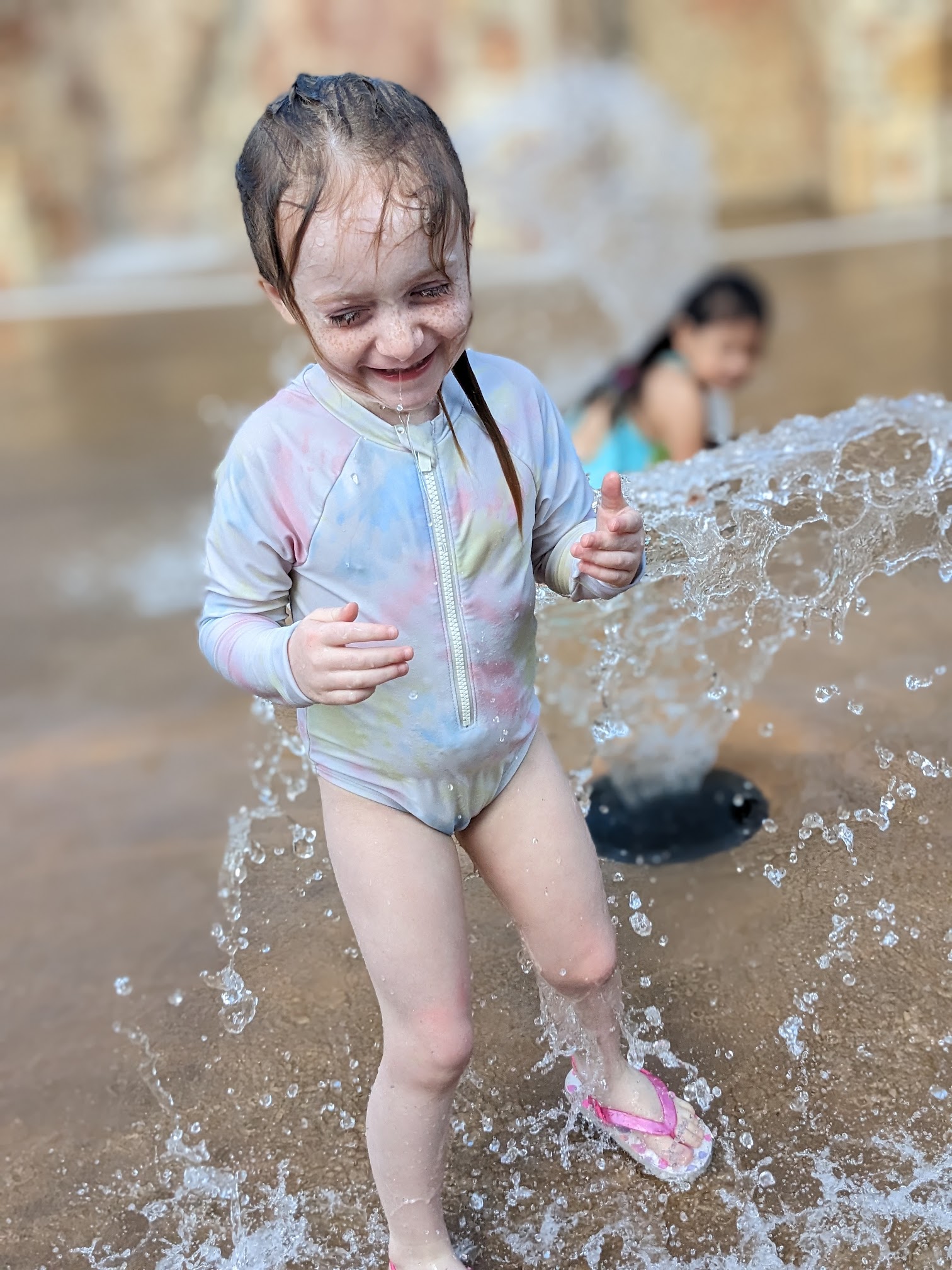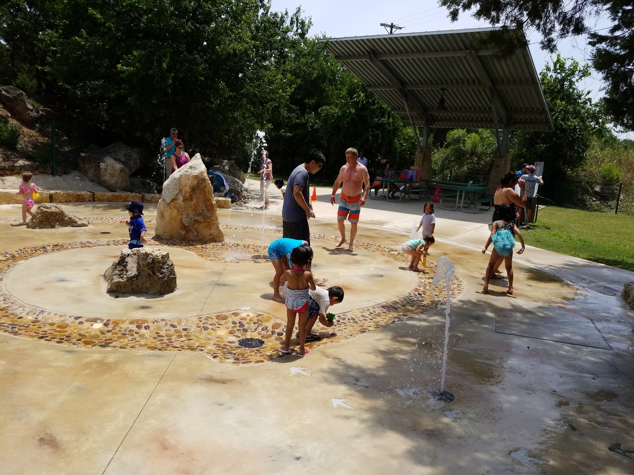 Our favorite splash pad that we have visited in the area by far! It is spread out and has plenty of room for lots of people to enjoy. We went on a Thursday at opening, and there was a summer field trip, so lots and lots of kids. The rocks and natural look to the water area give it a nice refreshing touch. Be sure to bring snacks as they have plenty of picnic tables plus shaded areas to sit in and eat. It does cost $2 per person entering, and they do not accept cash. My girls would have stayed all day if they could!