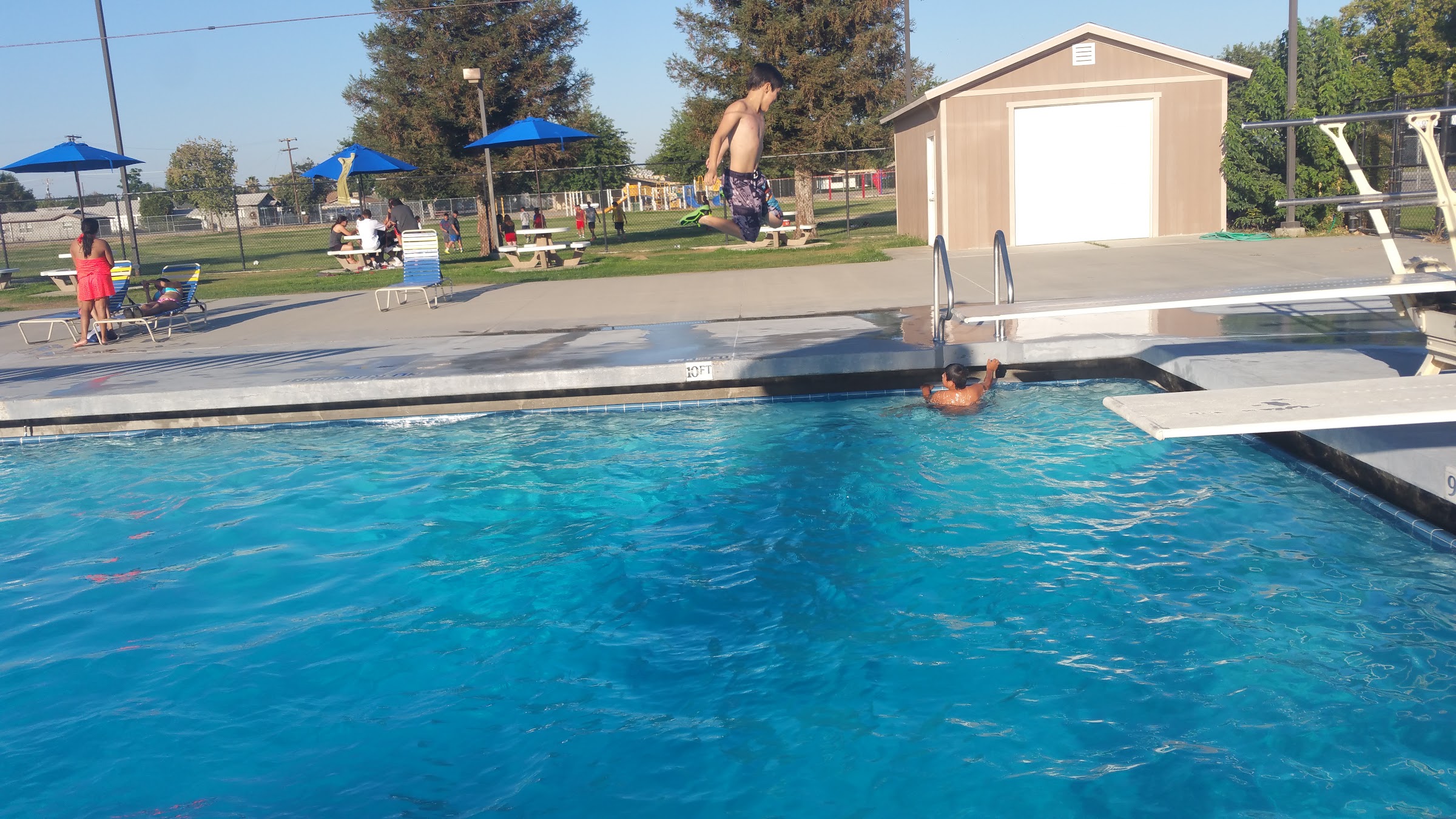 Public swimming pool with a diving board.