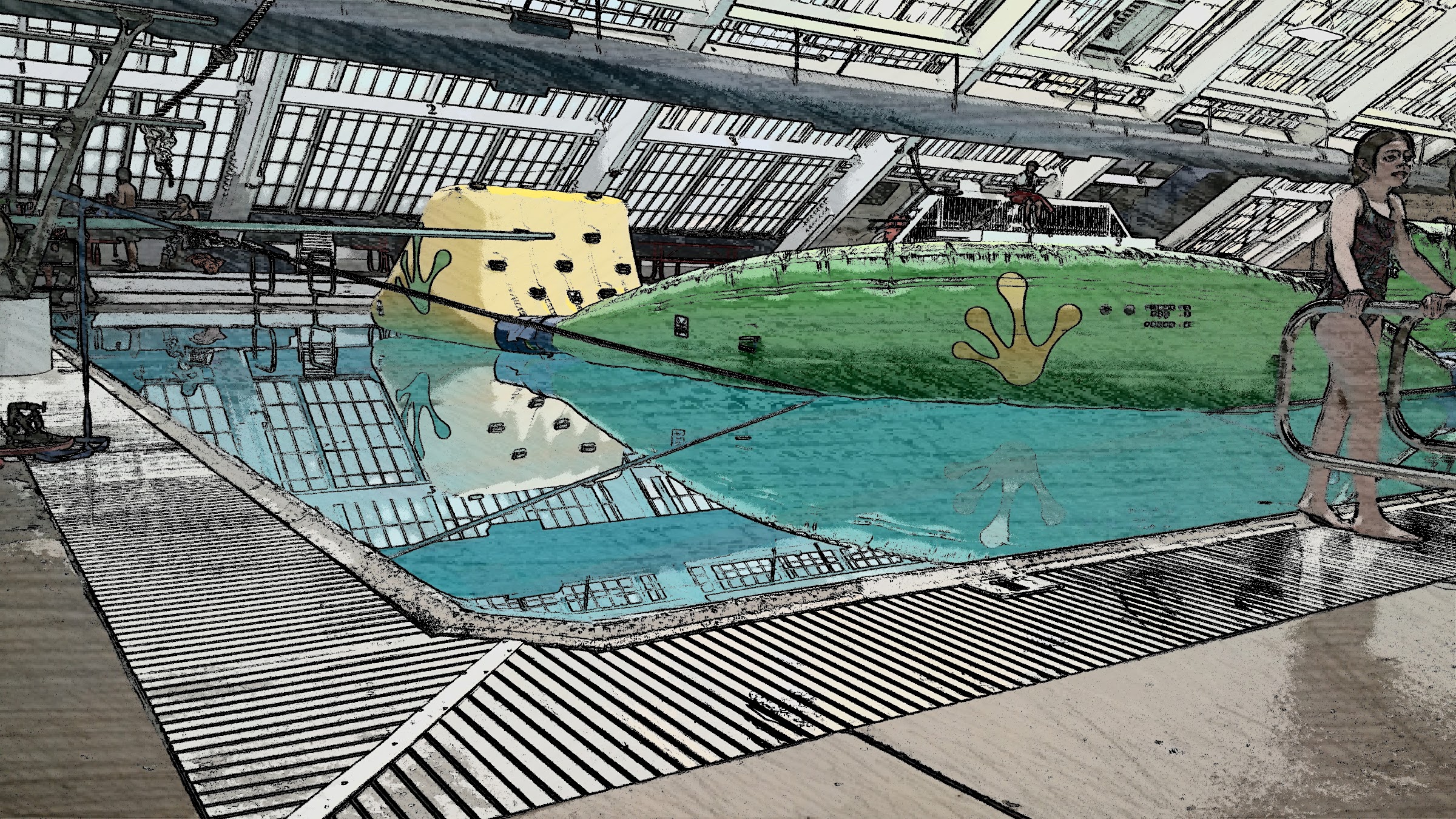Public swimming facility featuring 2 pools—1 for adults and 1 for kids with a waterslide—plus a sauna.
