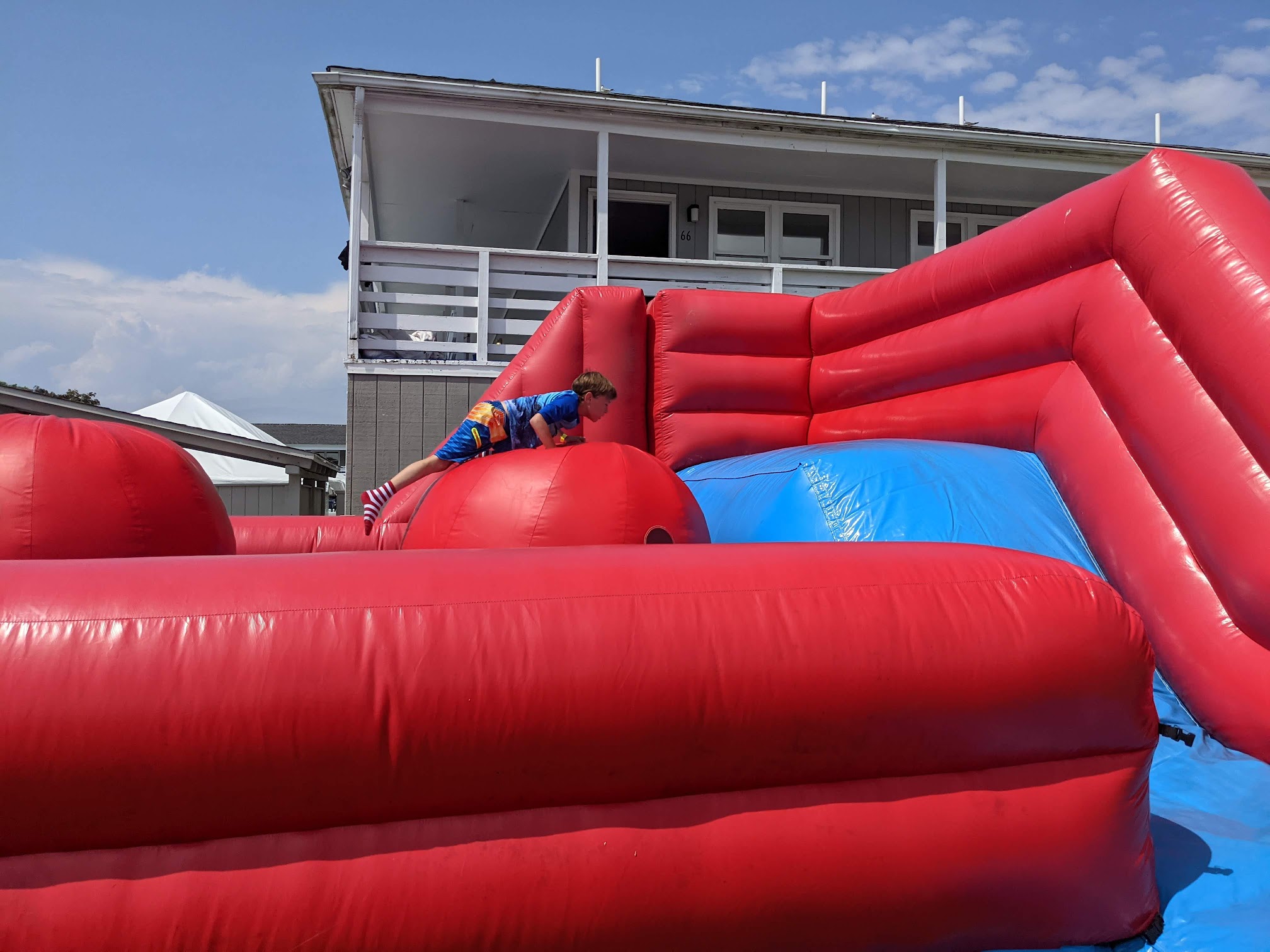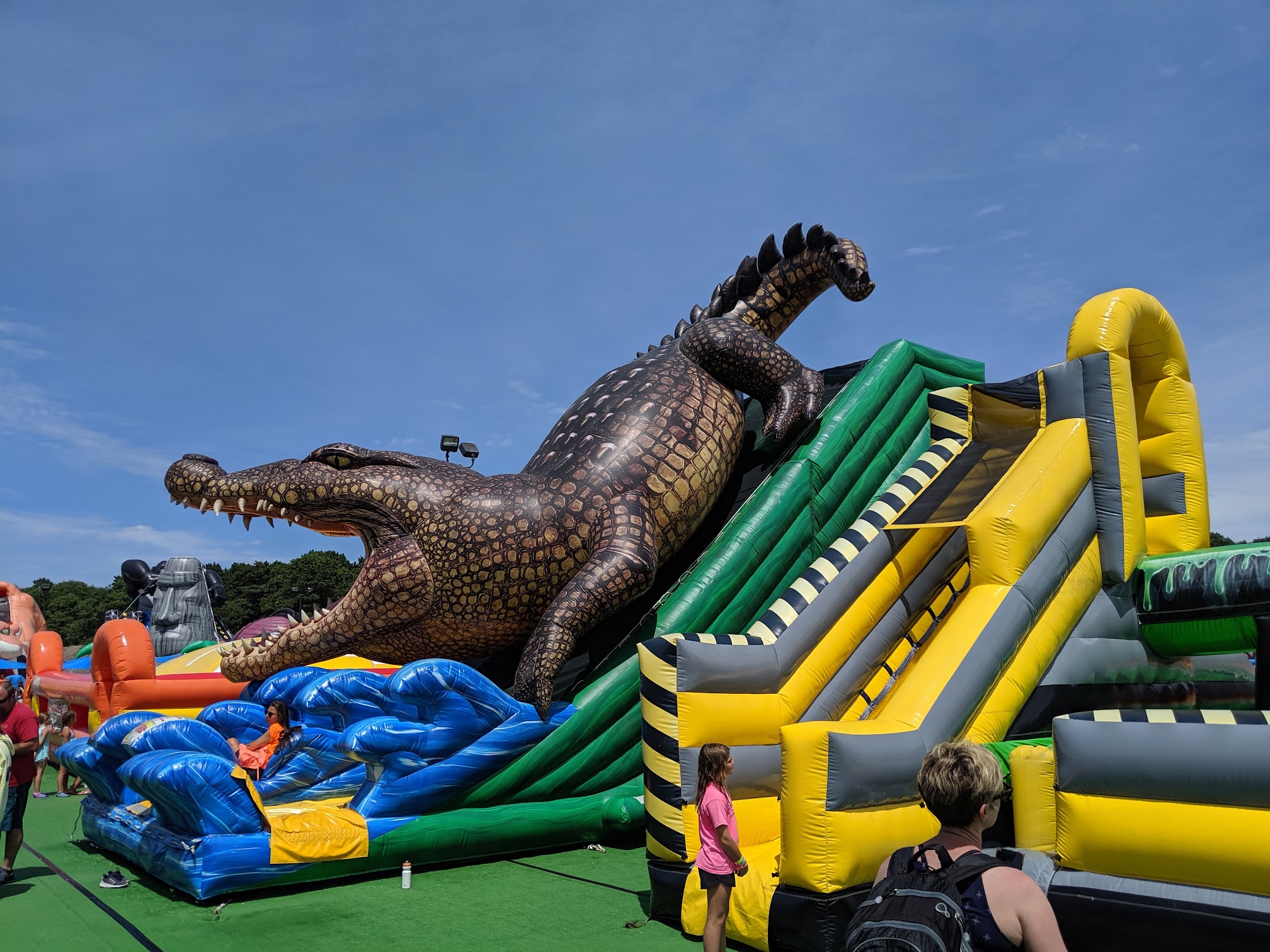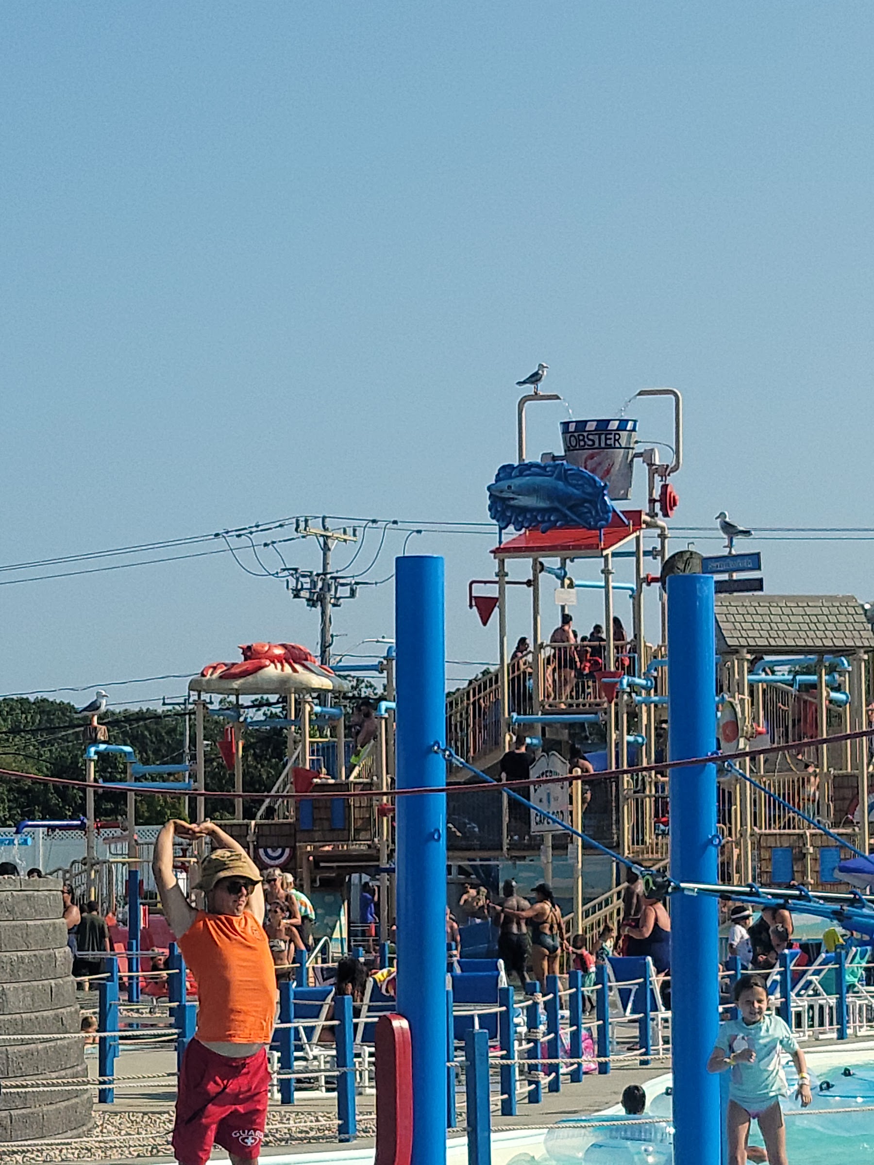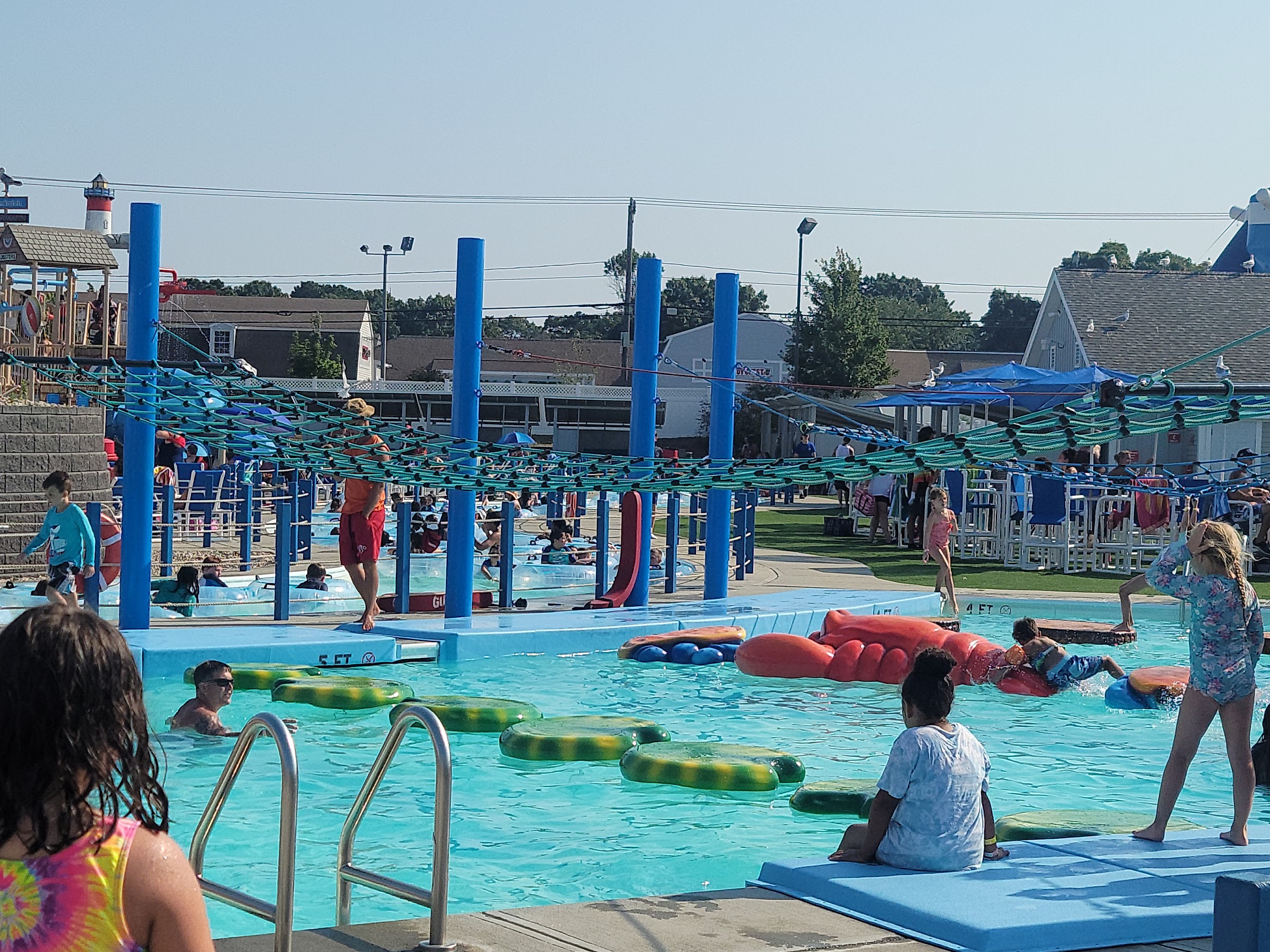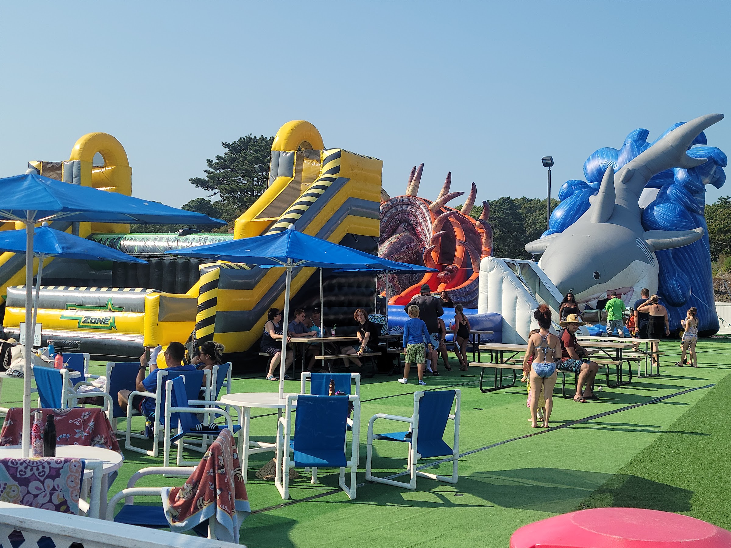 Water and inflatable park - took kids ages 2 to 7 (4 kids). Rented a cabana which was nice but not really necessary. If you order food, need to be aware of the sea gulls preying for you to move so they can swoop in and take. We went on a hot day and the cement and artificial grass was hot. I would recommend water shoes as even in the wave pool, you can feel your feet getting sanded. The water park was fun but the lines for the older rides were long. Also no food is allowed in the park so beware that you will need to buy food. Lots of options. The pizza was really good! There are two areas to fill water bottles. Parking was good and attendants show you were to park. Security checks your bags as you enter.