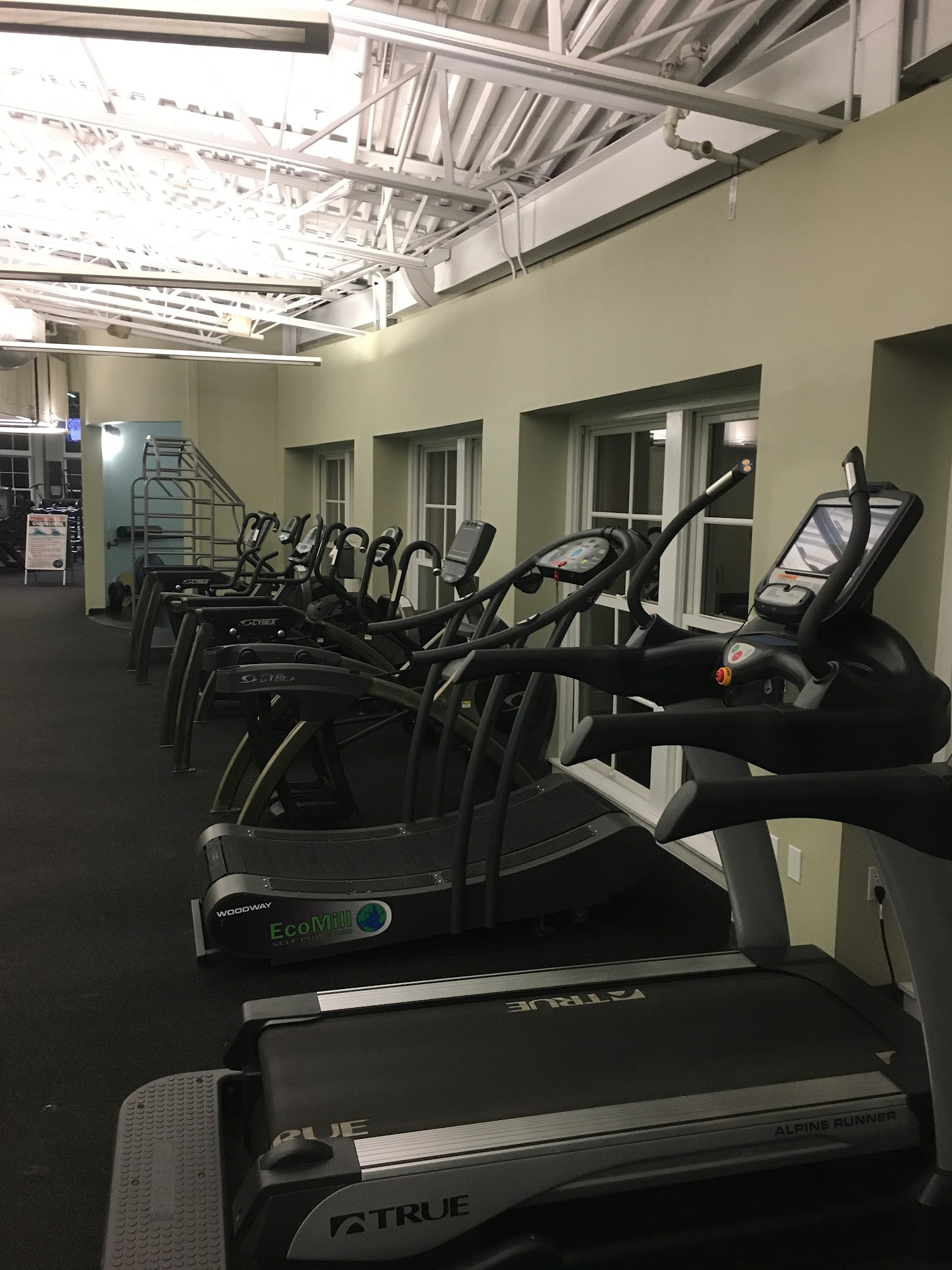The atmosphere is quiet and friendly, often with a welcoming display at the front door. I can always find machines that are available, clean, and in excellent condition. Floor to ceiling windows add to a positive experience! There is a wide range of workout choices including weights and two areas for stretching. The pool is great- clean and not too warm or too cold.