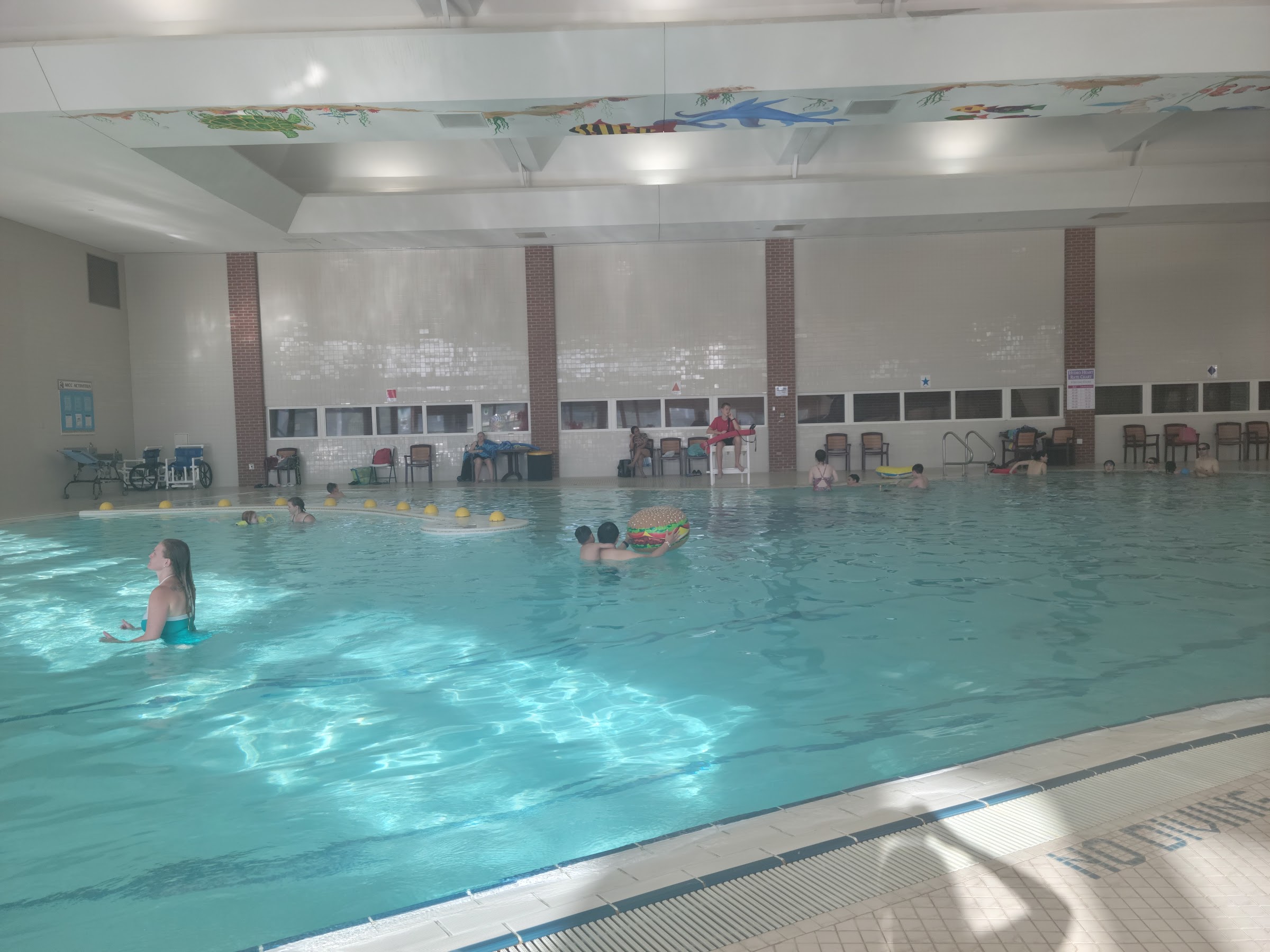 The center's aquatic facilities include a Warm Water Pool, generally maintained at 90-92°F for therapy and lessons, and a Lap Pool, typically kept at 80-82°F for lap swimming and water fitness activities.