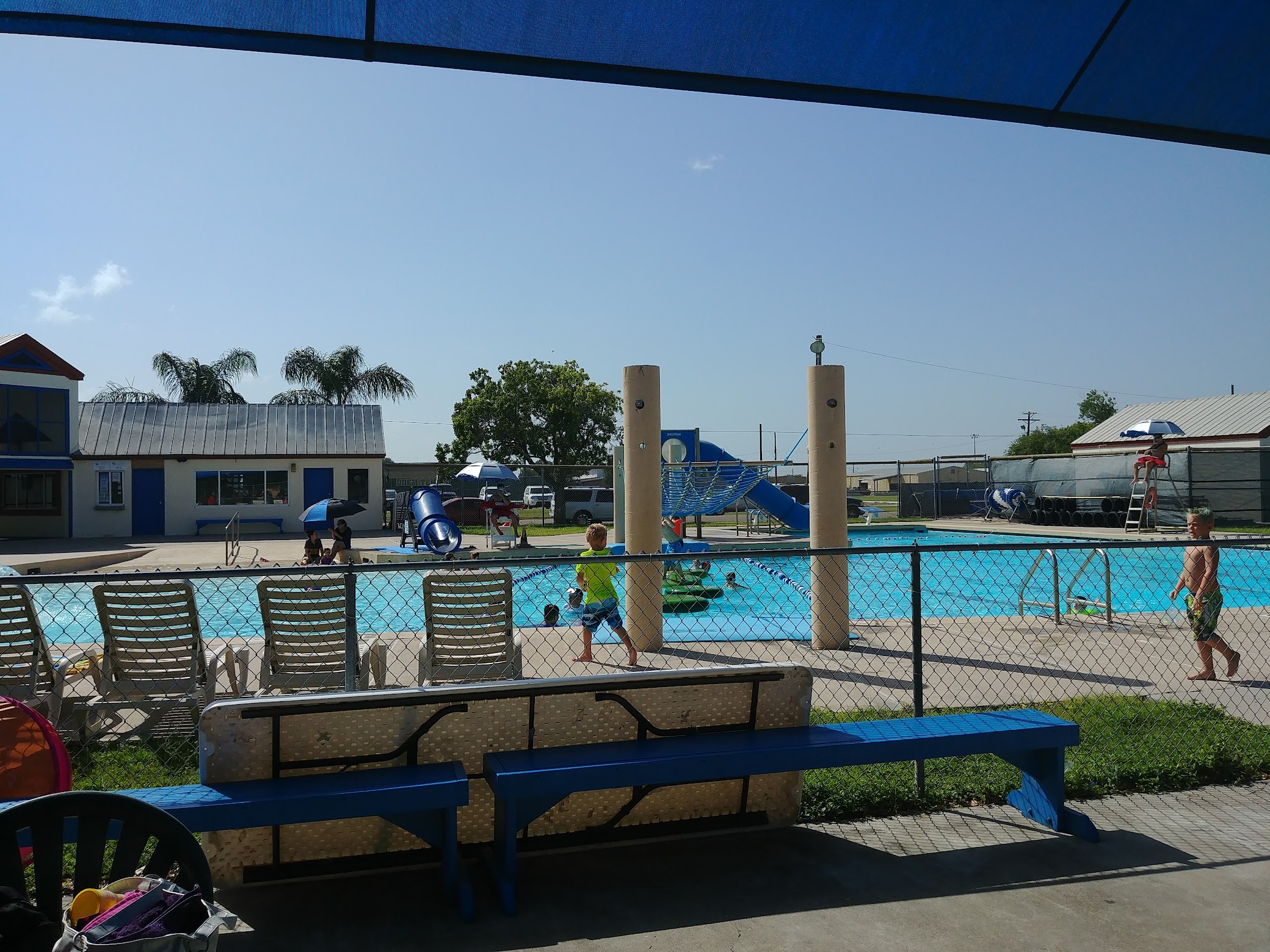 Beautiful pool! We had our son's 3rd birthday party here this past weekend, it was hot, but it is also South Texas! We couldn't keep him out of the pool! We were able to keep the cake and sandwiches in the life guard office untill we were ready,and also after we were done untill our rental time was up.