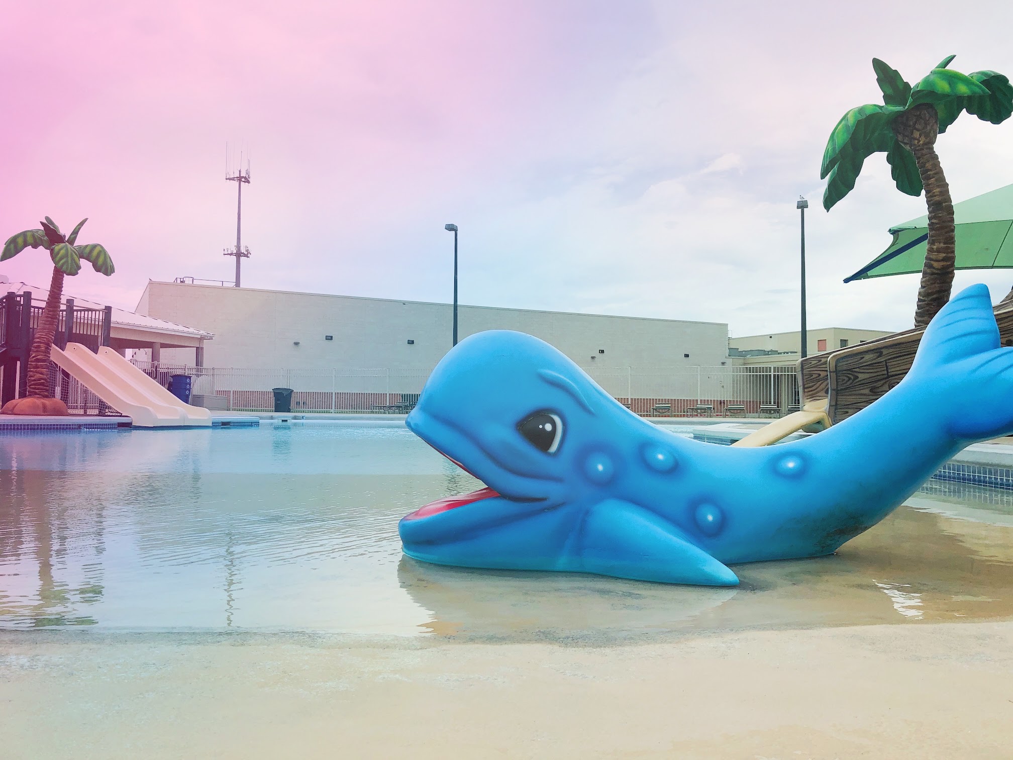 Public facility with 2 pools and a kiddie area with water features, plus a concession stand.