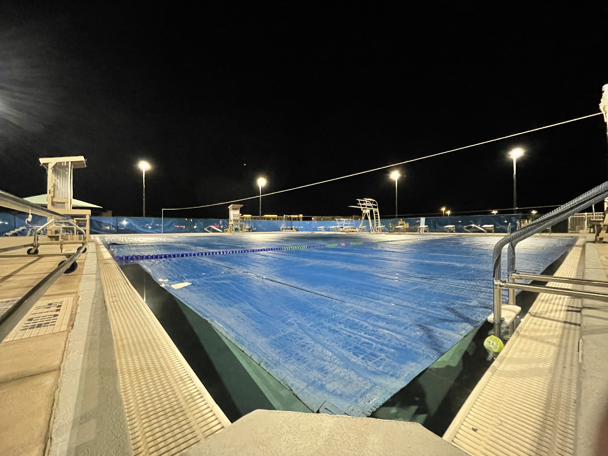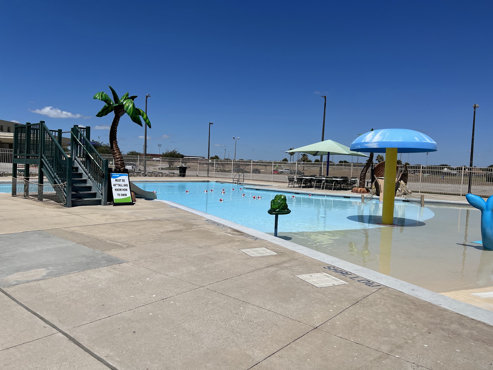 Really an awesome place to swim. Has a kids' splash pad that has a kiddy pool attached and then a large pool with diving boards for older kids and adults. Lots of parking, covered table and chairs and a small snack shak.