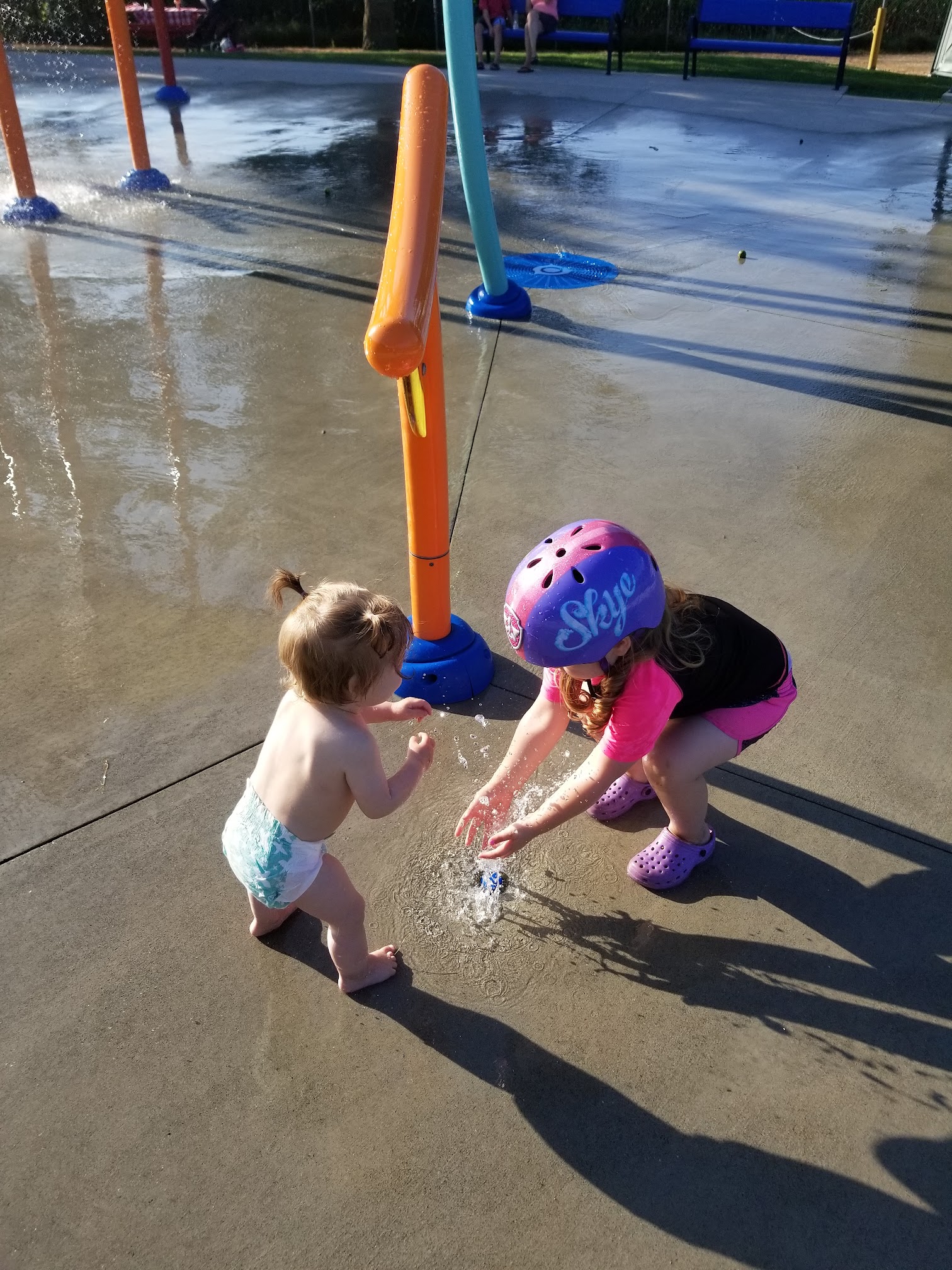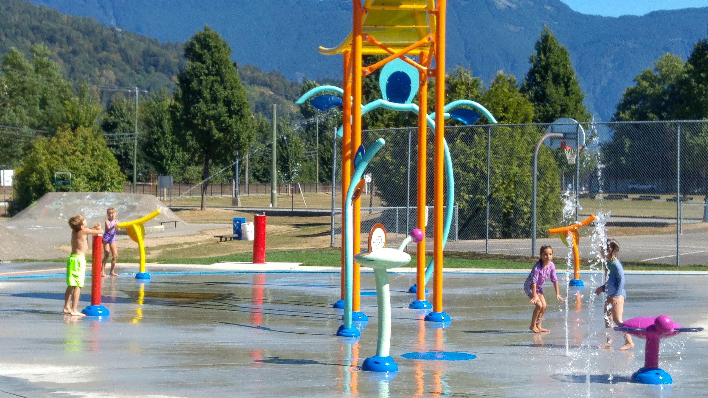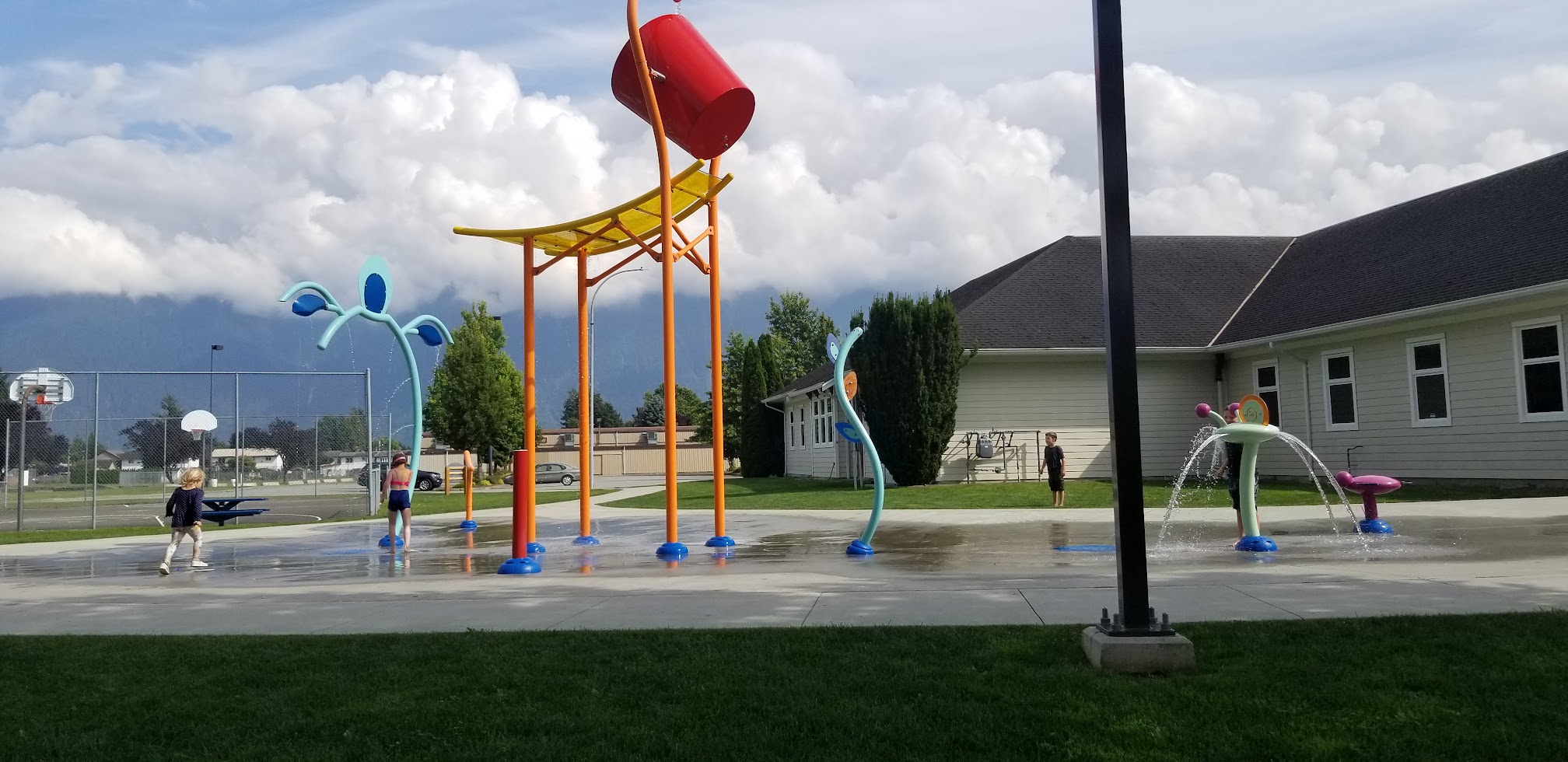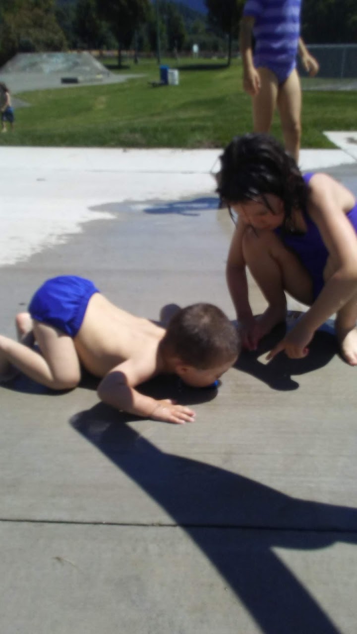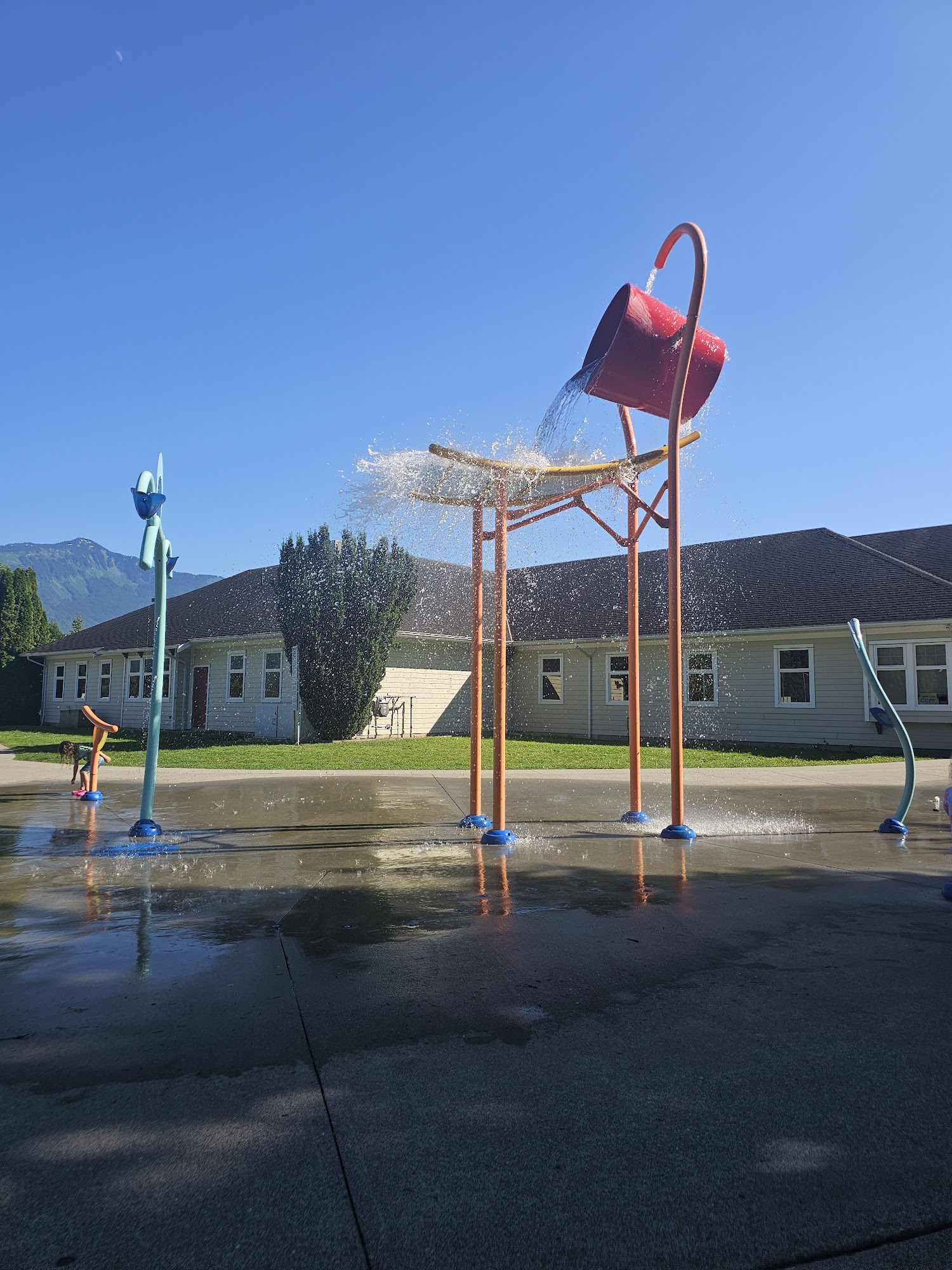 What are people saying (AI review summary)? This is a small, cute outdoor splash park generally well-suited for families with kids aged 3 and up, particularly on hot days for cooling off. It's often not busy and offers ample parking, clean grounds, and some shaded areas. A highlight is the large bucket that periodically dumps water, providing excitement, though this might be too intense for very young toddlers. Nearby skateboard ramps can be a distraction for smaller children. Port-a-potties are available, making it a good spot to spend a few hours.