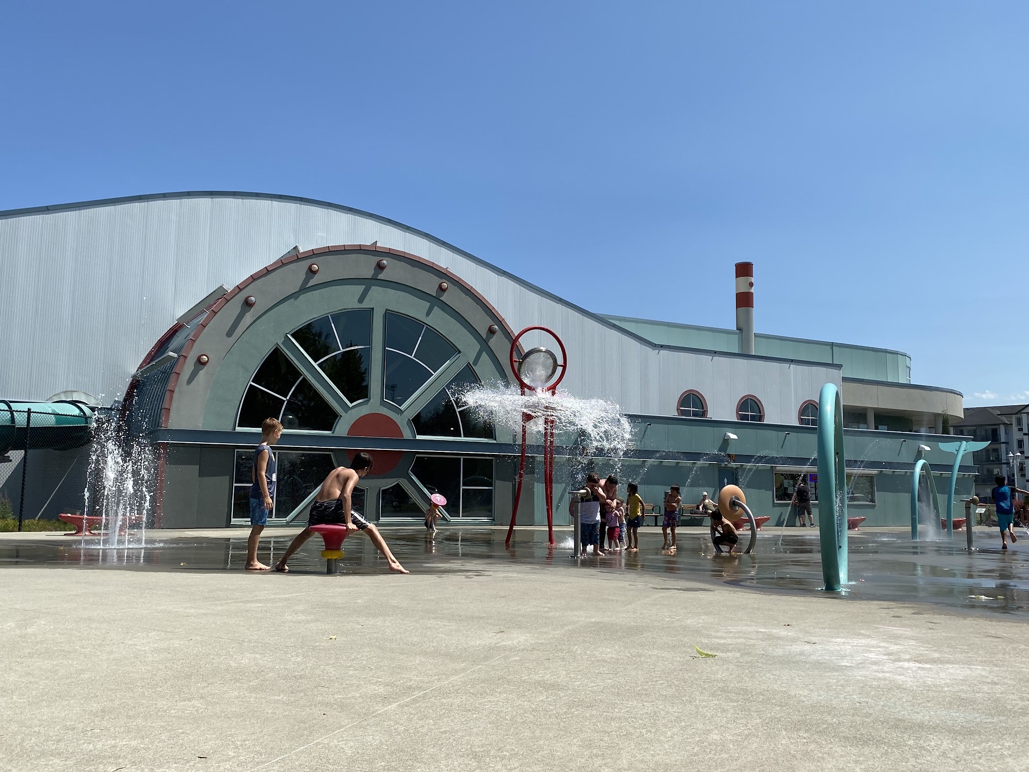 Children love the pouring big bucket, lots of ground spray, clean washroom, concession stand, picnic tables, surrounded by trees so plenty of shade to picnic in the grass and just watch your children play. Big free parking and close to a big playground.