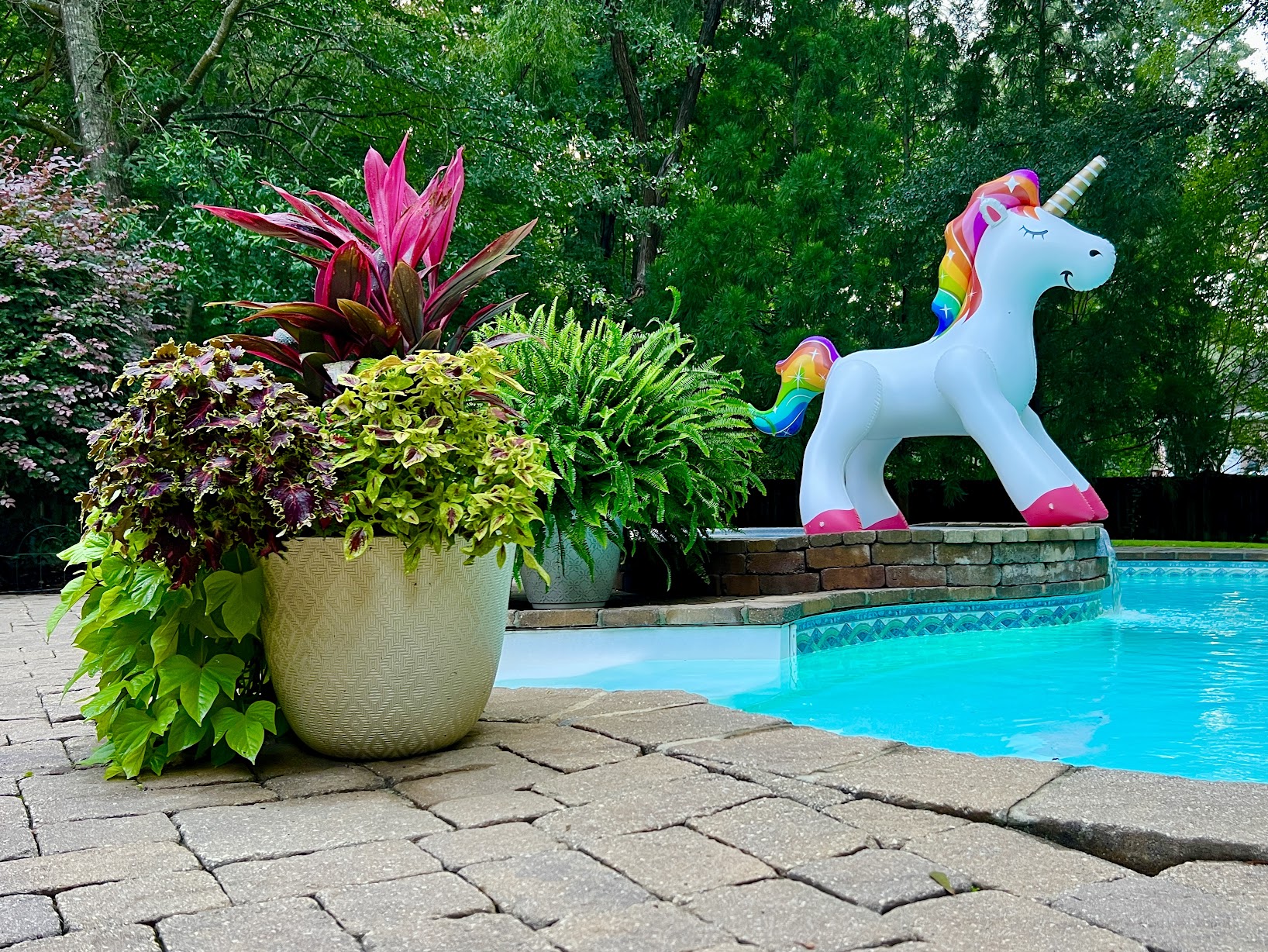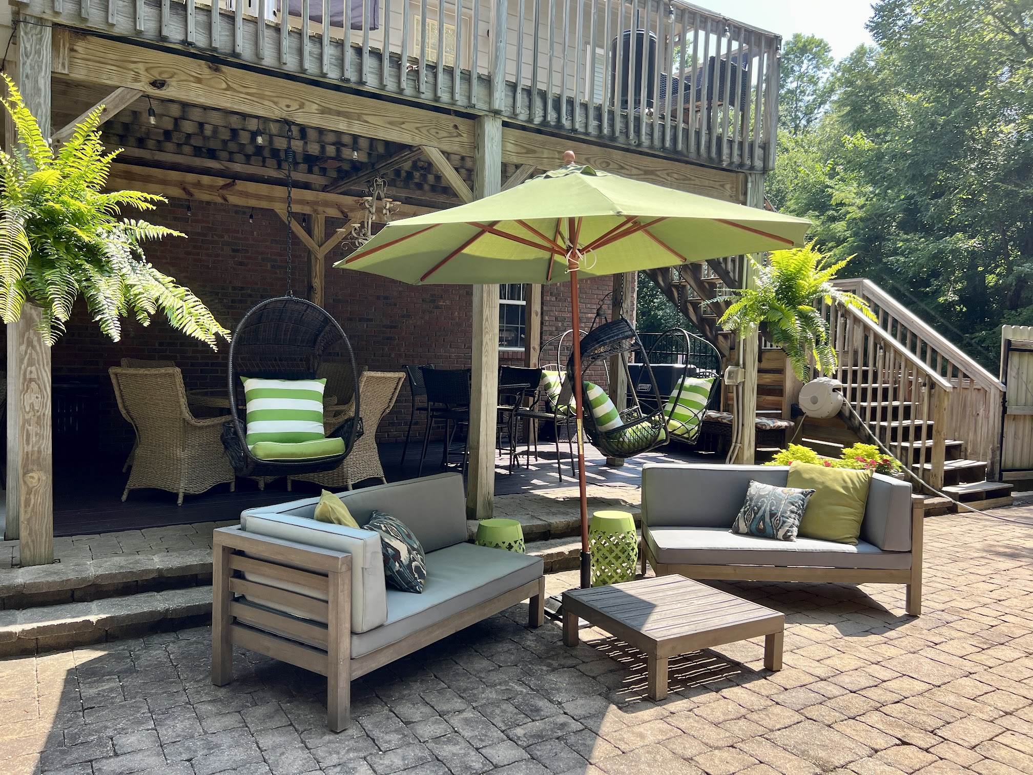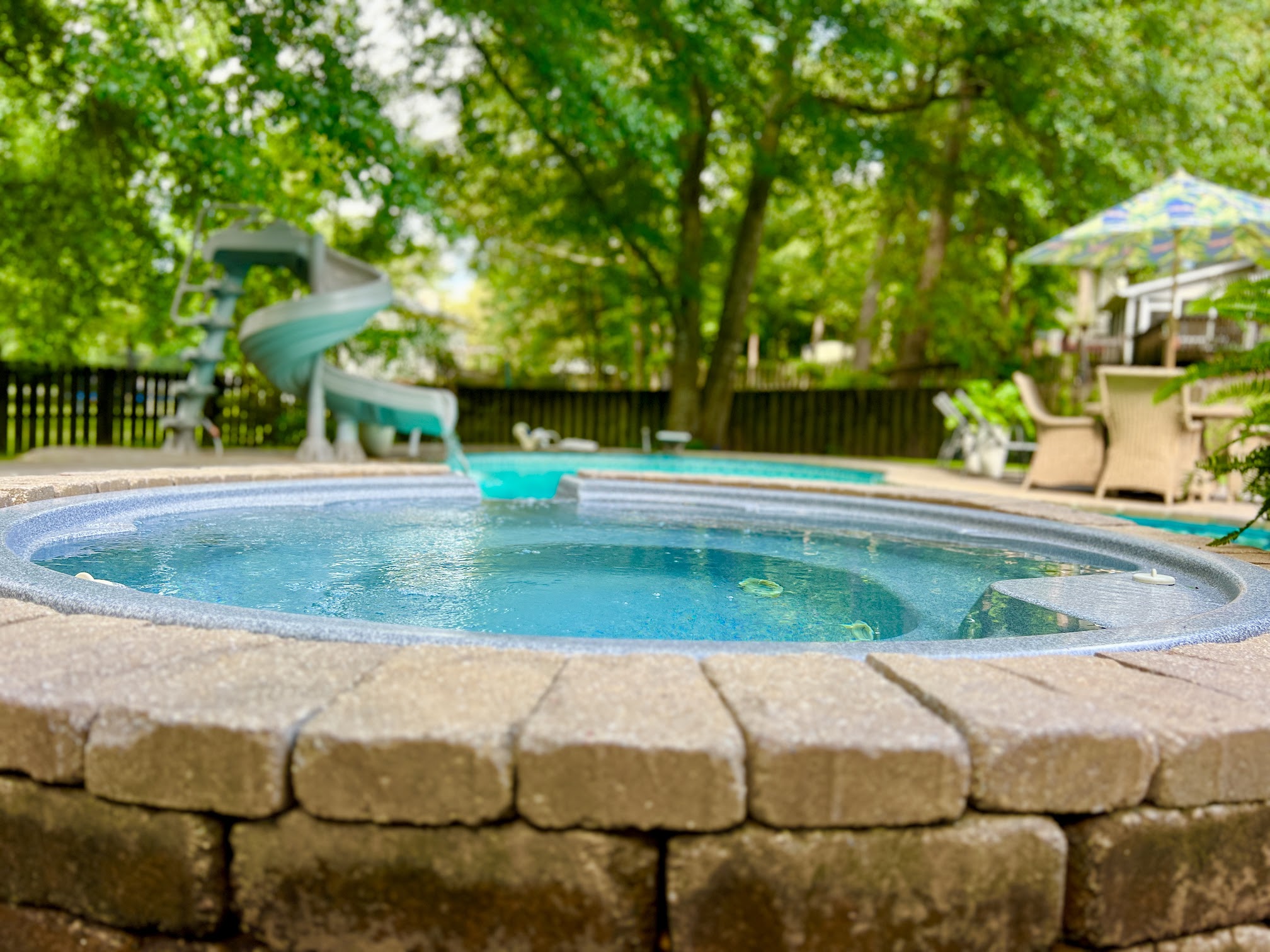 The Swimply - Endless Summer Oasis in Birmingham, AL, is a private, resort-like rental situated on 1.3 acres in Greystone. It features a large 20x40 saltwater pool with a tanning ledge, a hot tub, a covered back patio with a built-in grill and fireplace, and various seating options including lounge chairs and outdoor couches. Additional amenities include a trampoline and a basketball hoop, offering a comprehensive private retreat experience.