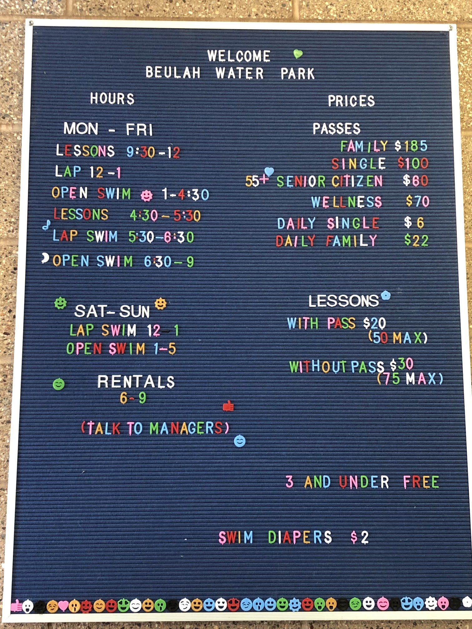 The kiddos love the slide and lazy river. They also offer concessions, and mom's favorite part is that if the kids go to the early session of open swim (1-4), they don't have to pay additional to attend the late session (630-9). The staff seems friendly and caring, also- sometimes high schoolers can be 'less than professional' (to put it nicely) but this crew so far this summer has been pretty darn good!!