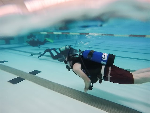 Eight-lane 50-meter pool with a diving well and slides, plus scuba and swimming classes.