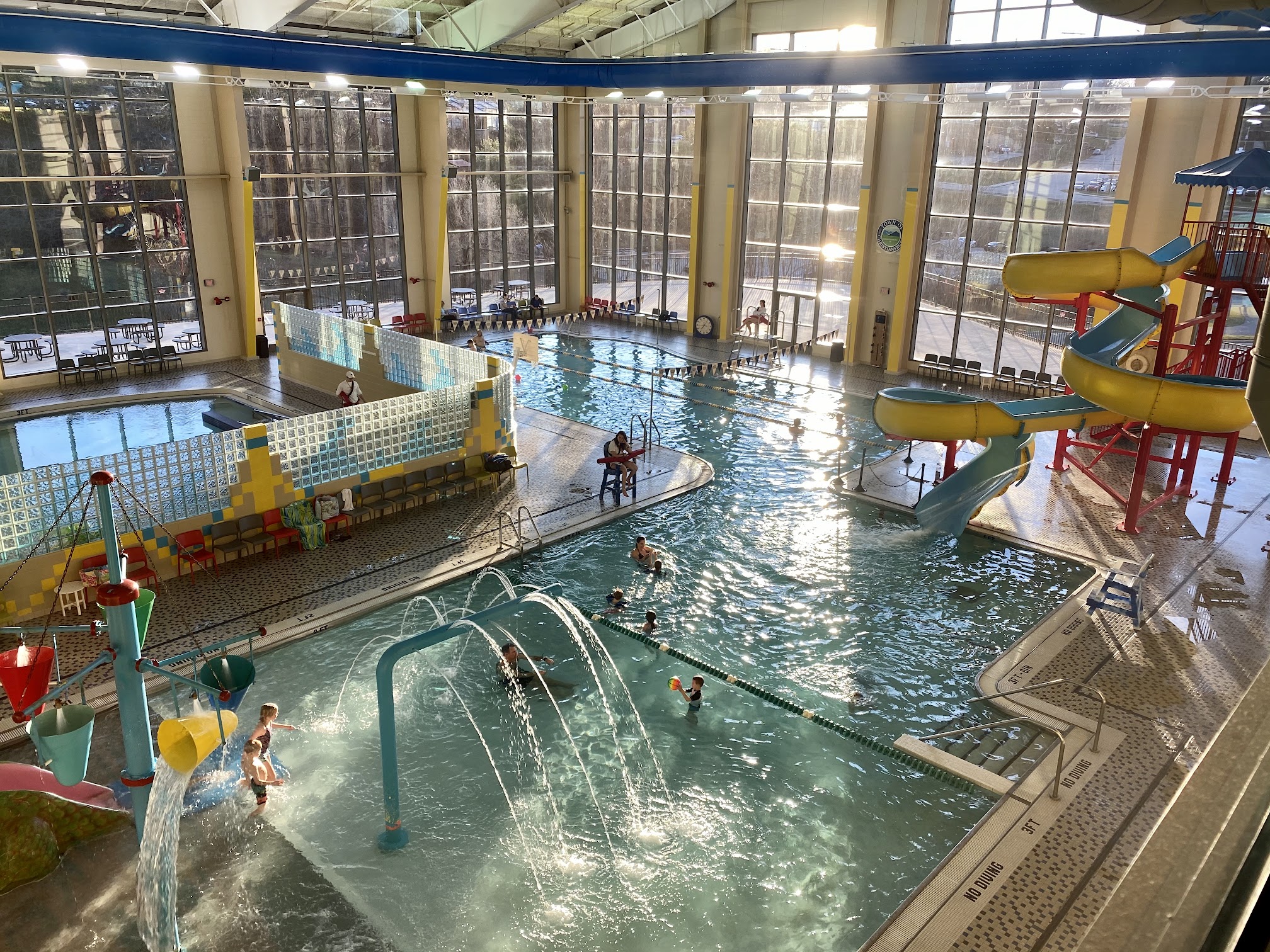Relaxed indoor facility featuring a leisure pool, competition pool and therapy pool, plus a waterpark for kids.