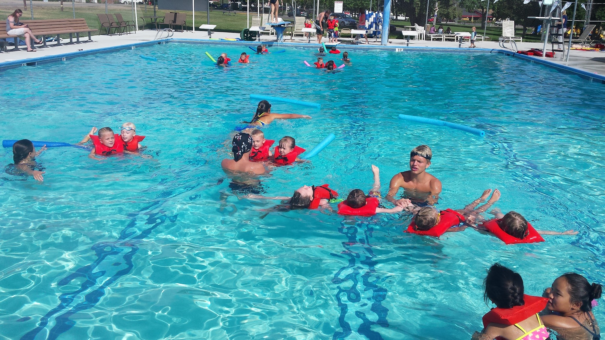 Public pool with a diving board offering swim lessons for children.