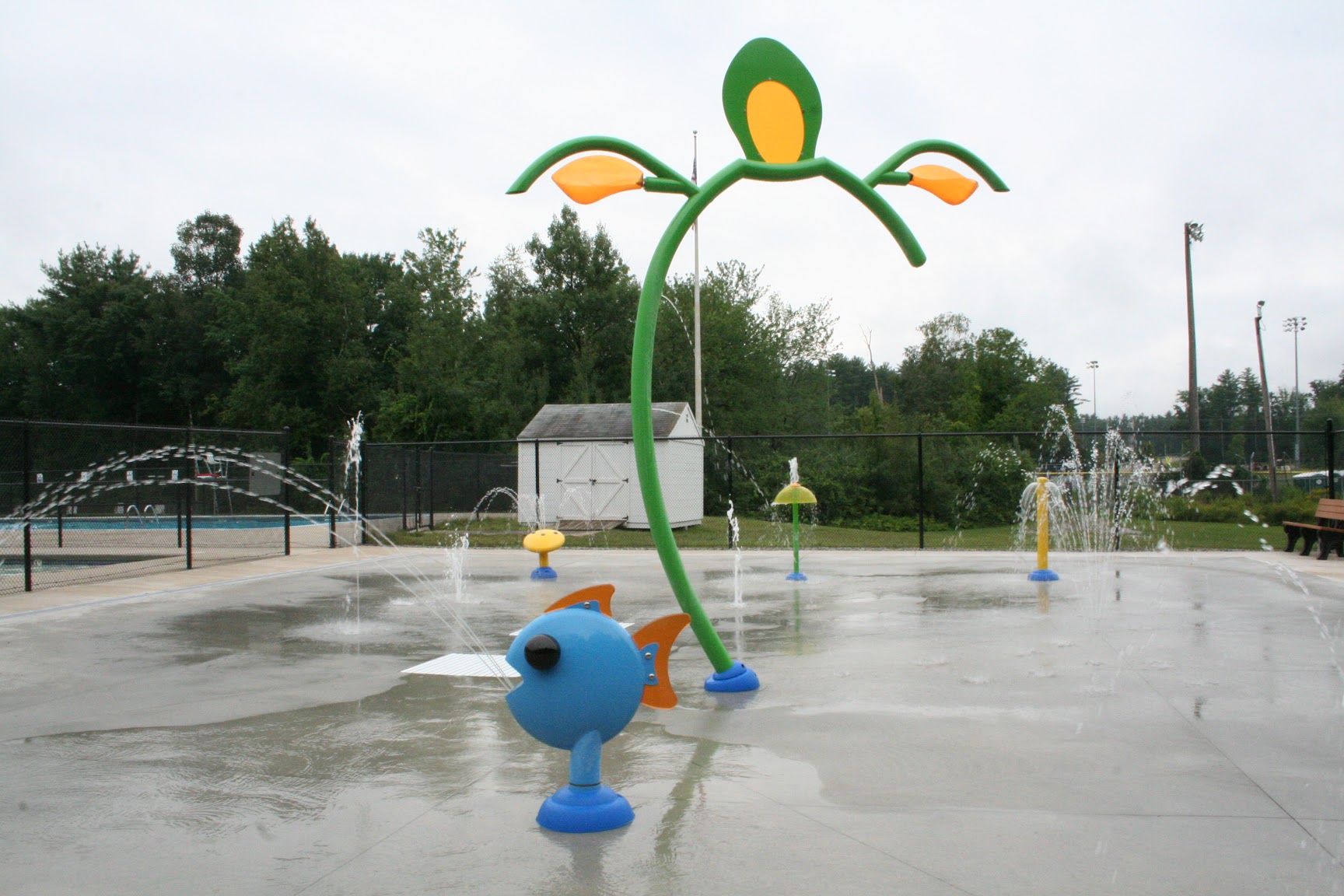 Playful venue featuring a splash pad with water spouts and a playground, as well as shaded picnic tables.