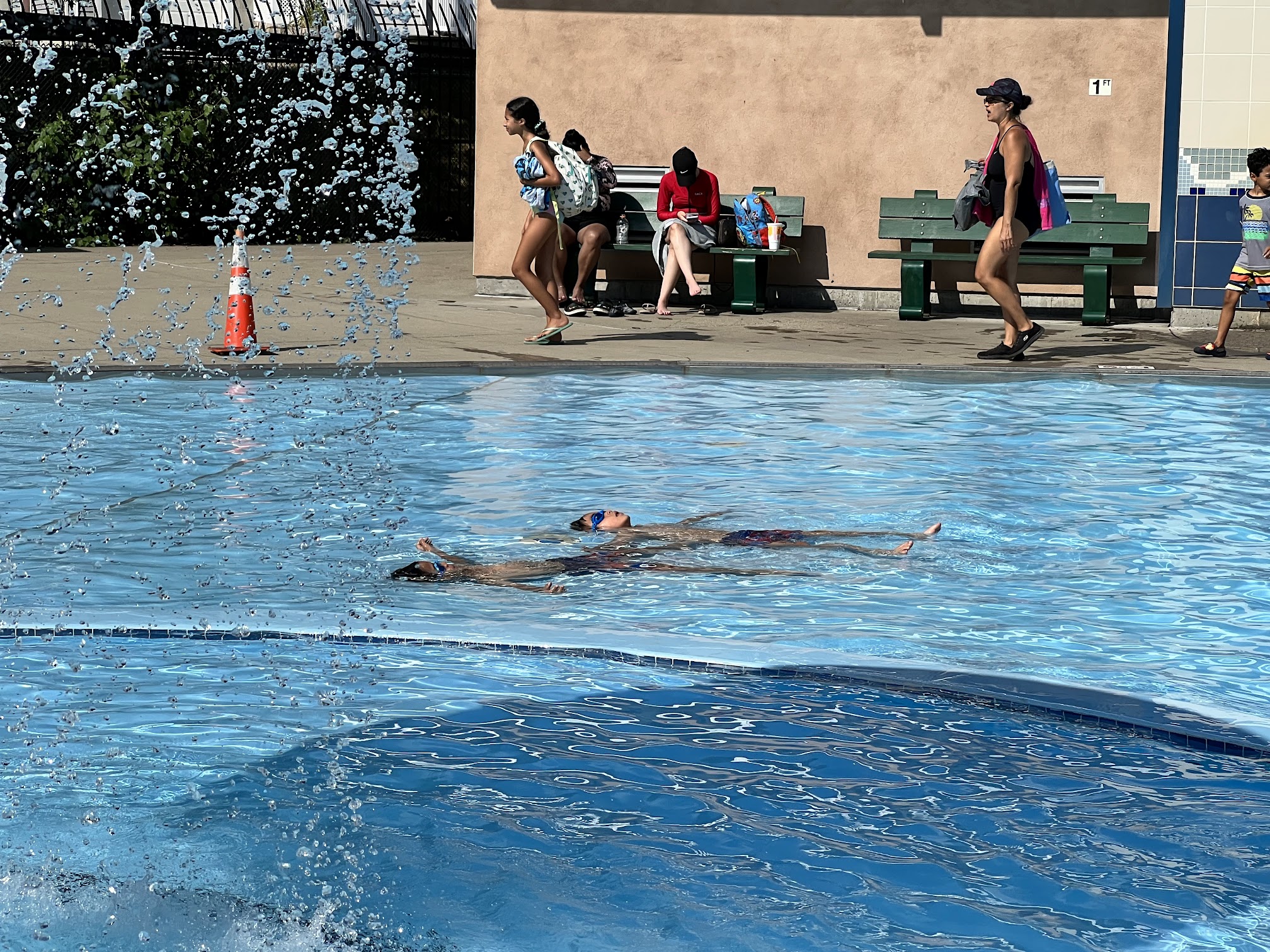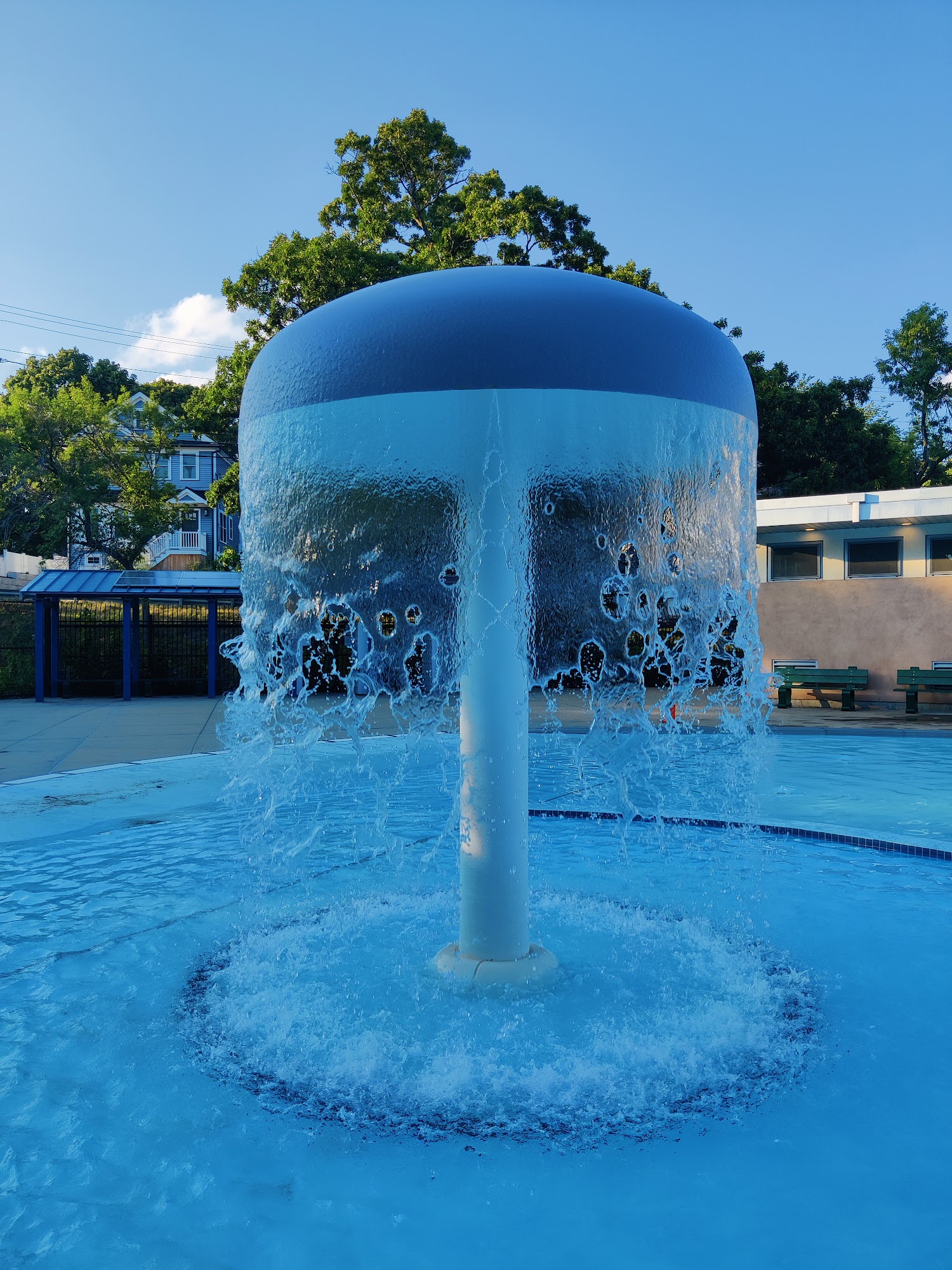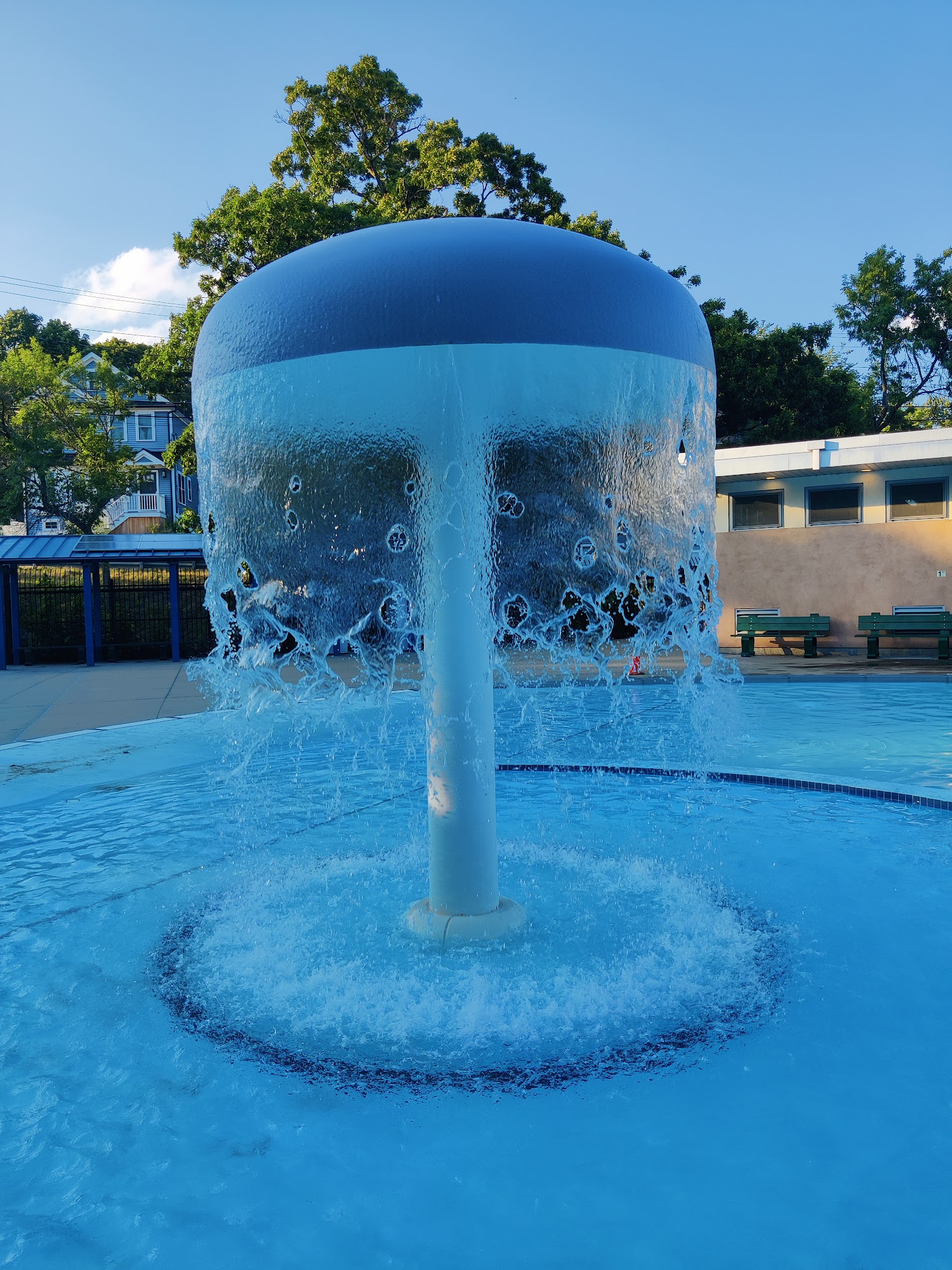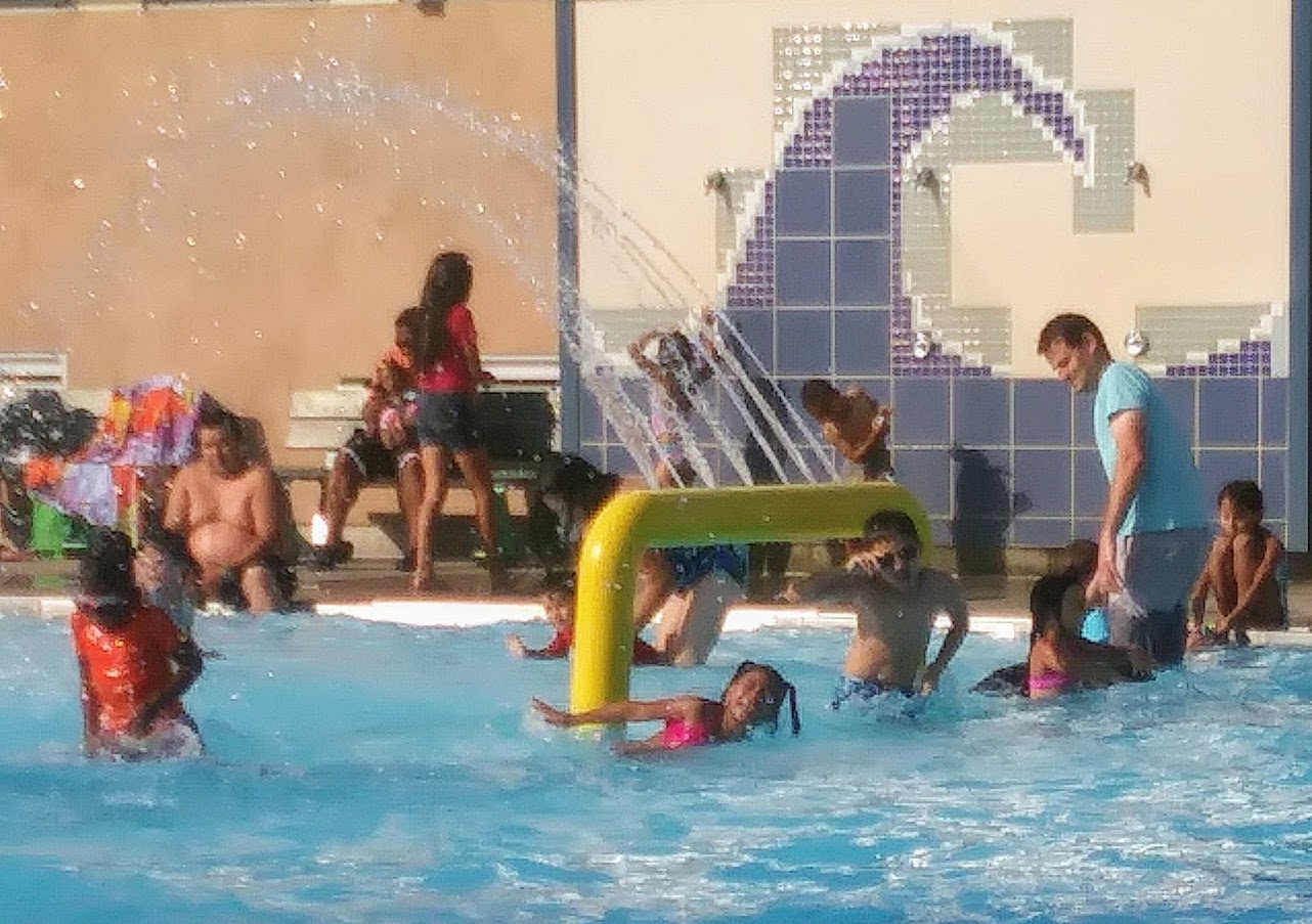 Public pool featuring a zero-entry area for toddlers as well as lifeguards and fountains, plus showers.