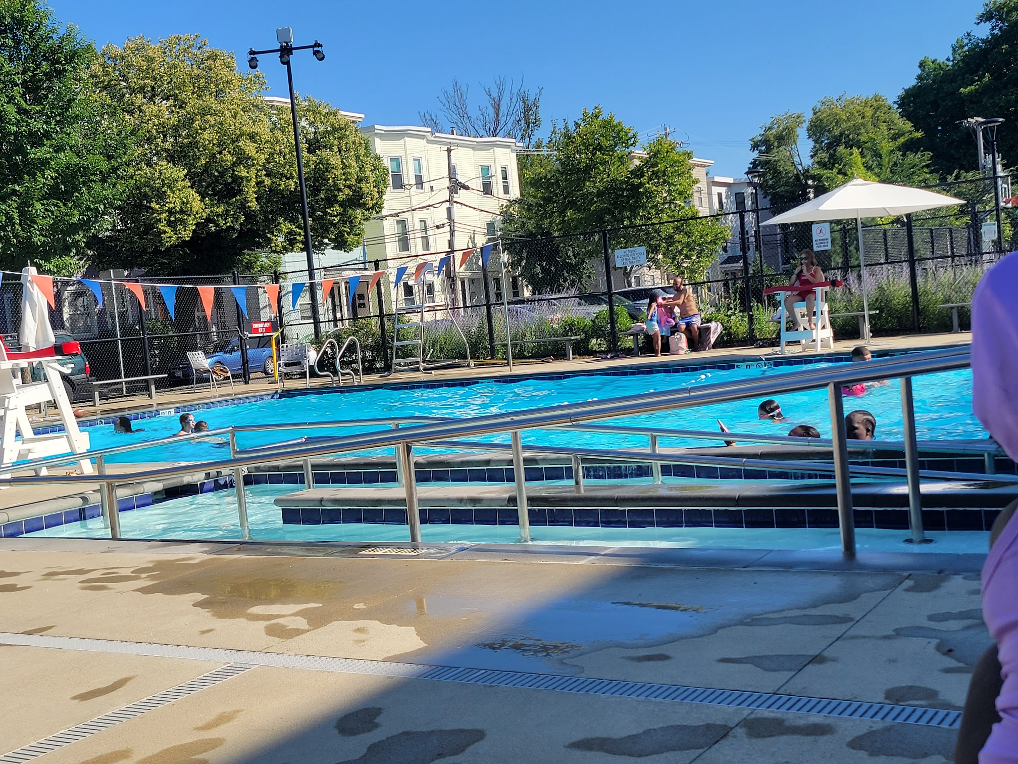 This is not the place to swim laps, but it's a lovely pool for families. There's a pool that goes from 1ft to 3.5ft for the younger kids with a life guard, and a pool that starts at 3.5ft and goes to I believe 11ft deep for stronger swimmers. For adults who prefer to watch than swim, there are loungers you can move around to catch or avoid the sun (easier in the afternoon when the sun is at the right angle). There are MANY children here so expect a boisterous vibe. It's restricted to Cambridge residents--you will need an ID, but it's free for residents. Note that it's attached to a school so I believe it's open from the first day of Summer (6/22) until labor day. Usually open from a little past 11 to 7pm.