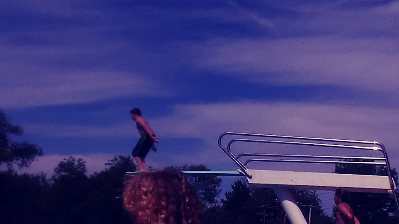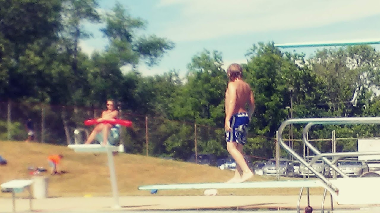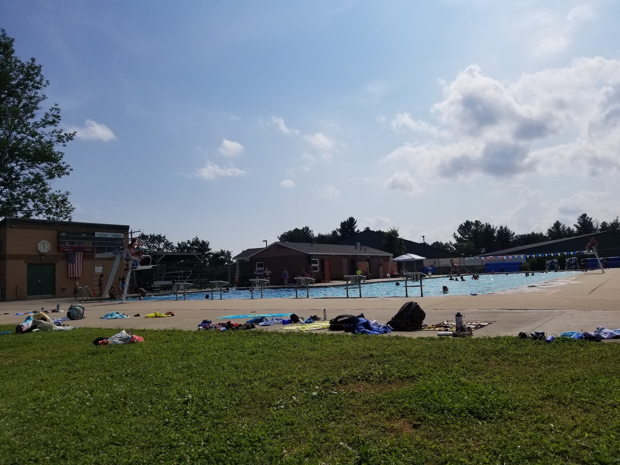 Public swimming facility featuring an outdoor pool, a diving well and a hot-weather cooling-off station.
