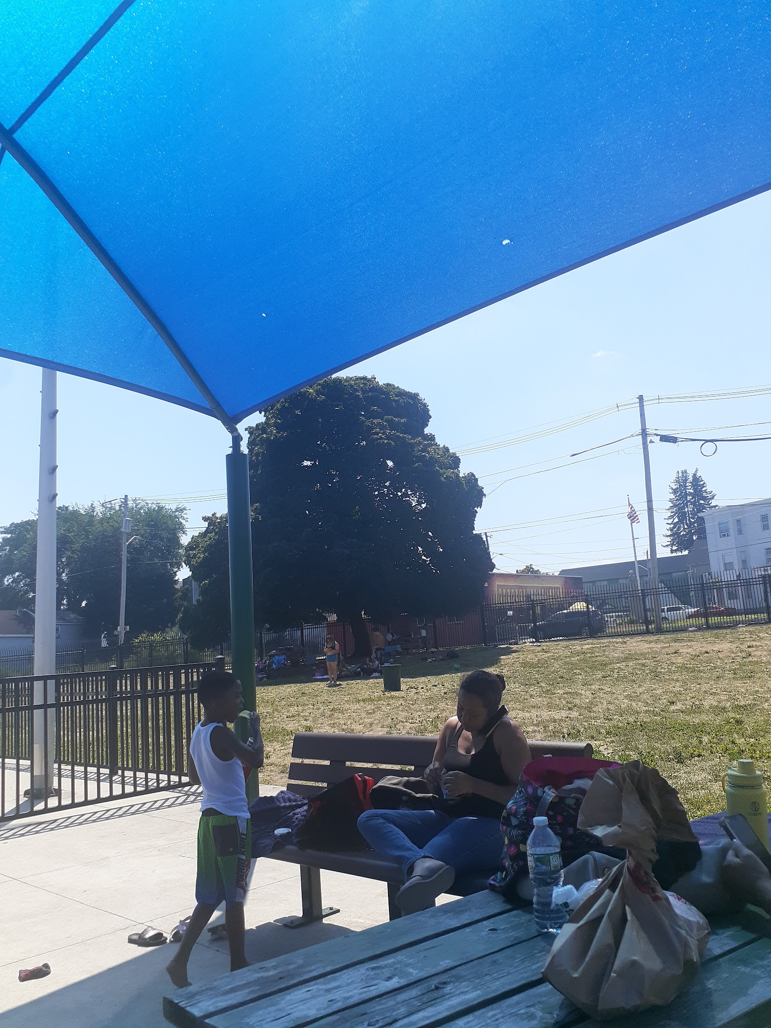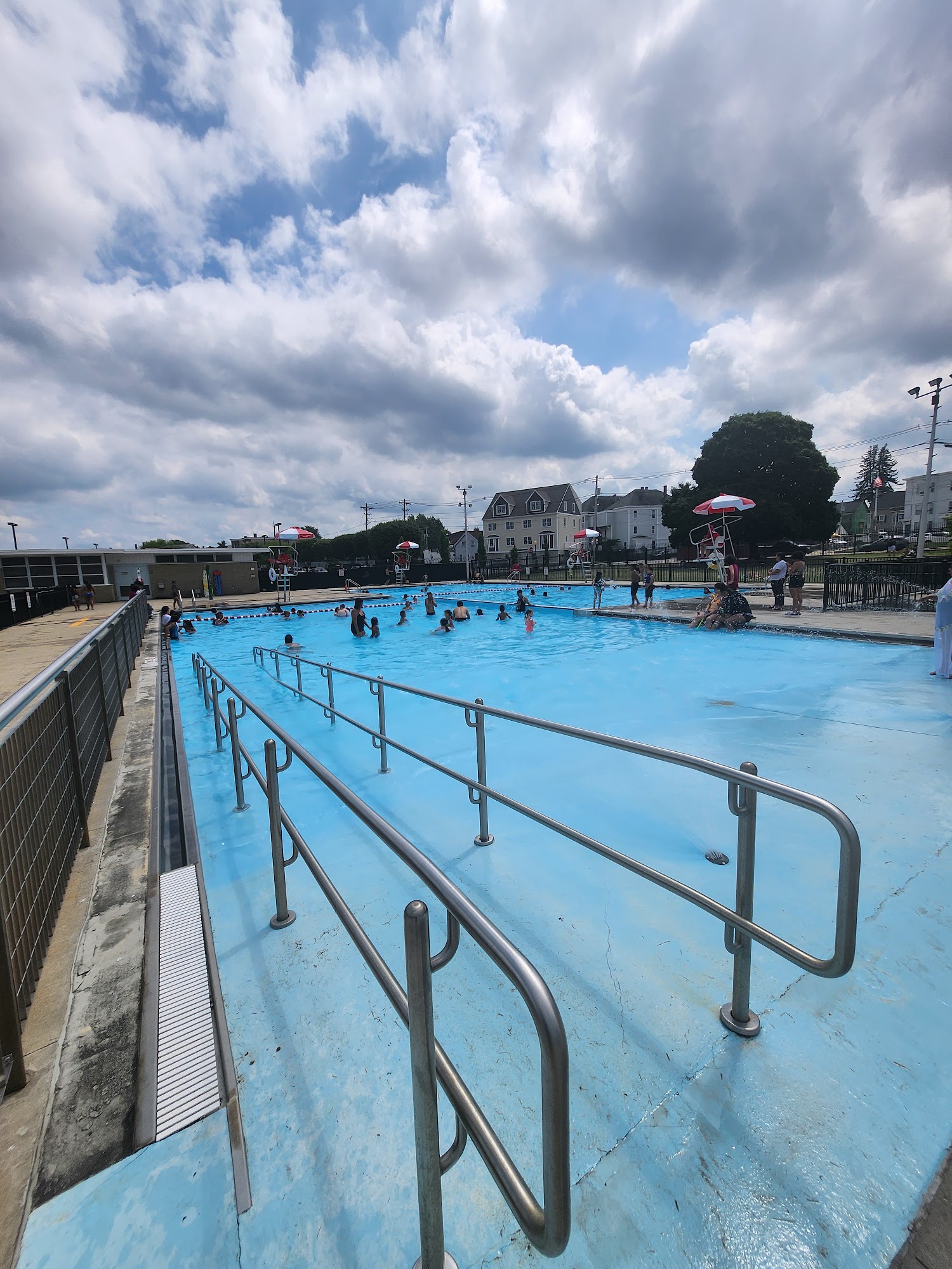 This was my first time going to a public pool in lowell. we got there right after opening at 12 noon. There was parking. The bathroom was clean it had automatic flush toilet and hand dryers. There are no curtains on the changing stalls not sure why that needs to be fixed. Plenty of showers. There is a splash pad next to the pool which I used with my toddler. The main pool was nice . The wade area perfect for little and non swimmers.There is a shaded tented area with tables and benches. You could also do picnic style on the grass right next to the pool. Plenty of life guards and they were nice young teens. We will be back.